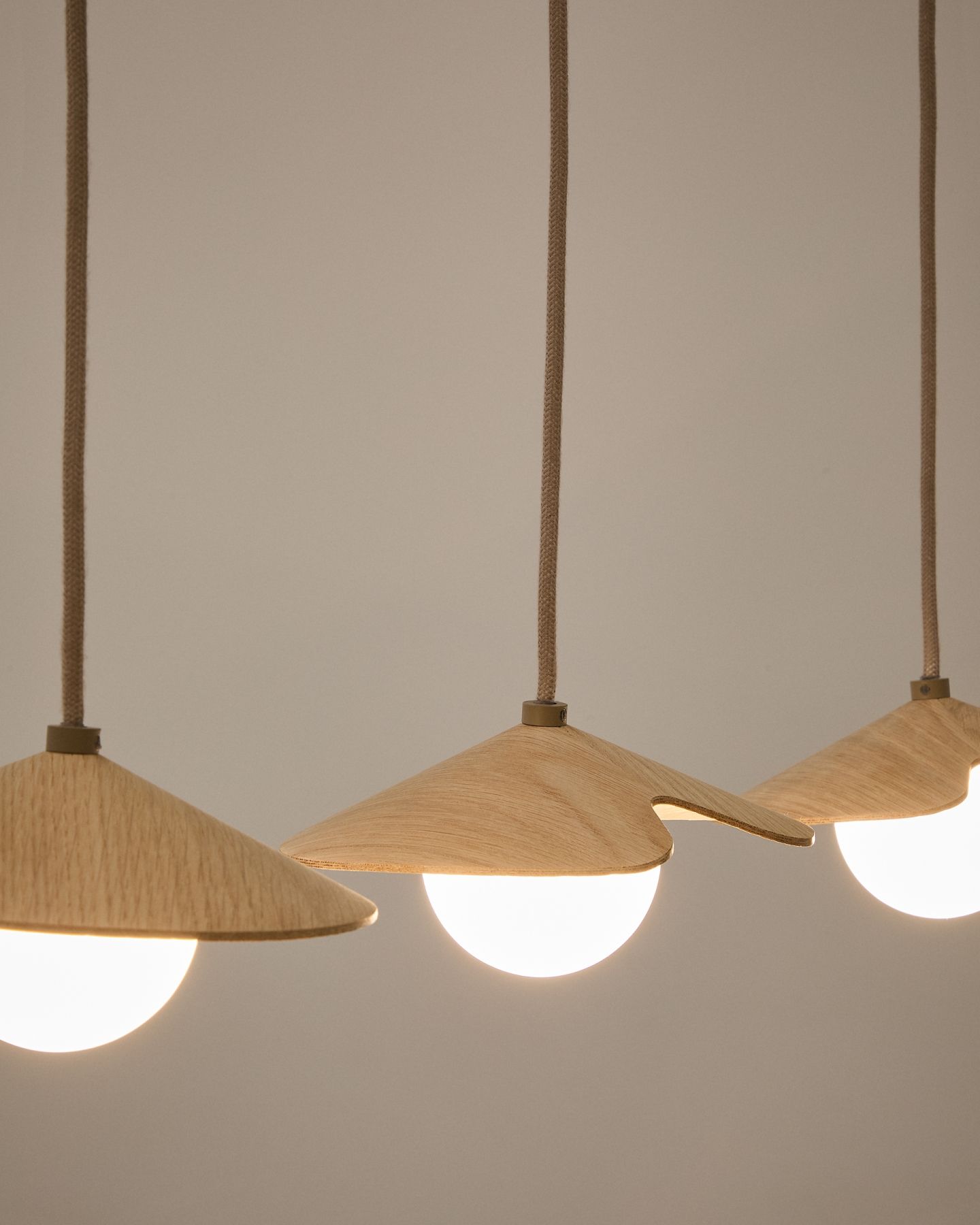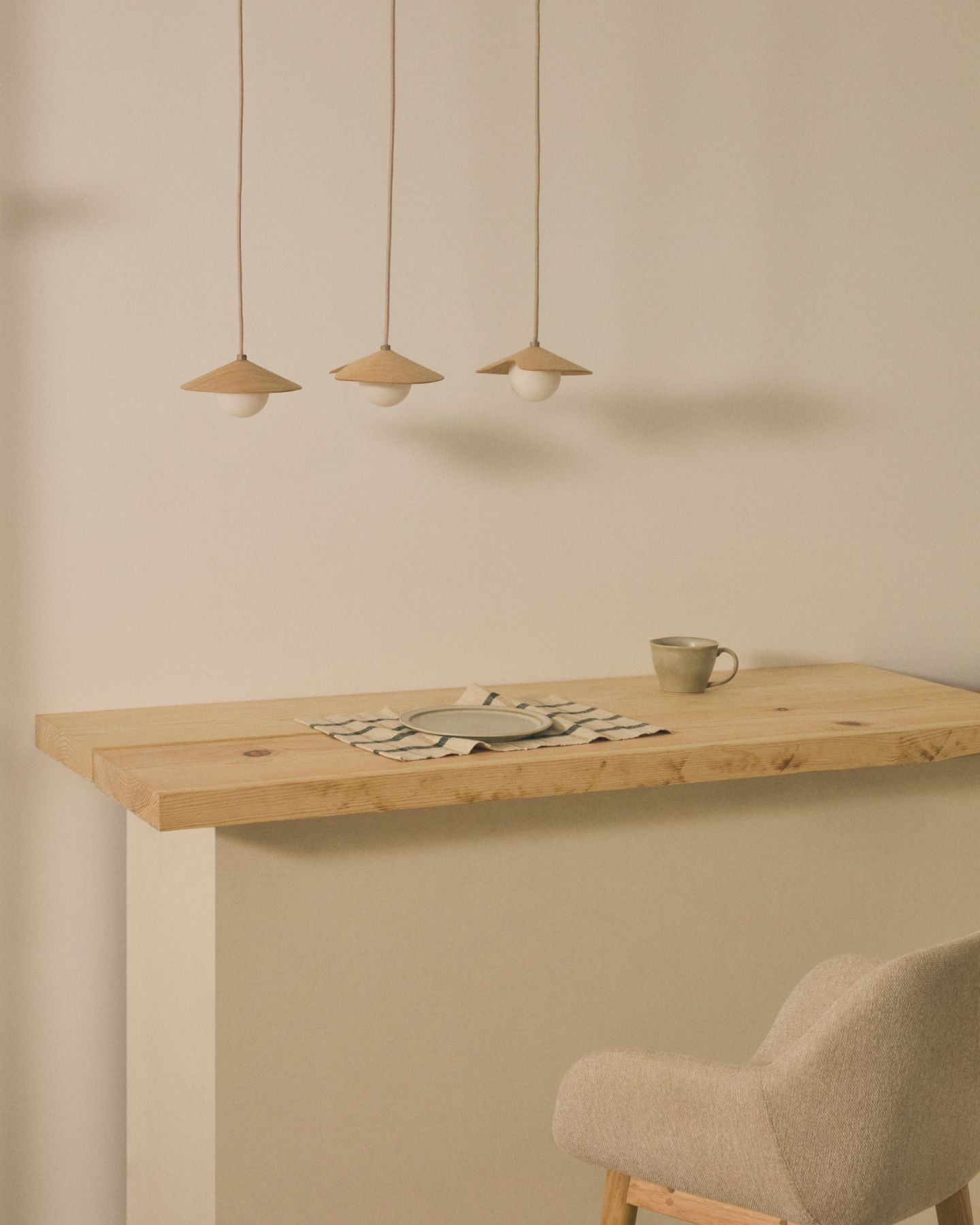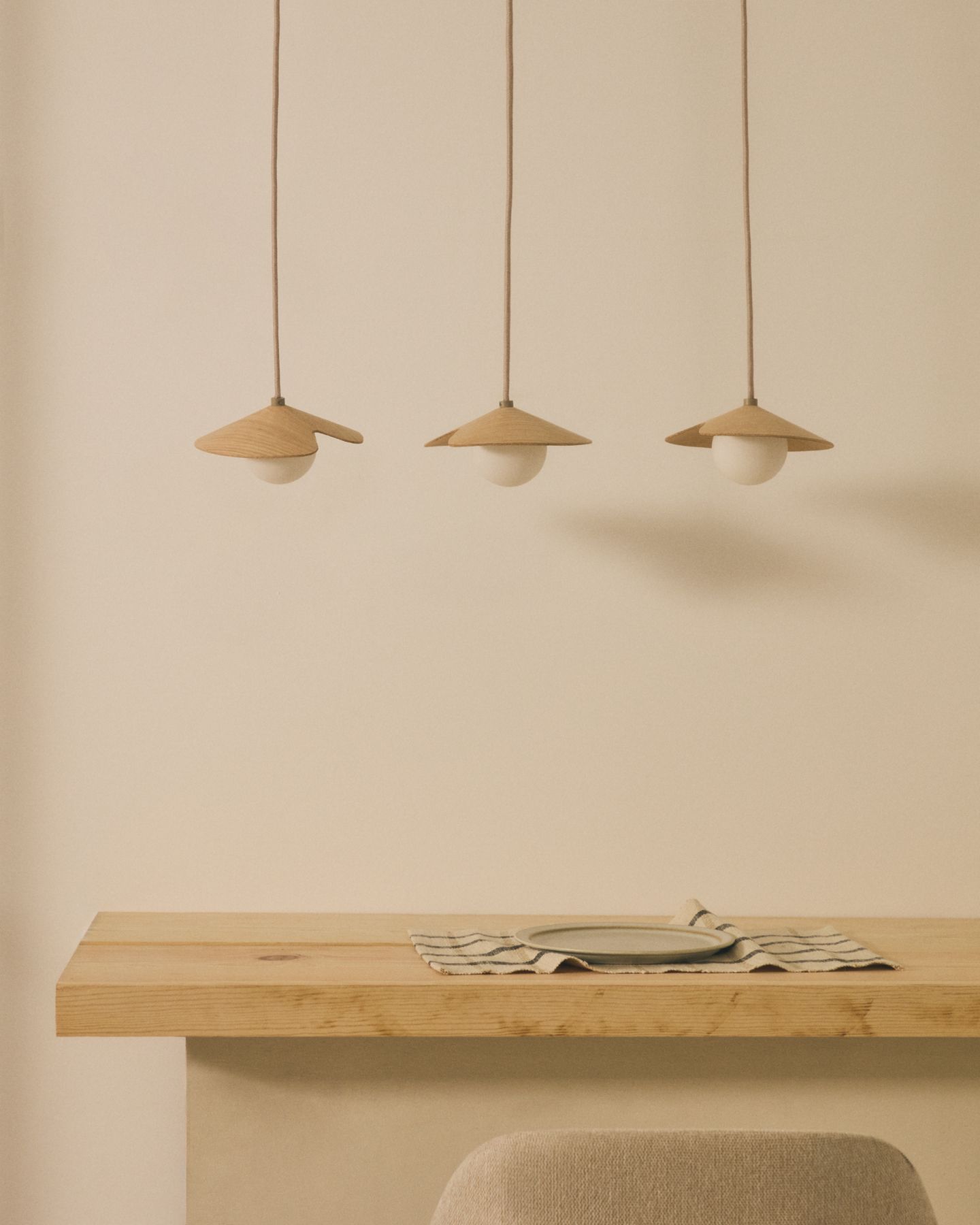 Откройте для себя естественную элегантность этой потолочной лампы, которая сочетает в себе теплоту дубового шпона и утончённость трёх белых сфер из дымчатого стекла, создавая неподвластный времени дизайн. Это изделие освещает и придаёт утончённость любому пространству, идеально подходя для тех, кто хочет привнести в свой интерьер нотку природы. Совместимая с лампами G9 мощностью до 3 Вт (продаются отдельно), эта лампа обеспечивает мягкое и эффективное освещение. Благодаря своей универсальности она легко сочетается с остальной коллекцией, создавая композиции, которые подчёркивают красоту интерьера. Эта лампа, идеально подходящая для тех, кто ценит современный дизайн, сочетает в себе эстетику и функциональность, добавляя уют и непревзойденный стиль в каждый уголок.