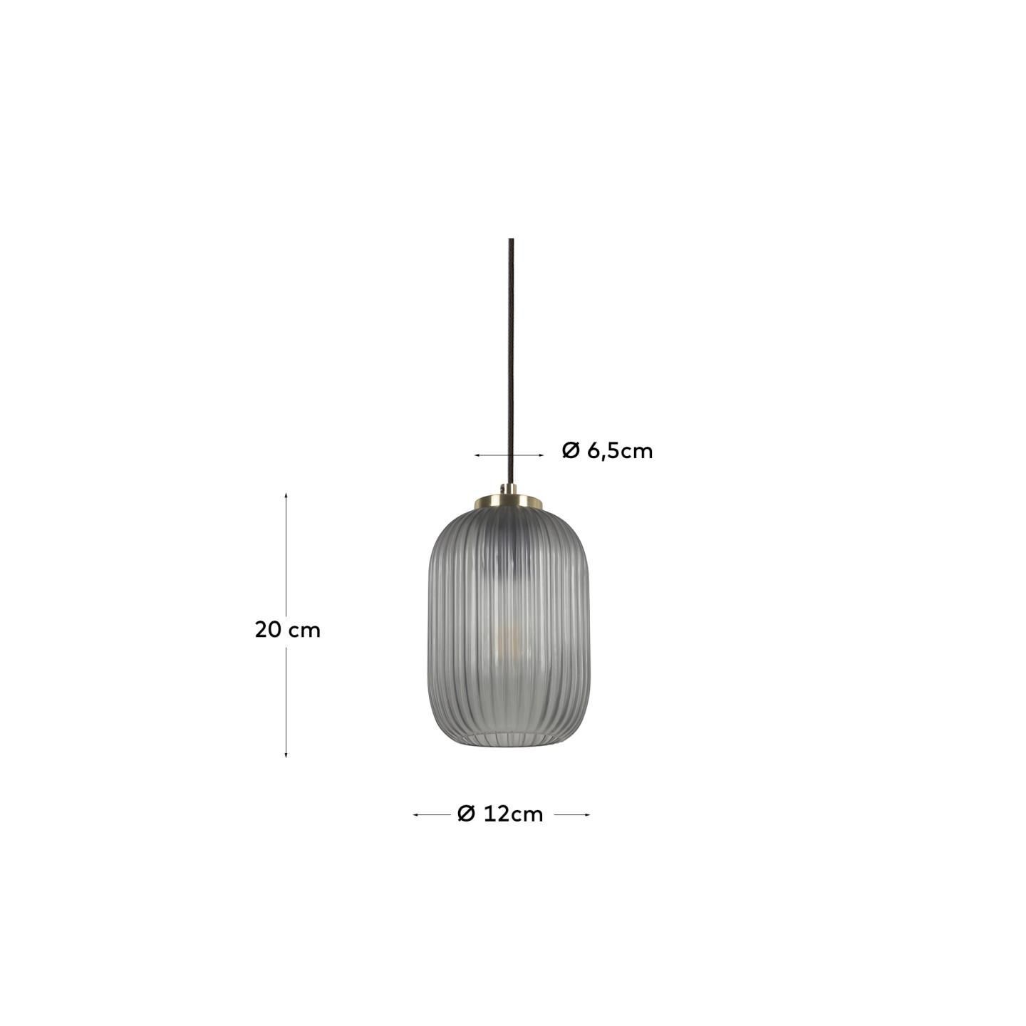 Потолочный светильник состоит из стеклянного абажура и круглого металлического основания. Абажур дымчатого цвета, с граненой фактурой. Его высота – 20 см, ширина – 12 см.