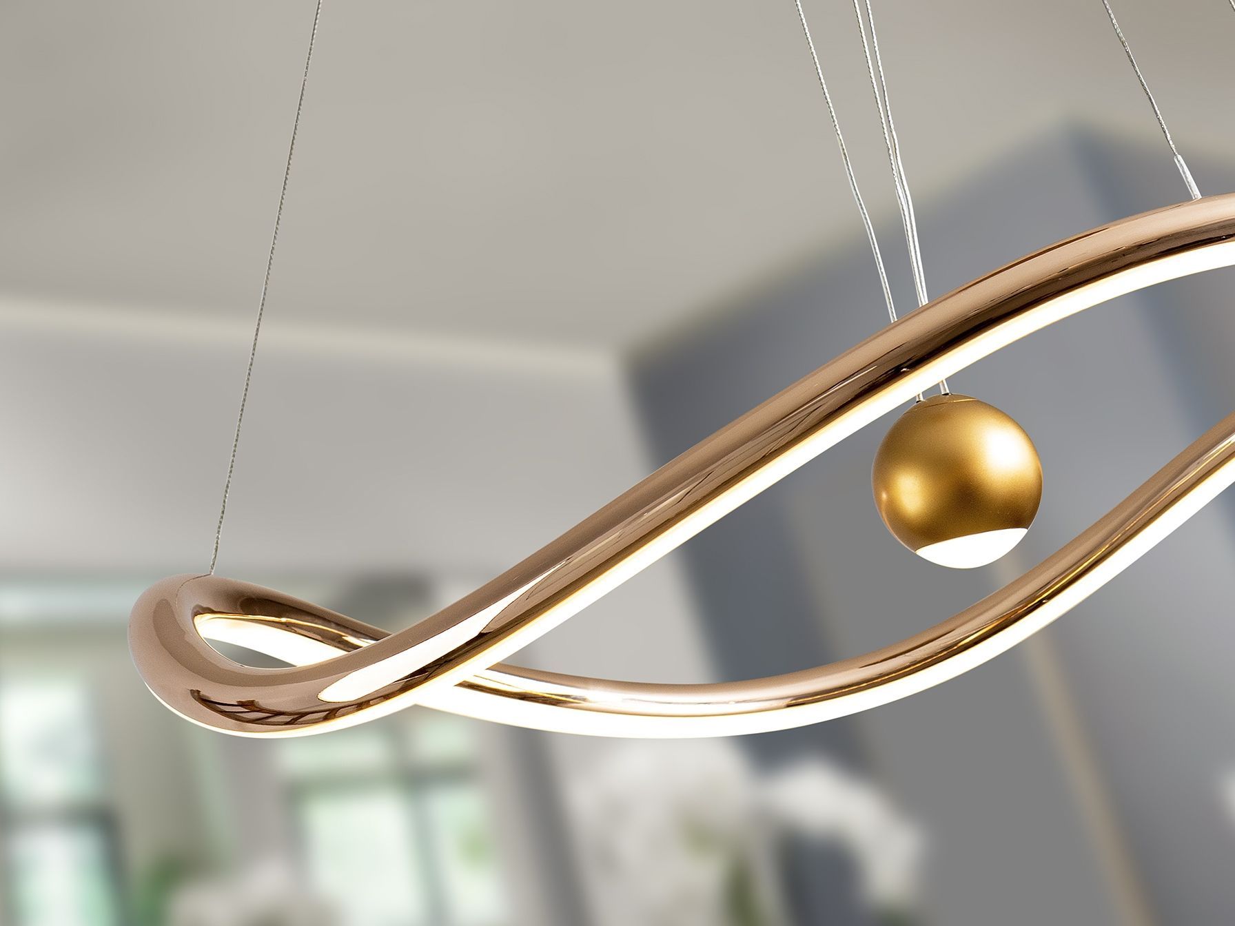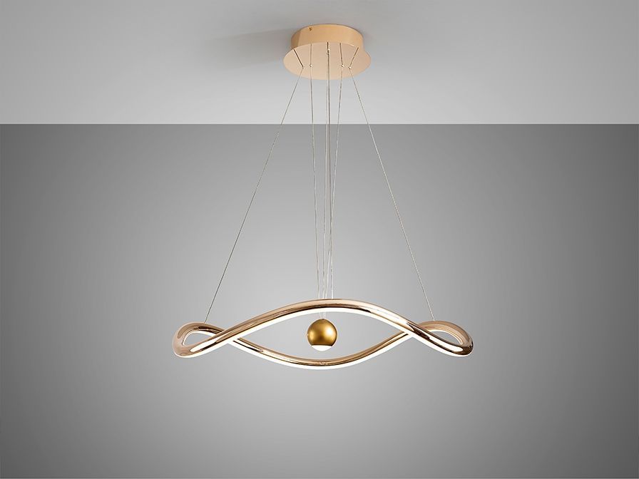 Лампа из алюминия и стали с блестящей золотой отделкой. Рассеиватель из опалового силикона. Высоту можно регулировать вручную, потянув за центральный шар. Светодиодное освещение 50 Вт, CCT: 2700-5000 K.3.100 лм. РЕГУЛИРУЕМАЯ ЯРКОСТЬ. В комплект входит пульт дистанционного управления