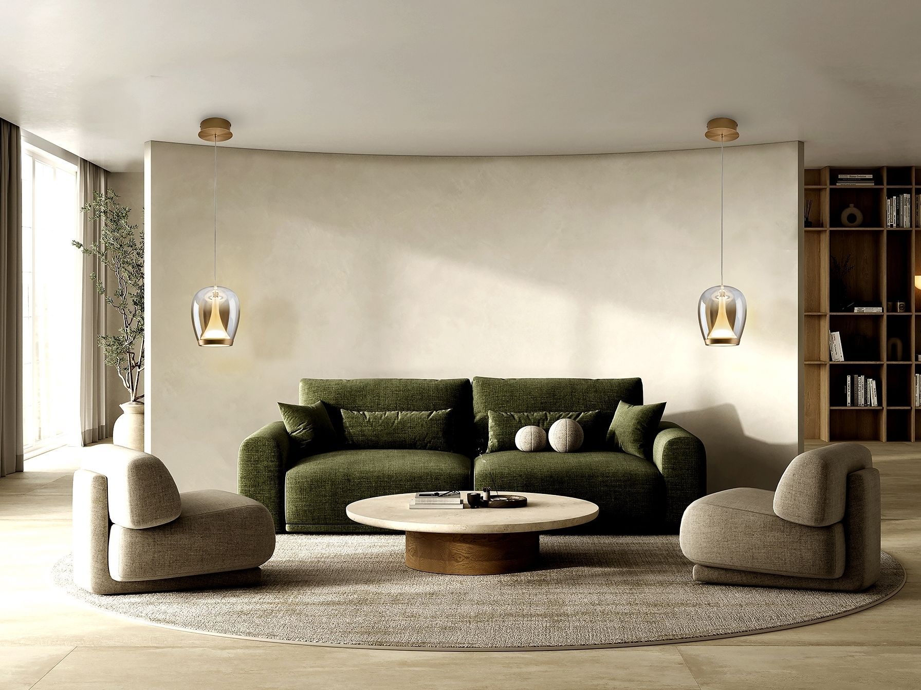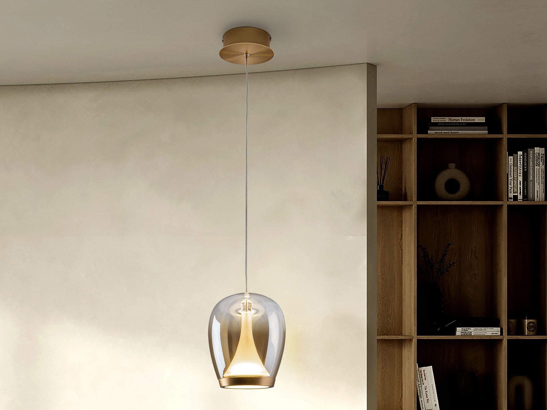 Лампа из анодированного золотистого алюминия с абажуром из выдувного стекла с градиентной янтарной отделкой и опаловым внутренним рассеивателем. Регулируется по высоте. Светодиод мощностью 8,5 Вт, 900 лм, 3000 К.