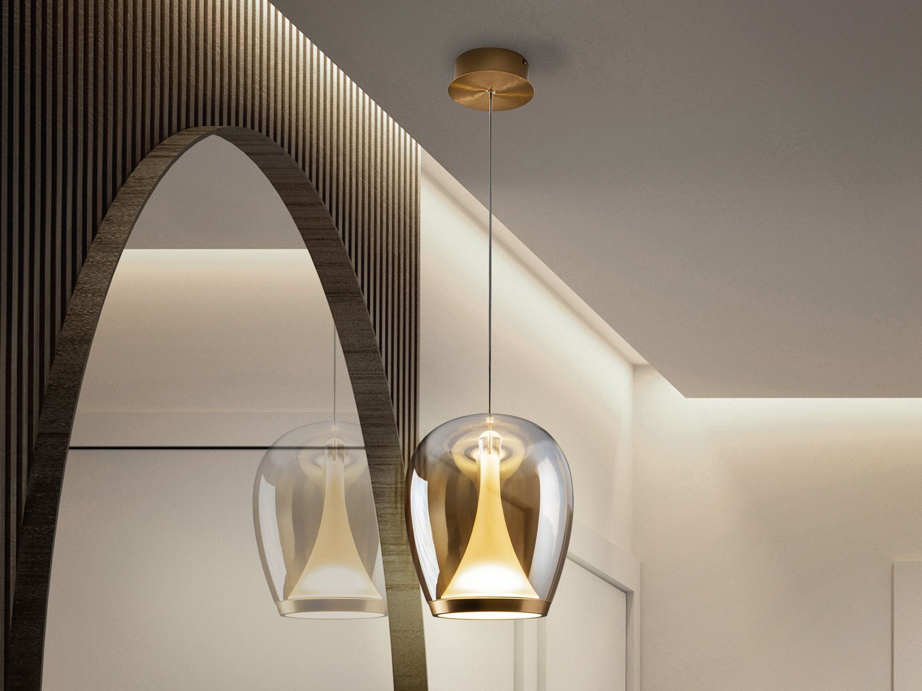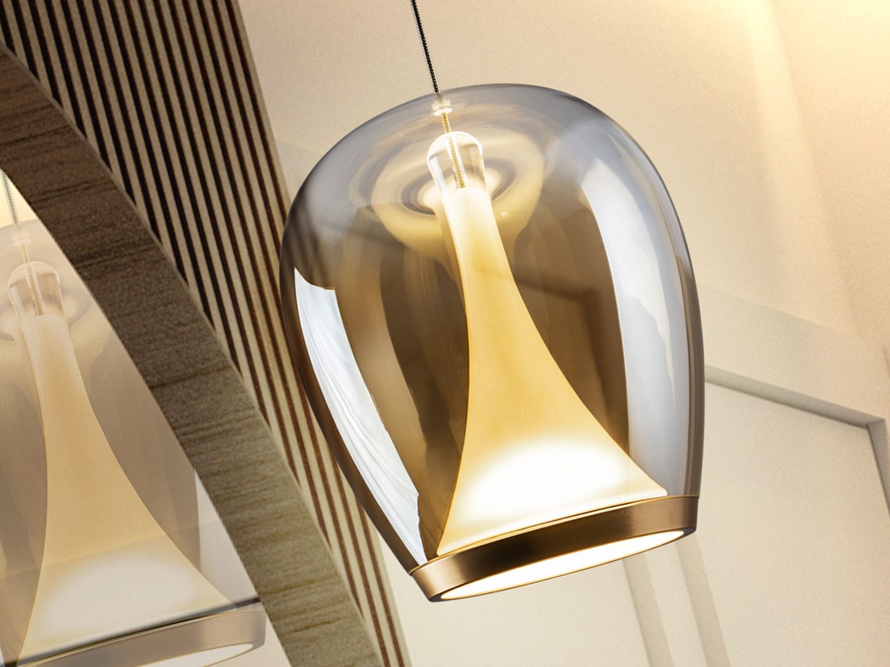 Лампа из анодированного золотистого алюминия с абажуром из выдувного стекла с градиентной янтарной отделкой и опаловым внутренним рассеивателем. Регулируется по высоте. Светодиод 20 Вт, 1200 лм, 3000 К.