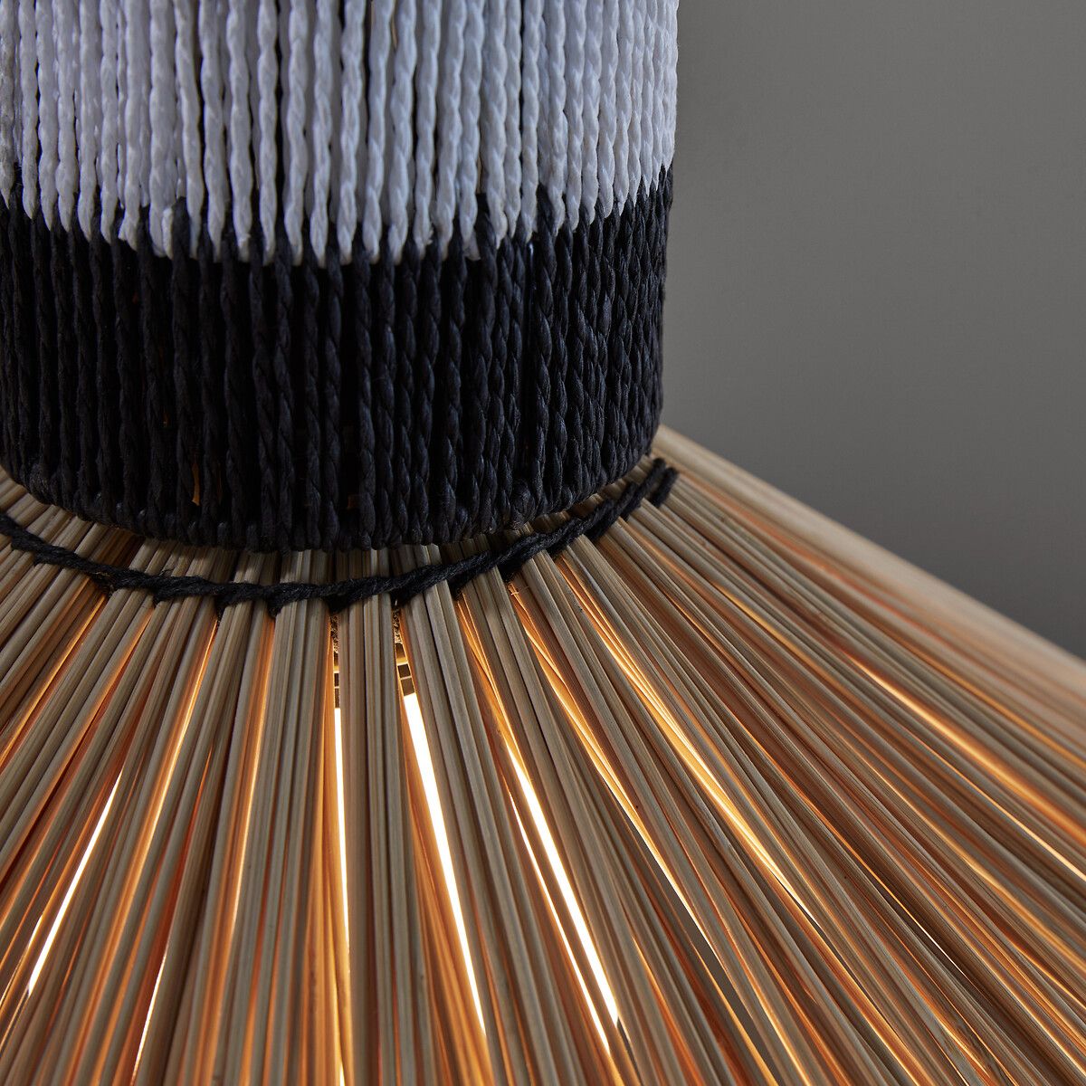 Плетеные корзины разных размеров с абажурами из ротанга, натурального бамбука или черно-белой бумажной веревки наложены друг на друга и создают уникальные изделия.