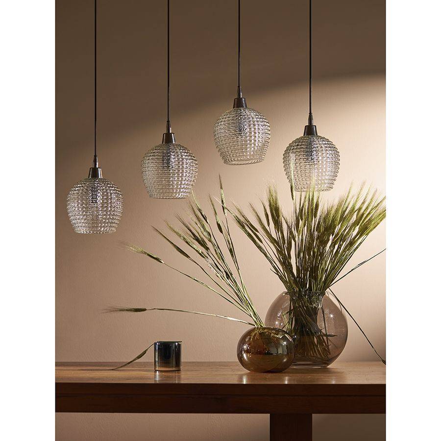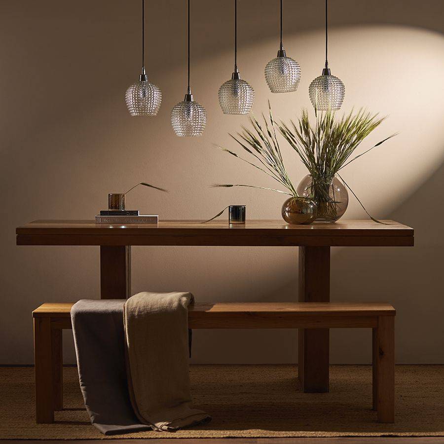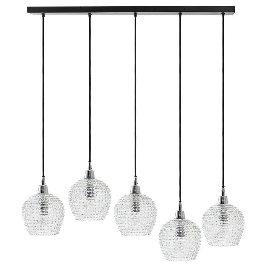 Материалы: стекло, железо. Размеры: 110х18х150 см. Цвет: прозрачный. Длина провода: 1,1 м, 1,3 м, 1,5 м. Тип цоколя: 5хЕ27. Максимальная мощность ламп: 5х25 Вт. Степень пылевлагозащиты: IP20. Площадь освещения: 8,5 кв.м. Лампы в комплекте: нет.