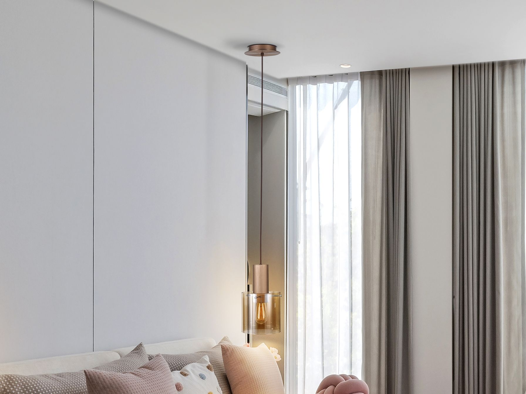 Лампа изготовлена из металла с покрытием из сатинированной меди. Абажур из янтарного стекла. Провод оплетён тканью. Регулируется по высоте. Патрон E27.
