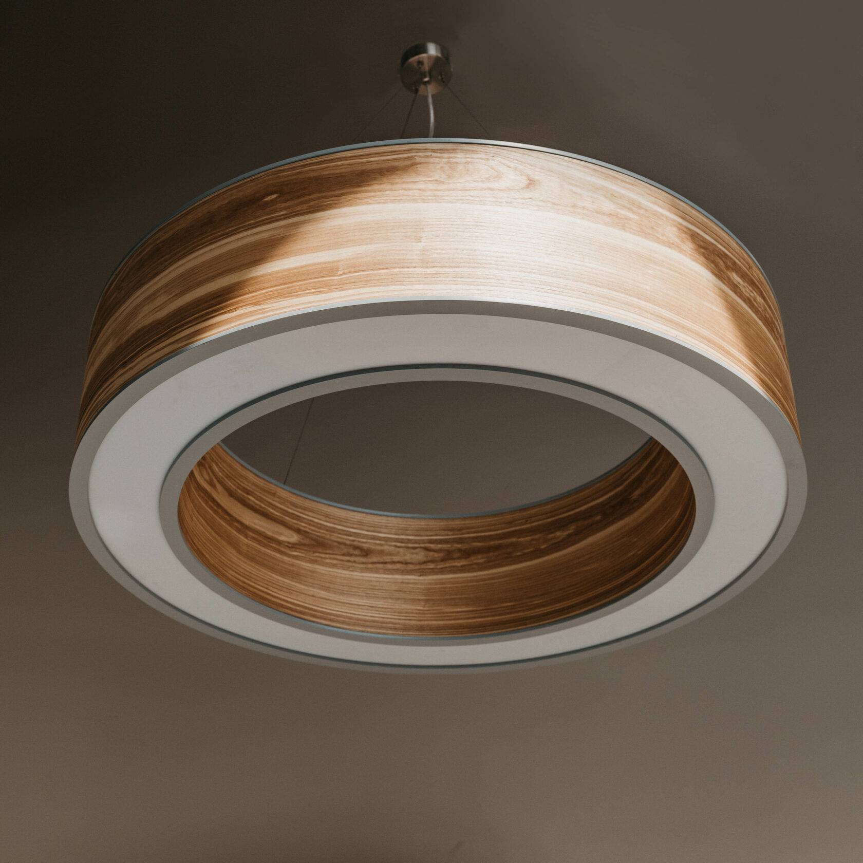 Светильник из натурального шпона дерева, который пропускает свет от лампочек. Подвесной светильник сделан в форме кольца и имеет несколько размеров. Данная модель, Jupiter Ring L, подходит для просторных помещений.