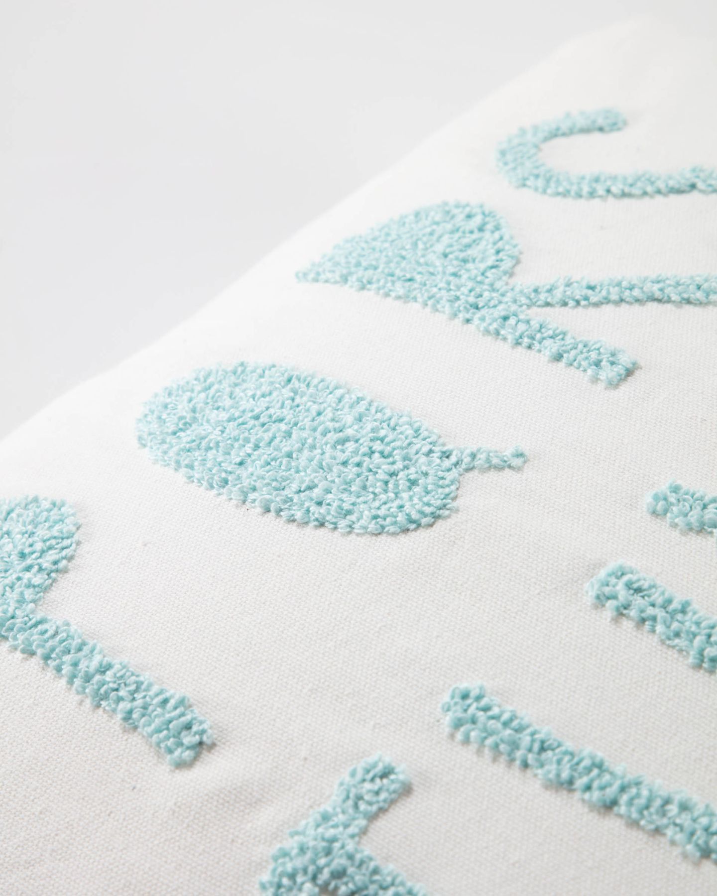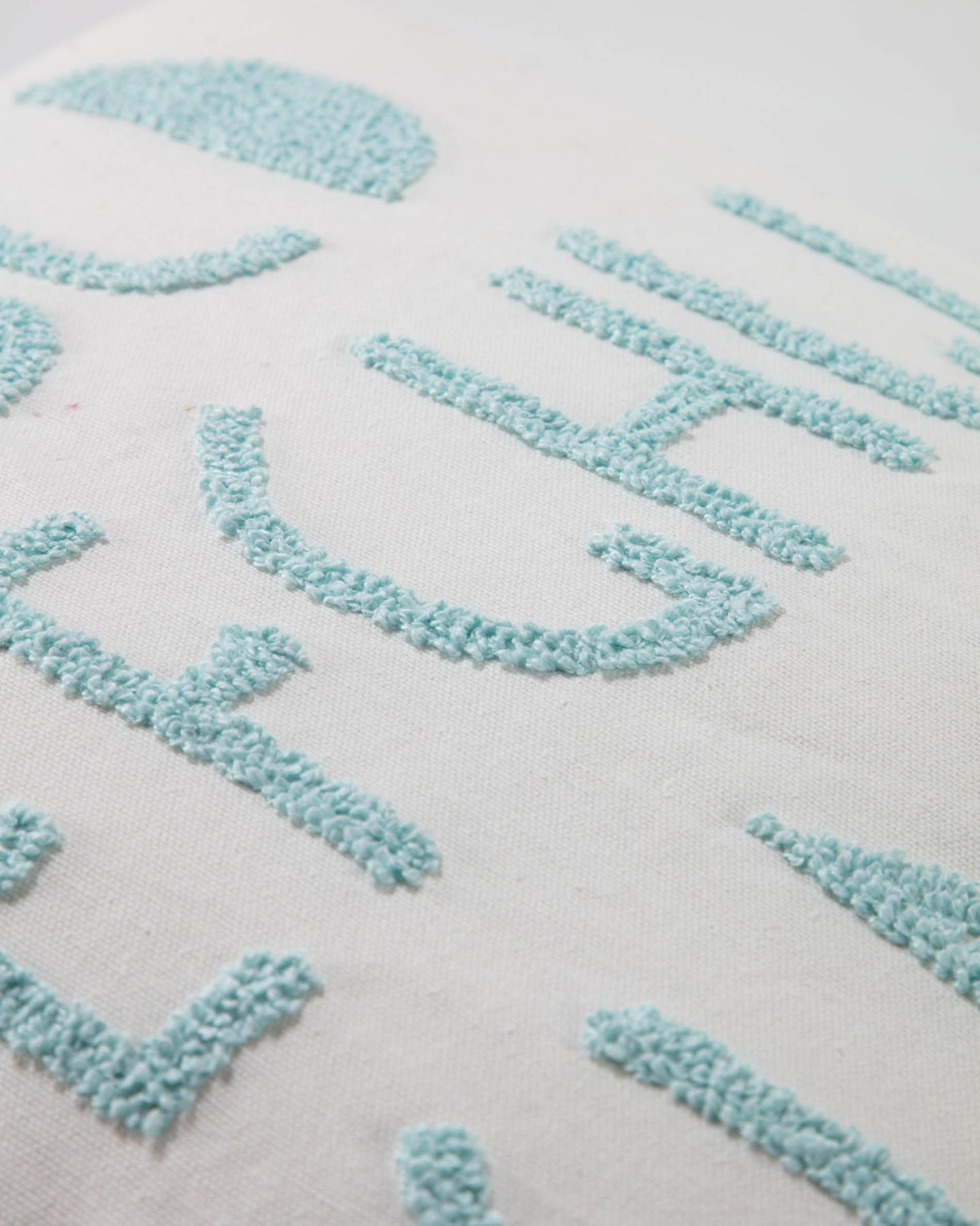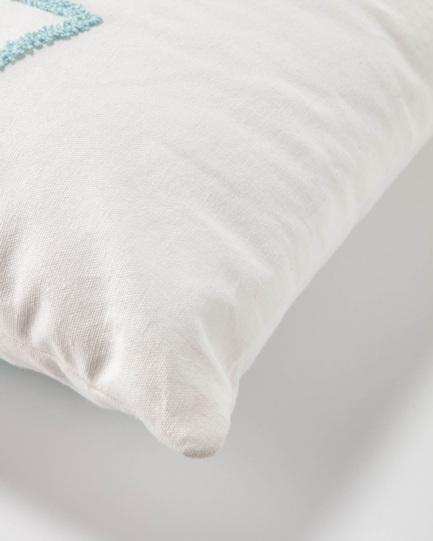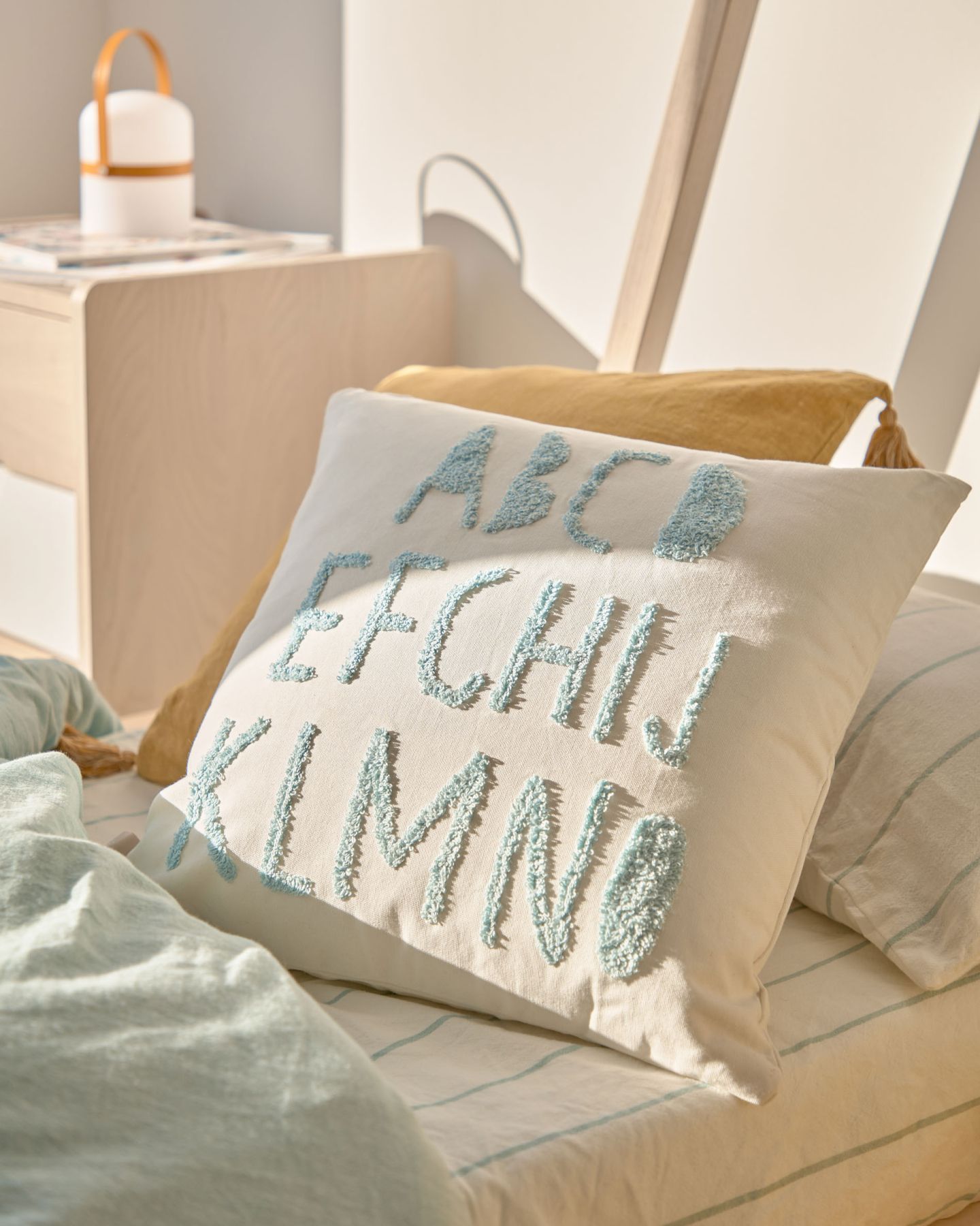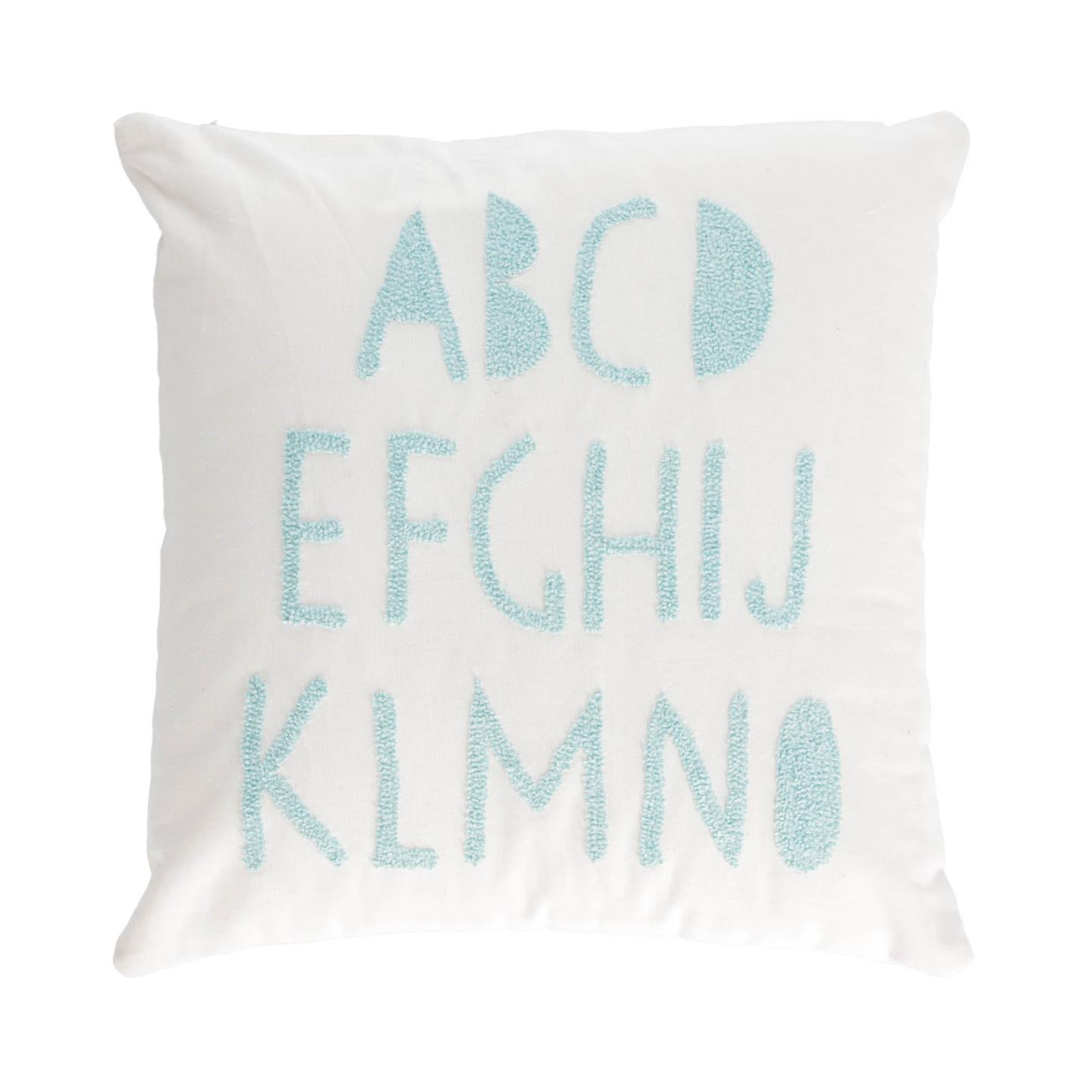 Наволочка Keila имеет квадратную форму. На лицевой стороне – набивной принт голубого цвета в виде букв английского алфавита. Высота ворса около 2 мм.