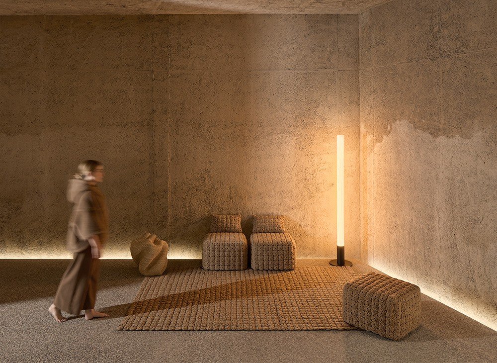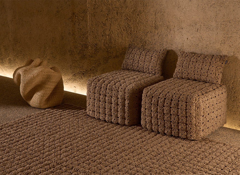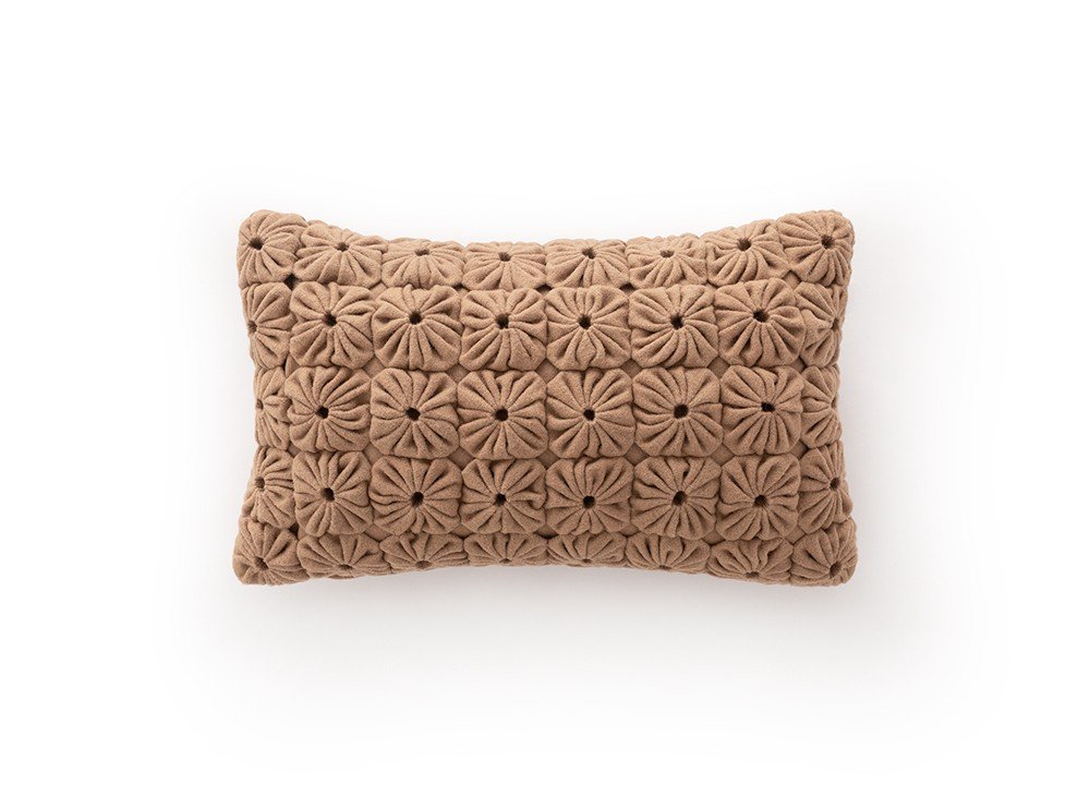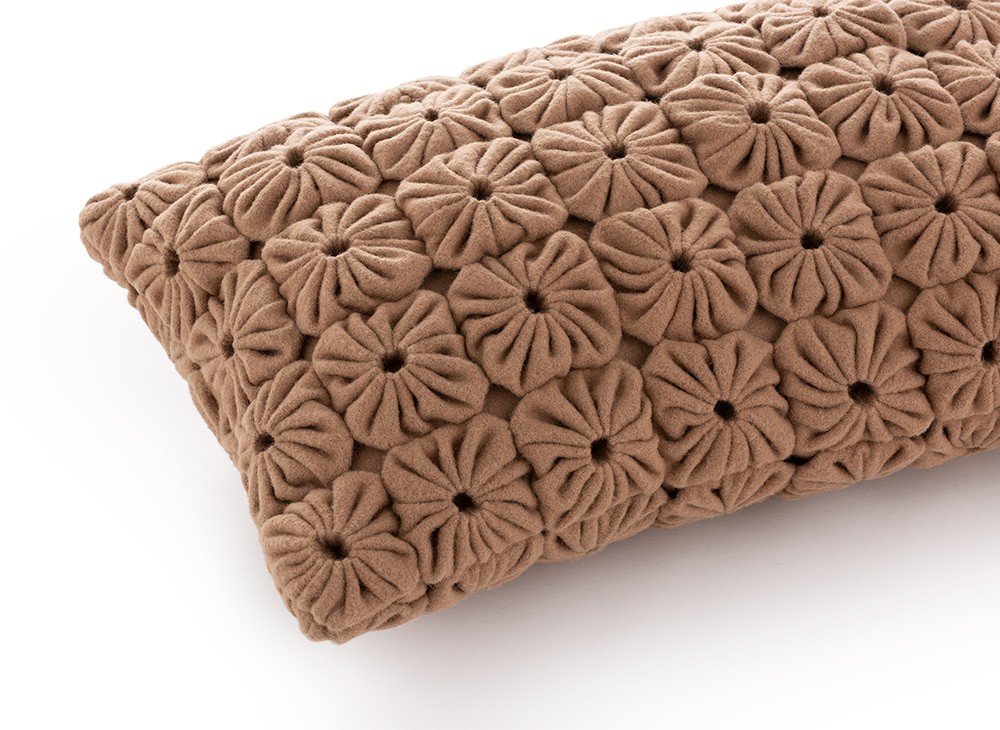 Подушка «Верблюжий» из коллекции Momos, дизайн со съемным чехлом от Хосе А. Гандиа-Бласко Каналеса, выполненная в нашей технике ручной вышивки, вдохновленной традиционными текстильными ремеслами северной Бразилии. Она сочетается с ковром и пуфом, создавая расслабленную и непринужденную атмосферу.