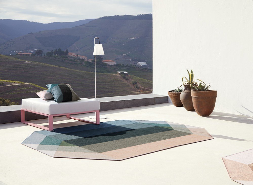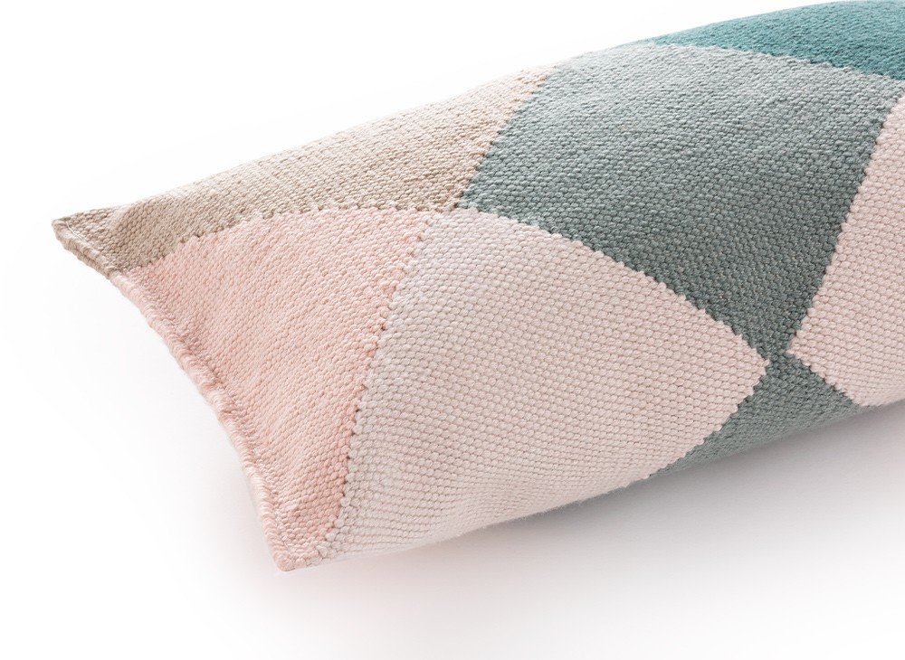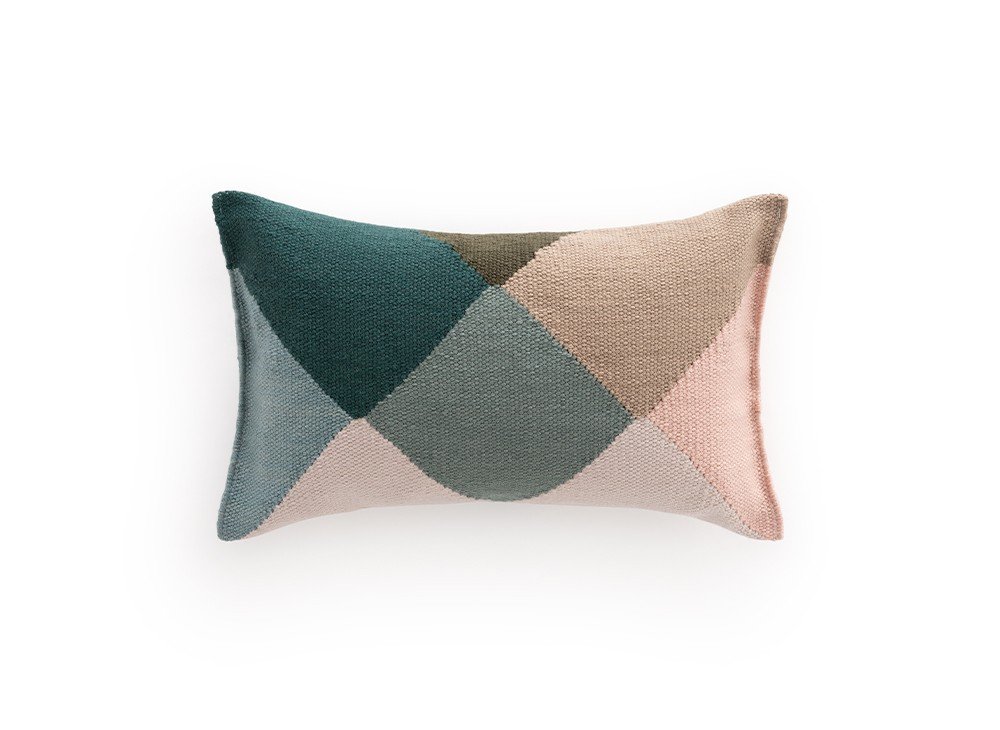 Это подушка Nude-Petrol из нашей коллекции Diamond. Геометрический дизайн размером 50x30 см, созданный Шарлоттой Ланселот и вдохновленный гранями бриллианта. Она соткана в технике килим из переработанных ПЭТ-волокон в оттенках зеленого, бежевого и розового. Подходит для использования в помещении и на открытом воздухе.