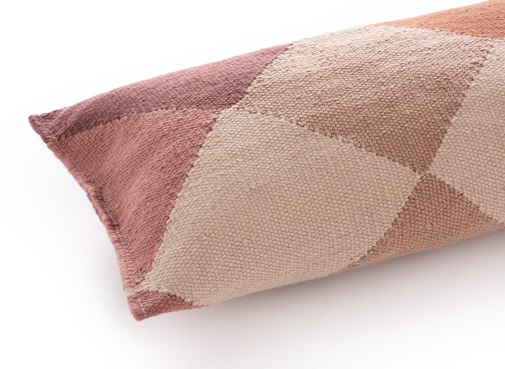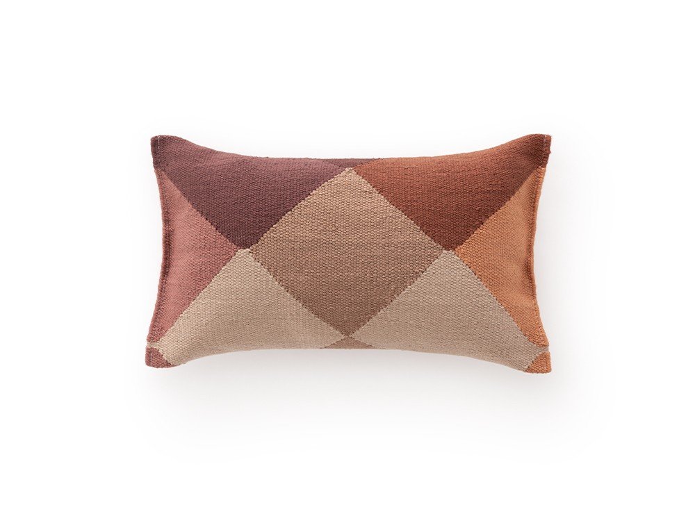 Подушка Diamond, модель Orange-Wine, размером 50x30 см, подходит как для использования в помещении, так и на открытом воздухе. Созданная Шарлоттой Ланселот, её геометрический узор вдохновлён гранями бриллианта. Она изготовлена вручную в технике килим из волокон переработанного ПЭТ красного и оранжевого оттенков.