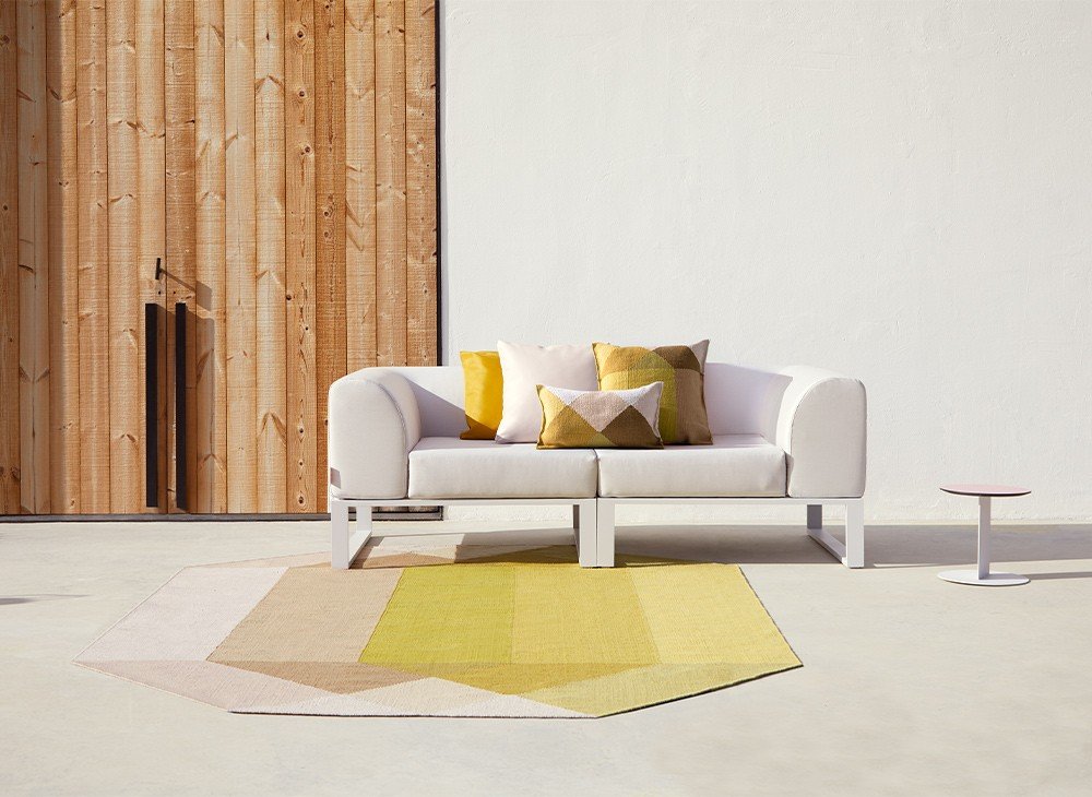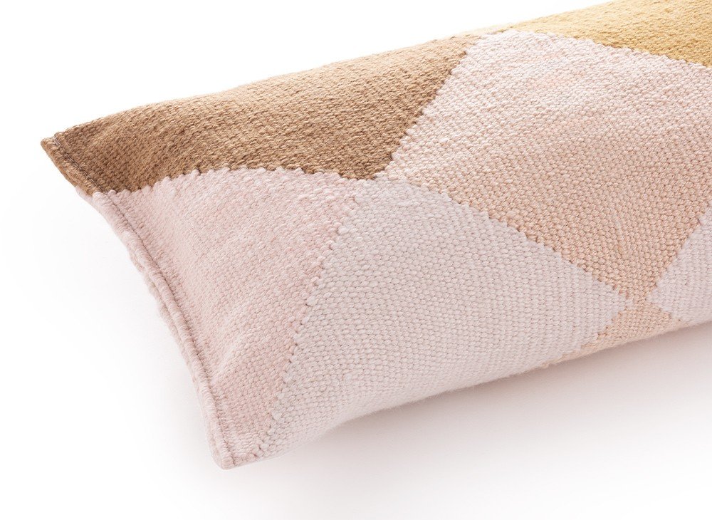 Это подушка Diamond Pink-Yellow размером 50x30 см, дизайн Шарлотты Ланселот, вдохновленный гранями бриллианта. Она изготовлена в технике килим с использованием розовых, желтых, охристых и коричневых волокон, полученных из переработанного ПЭТ, что делает ее подходящей как для использования в помещении, так и на открытом воздухе.