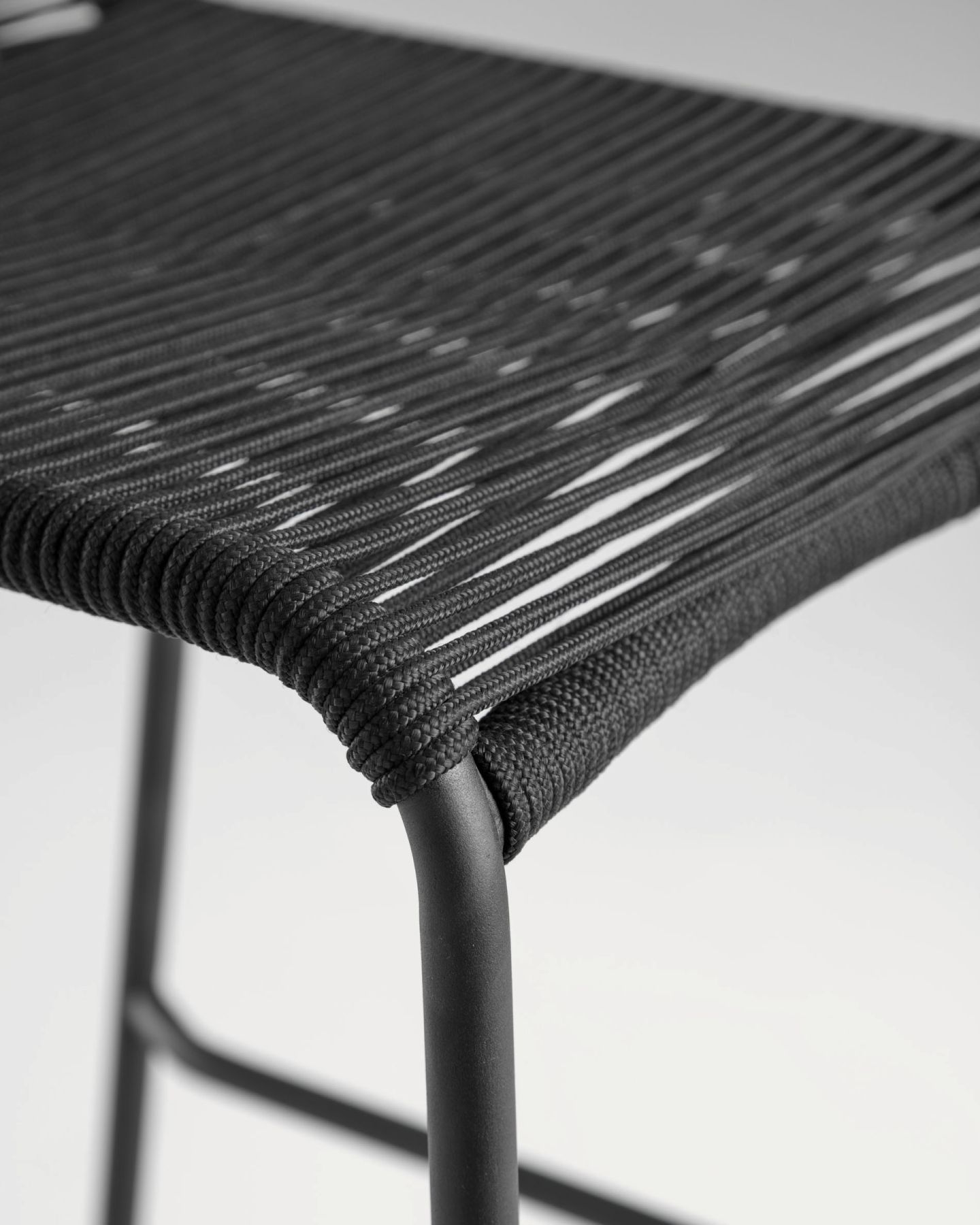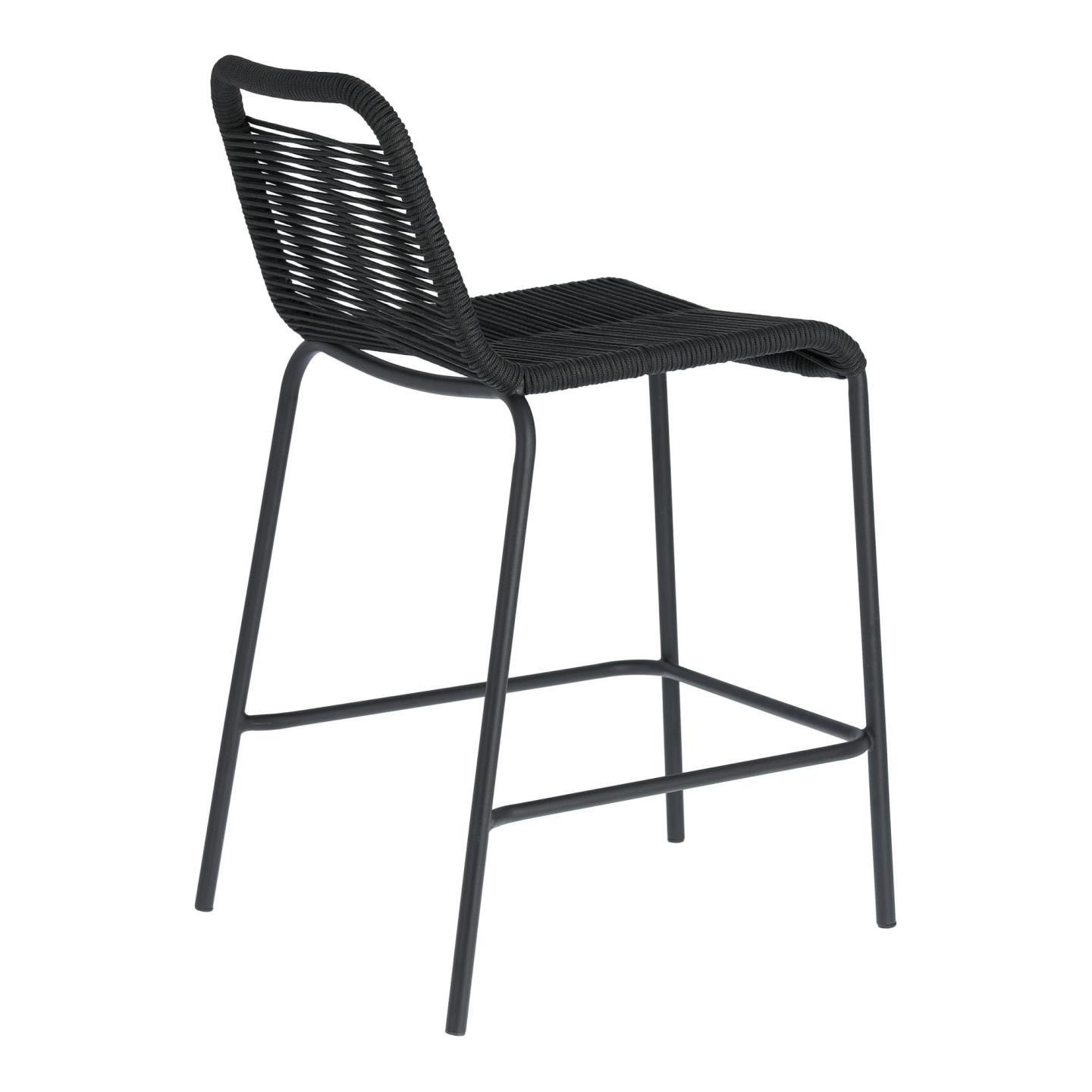 Табурет Glenville черного цвета имеет высоту 88 см. Сиденье сплетено вручную из полиэфирной веревки, которая защищает от ультрафиолетовых лучей, поэтому вы можете использовать его на улице в солнечные дни. Конструкция также изготовлена из оцинкованной стали, устойчива к ржавчине и коррозии и намного долговечнее обычной стали.