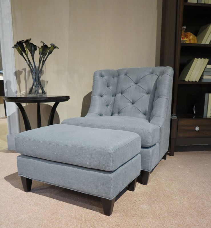 Каркас — натуральный массив дерева, отделка (ножки) — натуральный шпон махагона, обивка — серо-голубая рогожка.