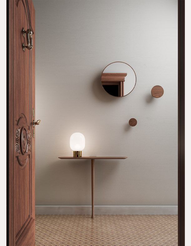 Модульная система, состоящая из полок и секций разной длины. Гарнитур поддерживается центральной осью, на которой попеременно установлены полки, прикрепленные к стене, и свободные полки, что придает конструкции жесткость и динамичность.