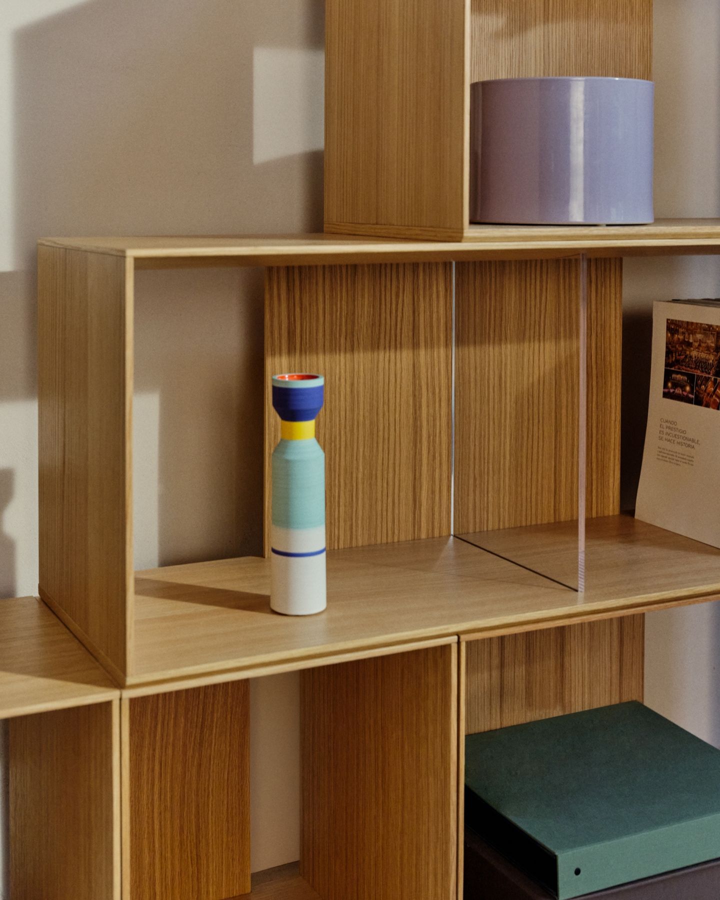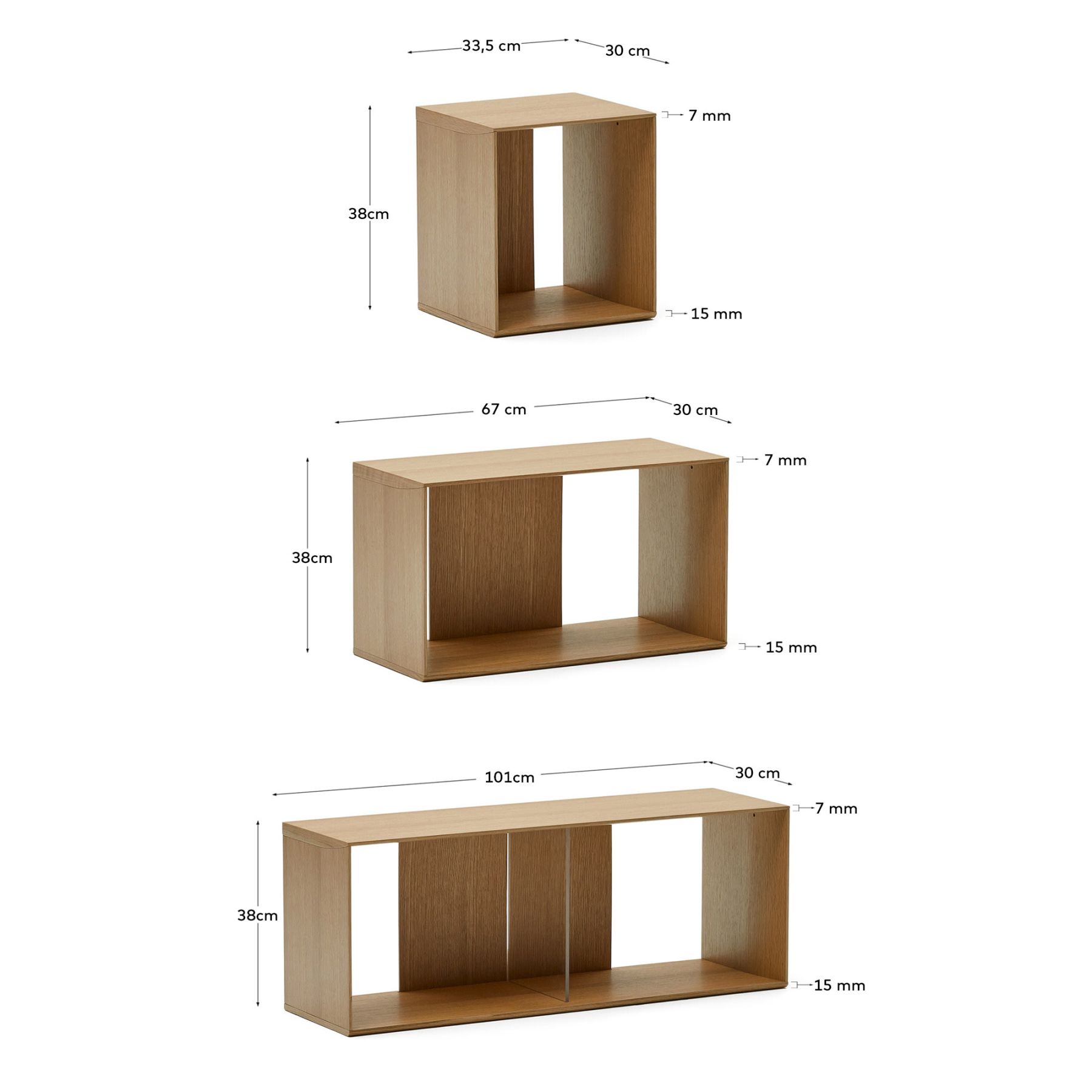 Набор из 3 малых модульных полок, 3 средних модульных полок и 3 больших модульных полок из дубового шпона. Можно комбинировать с остальными модулями из коллекции. Включает в себя металлические кронштейны для крепления модулей друг к другу и к стене. Ноги не включены. Для каждого модуля, стоящего на полу, требуется набор из 5 ножек.