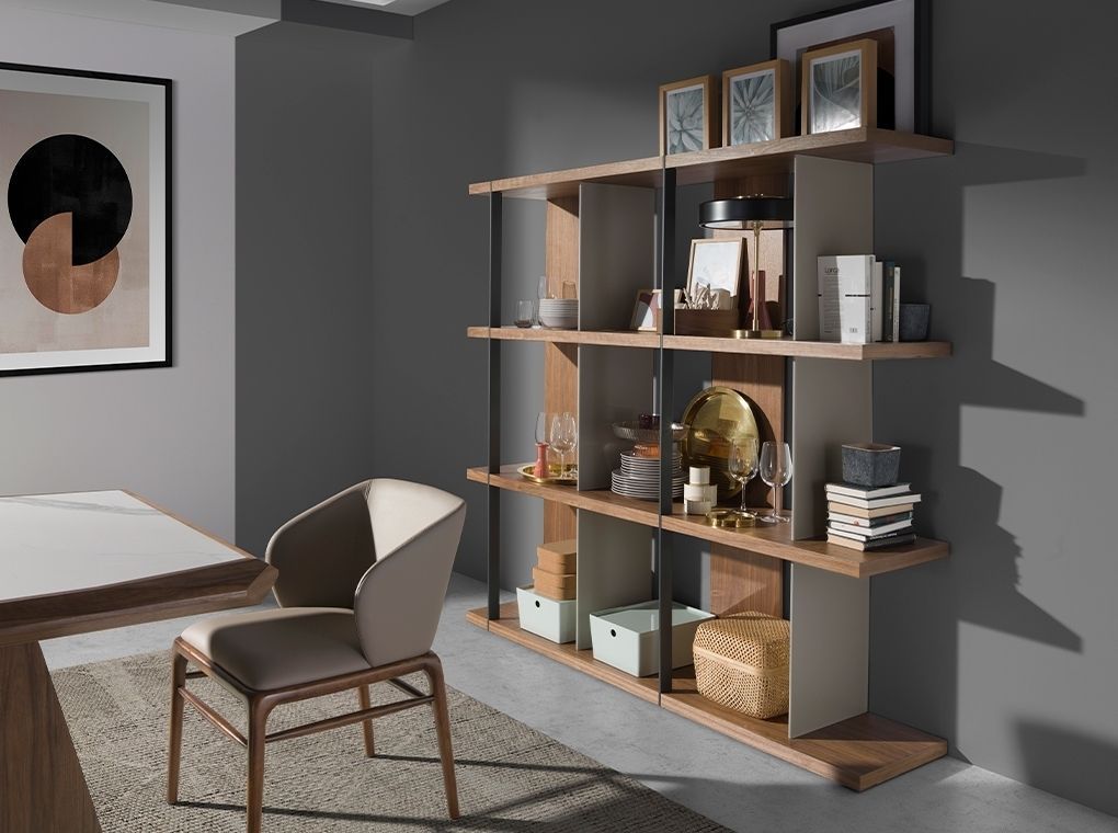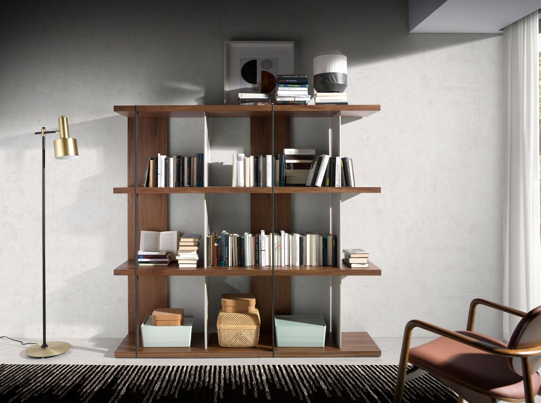 Стеллаж из шпона ореха с двумя полками. Вертикальные стенки из МДФ, окрашенного в серый цвет, и нержавеющей стали, окрашенной в черный эпоксидный цвет.