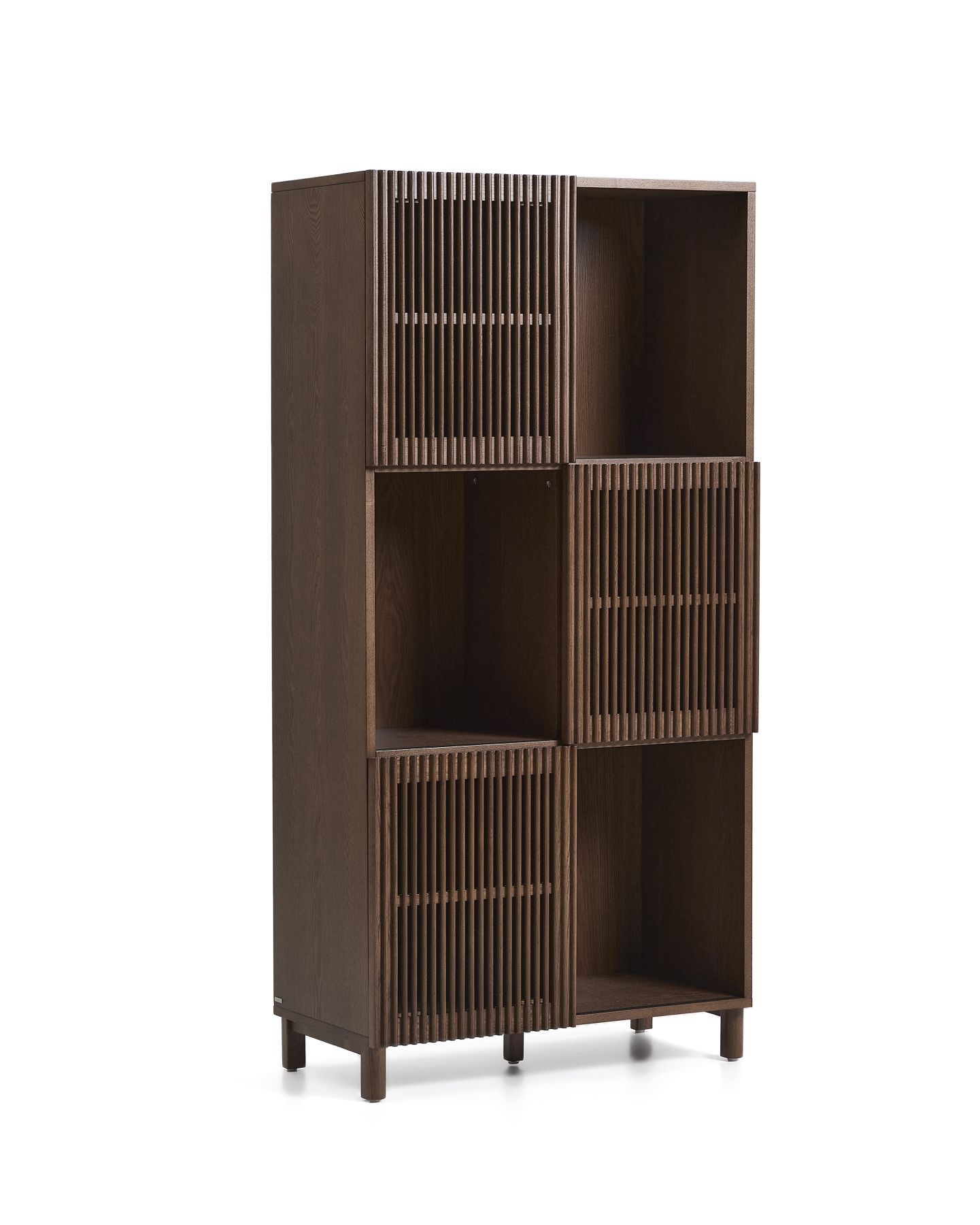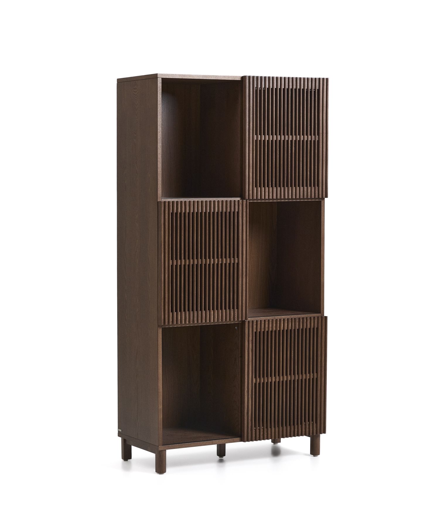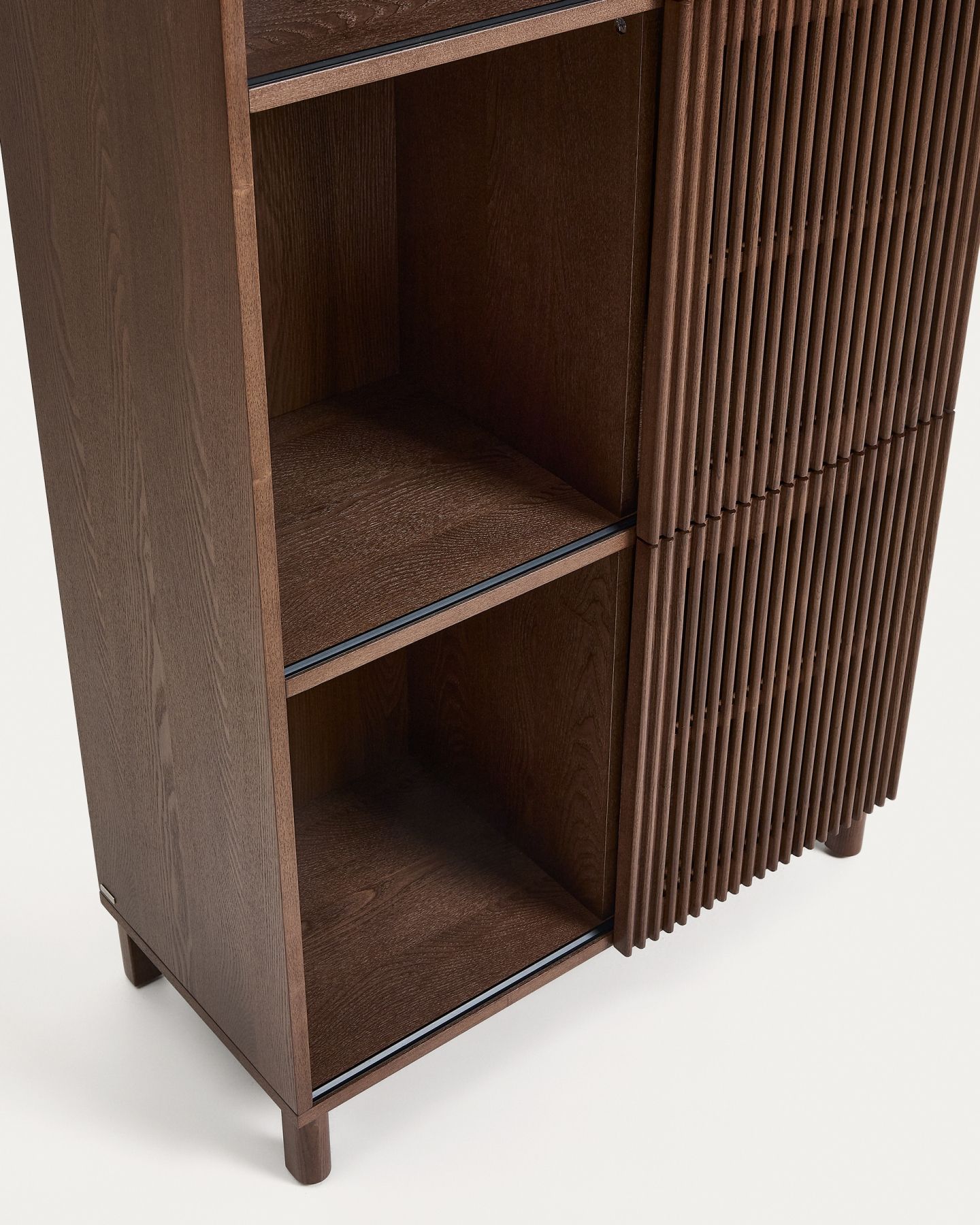 Стеллаж из коллекции Beyla сочетает в себе изысканность ясеня и тщательно продуманный дизайн. Корпус, изготовленный из ясеневого шпона, дополнен ножками из массива дерева и раздвижными дверцами с элегантной отделкой под орех. Дверцы имеют ряд вертикальных планок, которые создают визуальный ритм и позволяют свету создавать тонкие контрасты на поверхности. Благодаря регулируемым ножкам, стеллаж легко адаптируется к неровностям пола, обеспечивая большую устойчивость.