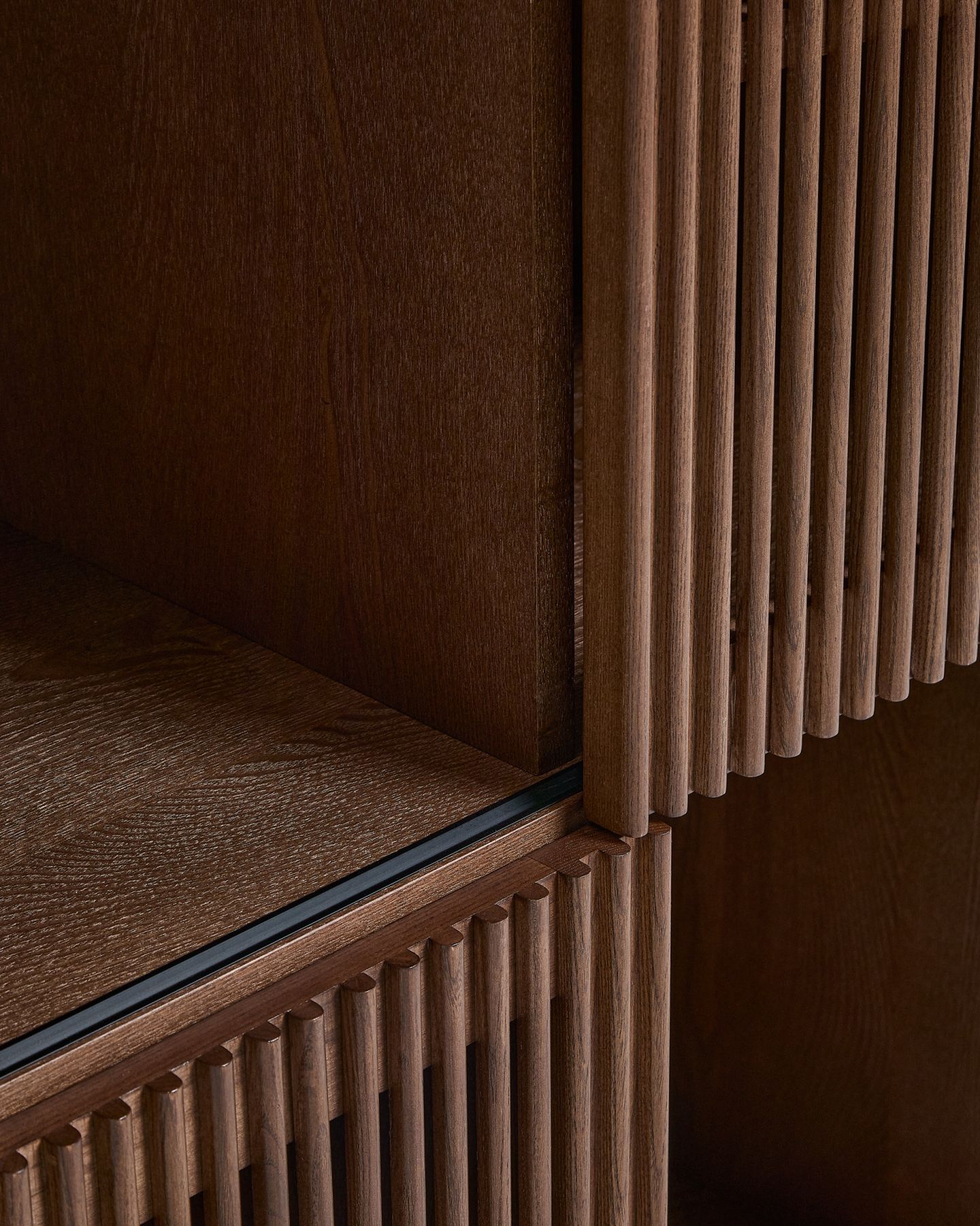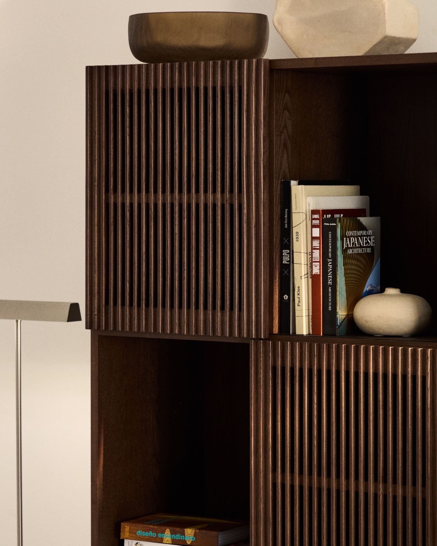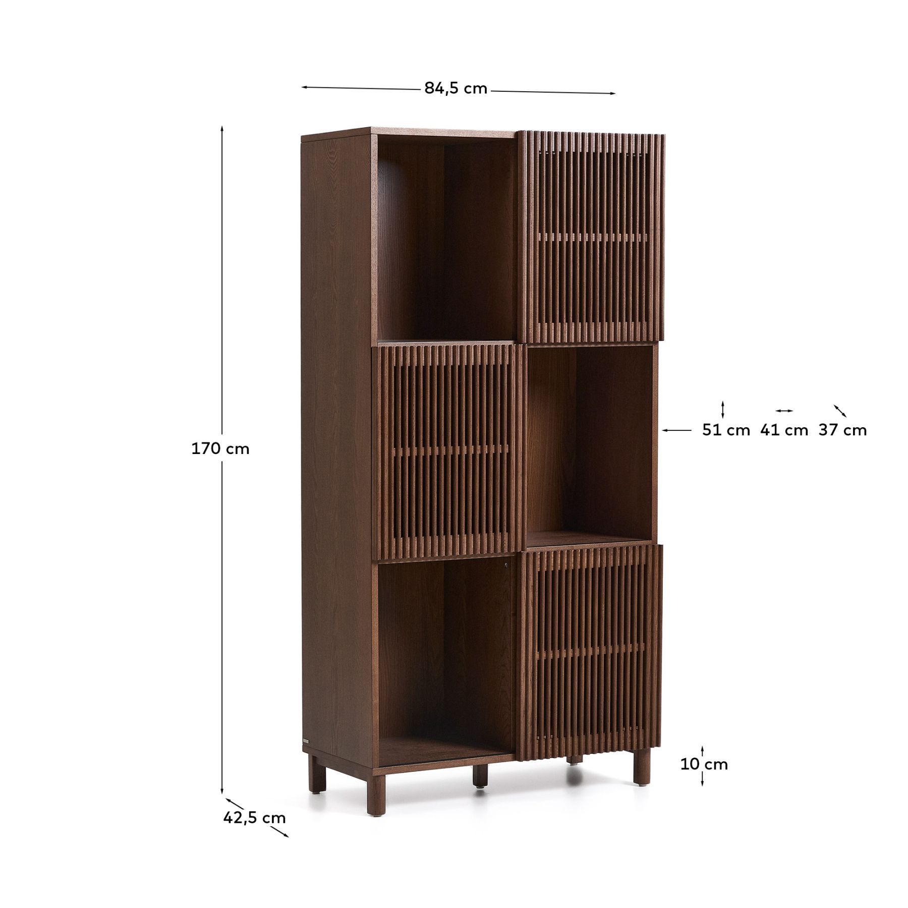 Стеллаж из коллекции Beyla сочетает в себе изысканность ясеня и тщательно продуманный дизайн. Корпус, изготовленный из ясеневого шпона, дополнен ножками из массива дерева и раздвижными дверцами с элегантной отделкой под орех. Дверцы имеют ряд вертикальных планок, которые создают визуальный ритм и позволяют свету создавать тонкие контрасты на поверхности. Благодаря регулируемым ножкам, стеллаж легко адаптируется к неровностям пола, обеспечивая большую устойчивость.