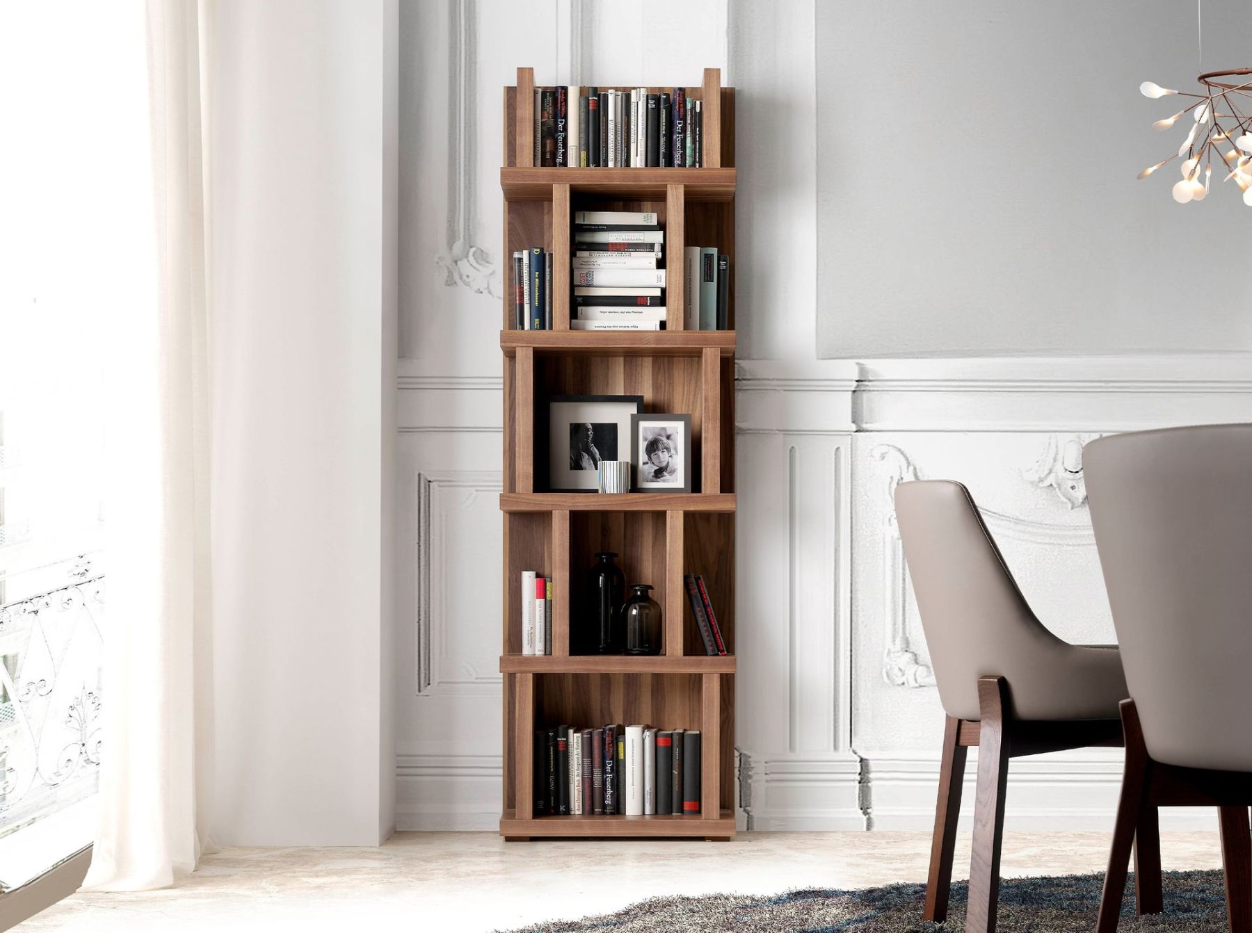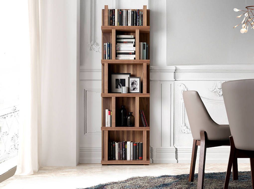 Стеллаж GOB-N5405 — удобное хранилище для нужных вещей от испанской фабрики Angel Cerda. Стеллаж понравится с первого взгляда. Нескучный дизайн здесь сочетается с продуманной до мелочей эргономичностью. Универсальный коричневый цвет и запах дерева добавят уюта и тепла в любое помещение. Данная модель создана в современном европейском стиле. В ней нет ничего лишнего — только максимум пространства для хранения вещей. Конструкция состоит из пяти полок, на каждой из которых боковые стенки закреплены в хаотичном порядке. Такое дизайнерское решение позволяет творчески подходить к расстановке предметов декора, а также удобно отделять важные документы от книг. Стеллаж сделан из МДФ и орехового шпона. Этот материал не только прочный и долговечный, но и имеет эстетичный внешний вид и приятный теплый цвет. Панели толстые, имеют толщину 5 см. Все полки равноудалены друг от друга. Расстояние между поками составляет 36 см. Лучше всего стеллаж ставить фронтально к стене, так как он не сквозной. Можно приобрести сразу два изделия и поставить их рядом на небольшом расстоянии друг от друга. Размеры — 60 см × 28 см × 190 см (ширина, глубина, высота). Вес — 47 кг. Изделие приходит в разобранном виде (в комплектацию входит инструкция по сборке и необходимый крепеж).