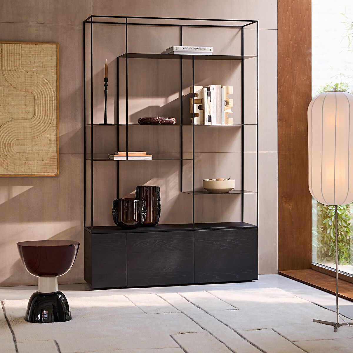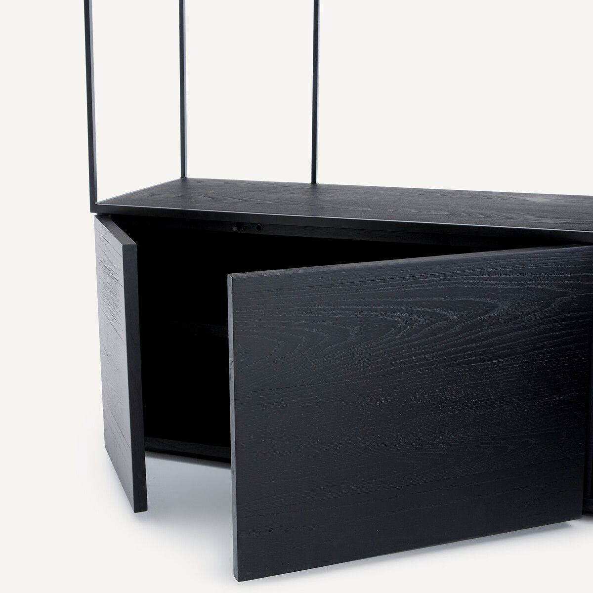 Тумба с дверцами и внутренними полками из МДФ, шпонированного вязом FSC® и покрытого нитроцеллюлозным лаком.