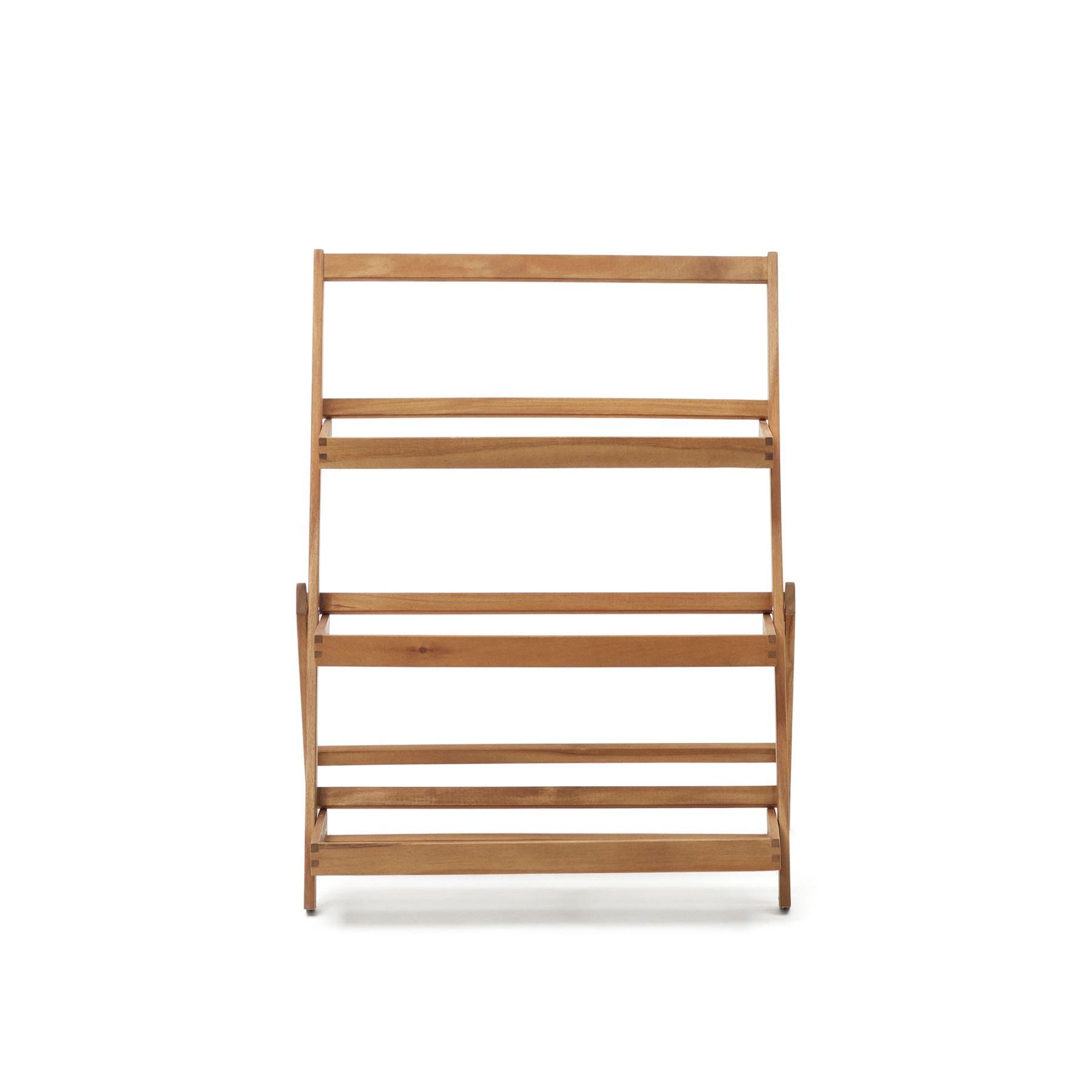 Стеллаж полностью изготовлен из древесины акации. Сверху массив защищен от негативных внешних воздействий прозрачным полиуретаном.