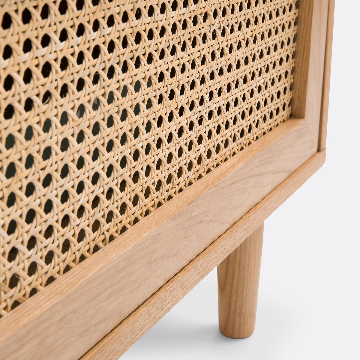 — Фасад ящика из ясеня и плетеного ротанга, ручки из алюминия с отделкой под латунь, кулиски из стали