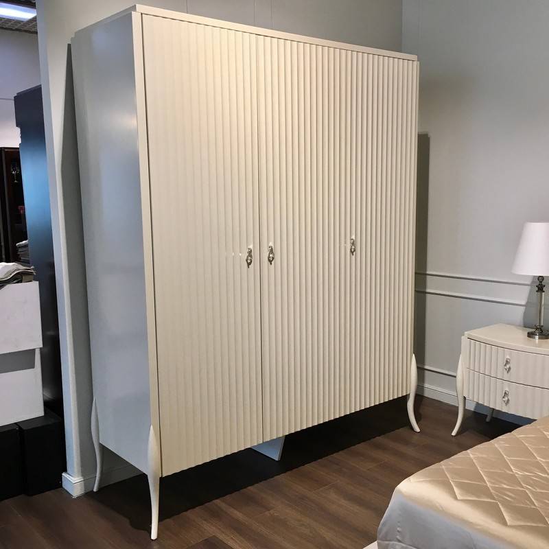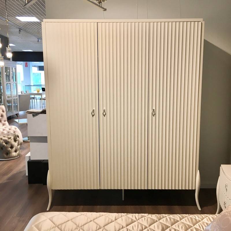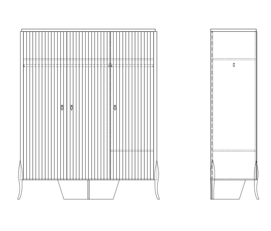 Гардероб на ножках с тремя распашными дверками. Внутреннее наполнение: штанга и полки.