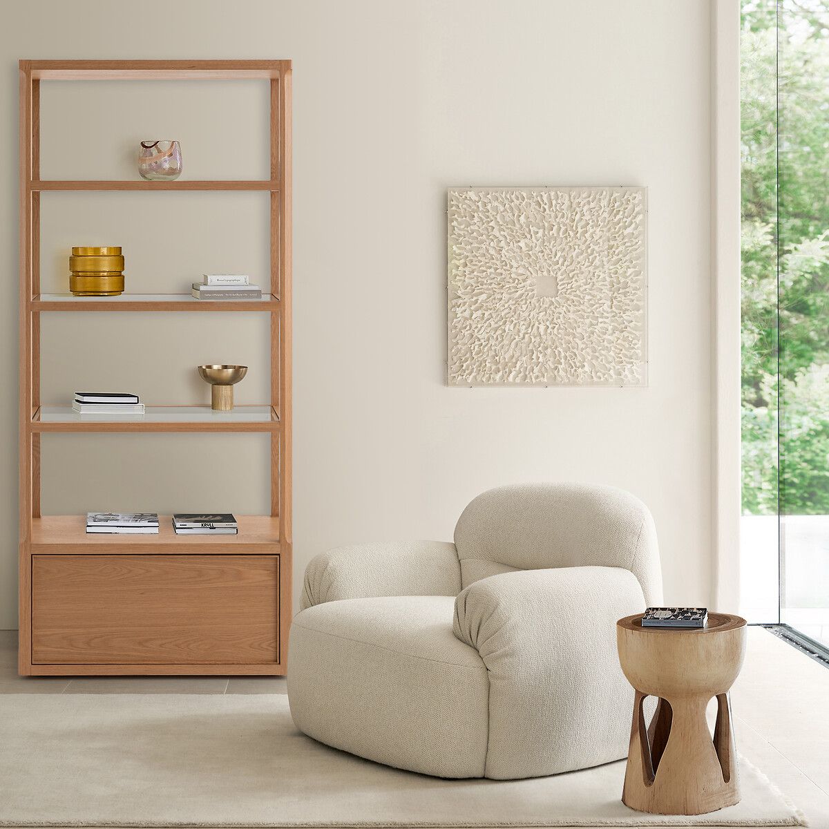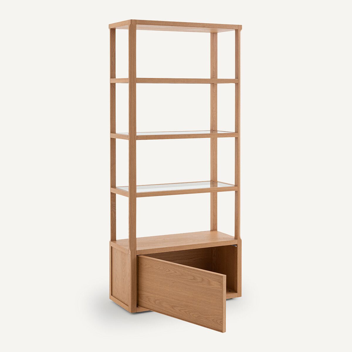 Книжный шкаф Iéna имеет гладкую, обтекаемую деревянную конструкцию в сочетании с прозрачными полками из стекла. Он обладает линейной воздушной формой, контрастирующей с массивным вместительным каркасом. Скошенные края сглаживают углы, создавая мягкий переход между модулями. Создано дизайнером Эммануэлем Галлина эксклюзивно для AMPM.