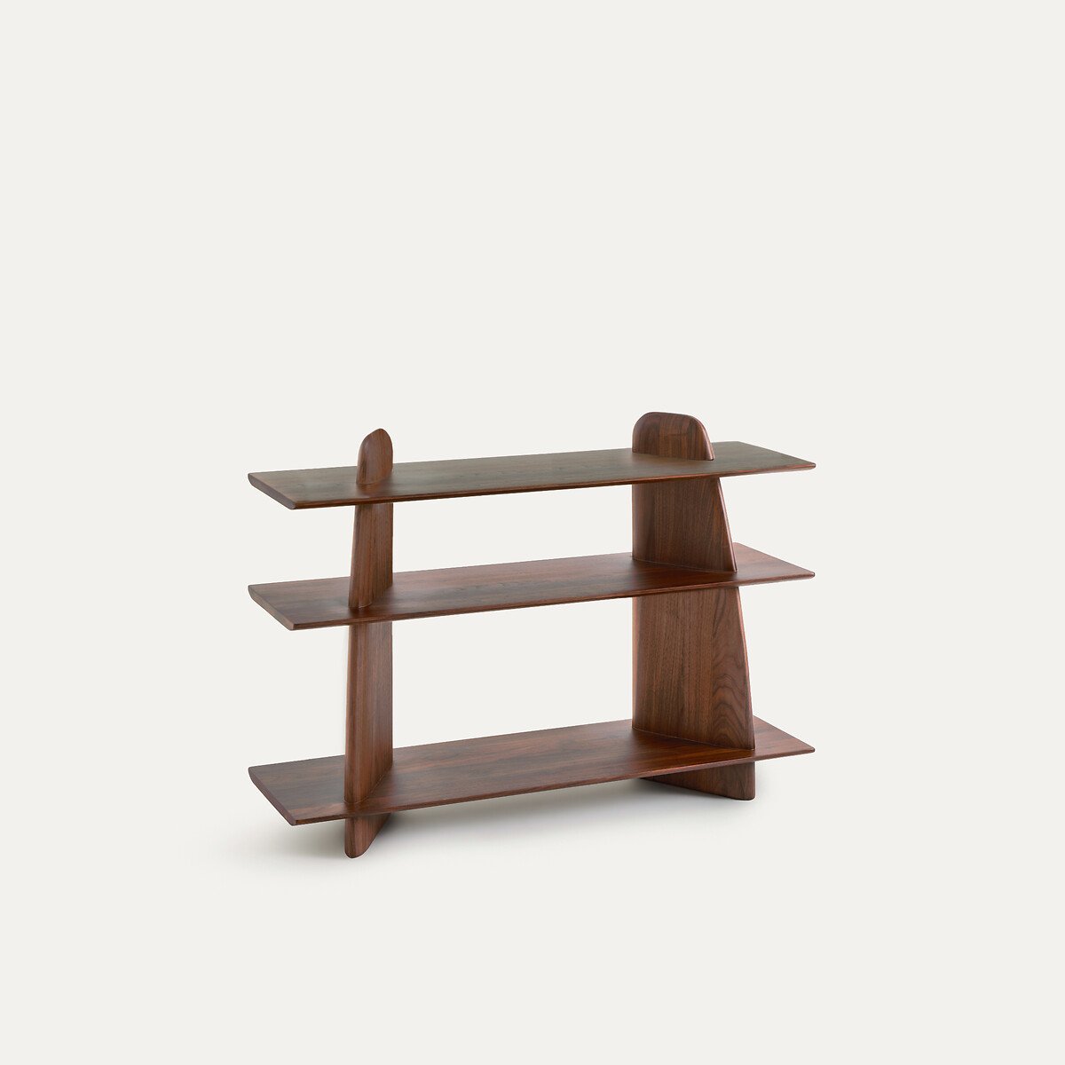 — Книжный шкаф из массива ореха, со стойками, напоминающими крылья самолета, с полиуретановой отделкой