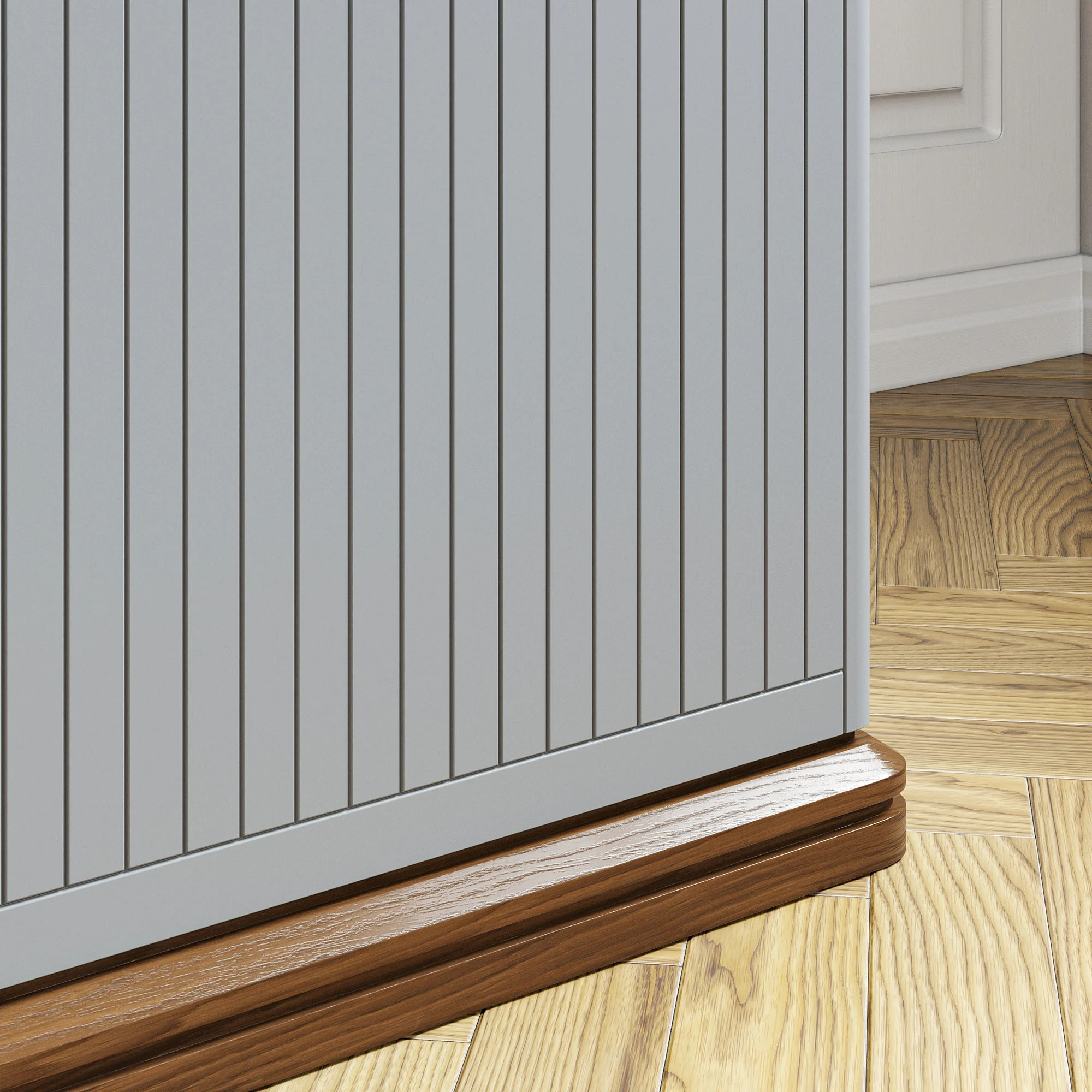 Основание шкафа выполнено из массива дуба и покрыто тонированной эмалью, а крышка отделана эмалью и имеет многогранную ступенчатую фрезеровку, что подчеркивает утонченную изысканность дизайна.