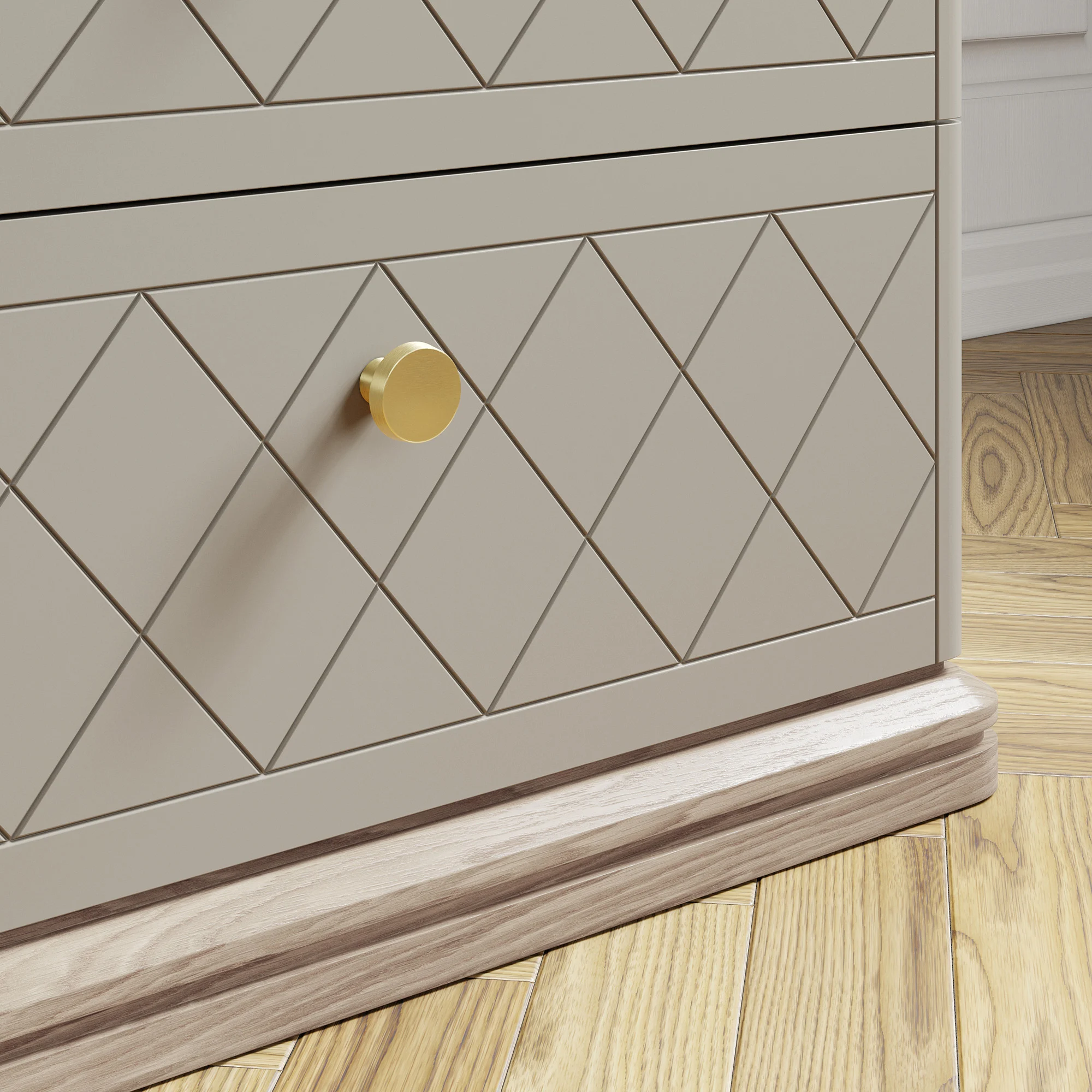 Фасады шкафа украшены гравировкой и ручками в четырех видах отделки. Тонированное основание из массива дуба и эмалированная крышка с многогранной ступенчатой фрезеровкой демонстрируют утонченную изысканность дизайна, который будет актуален вне времени.