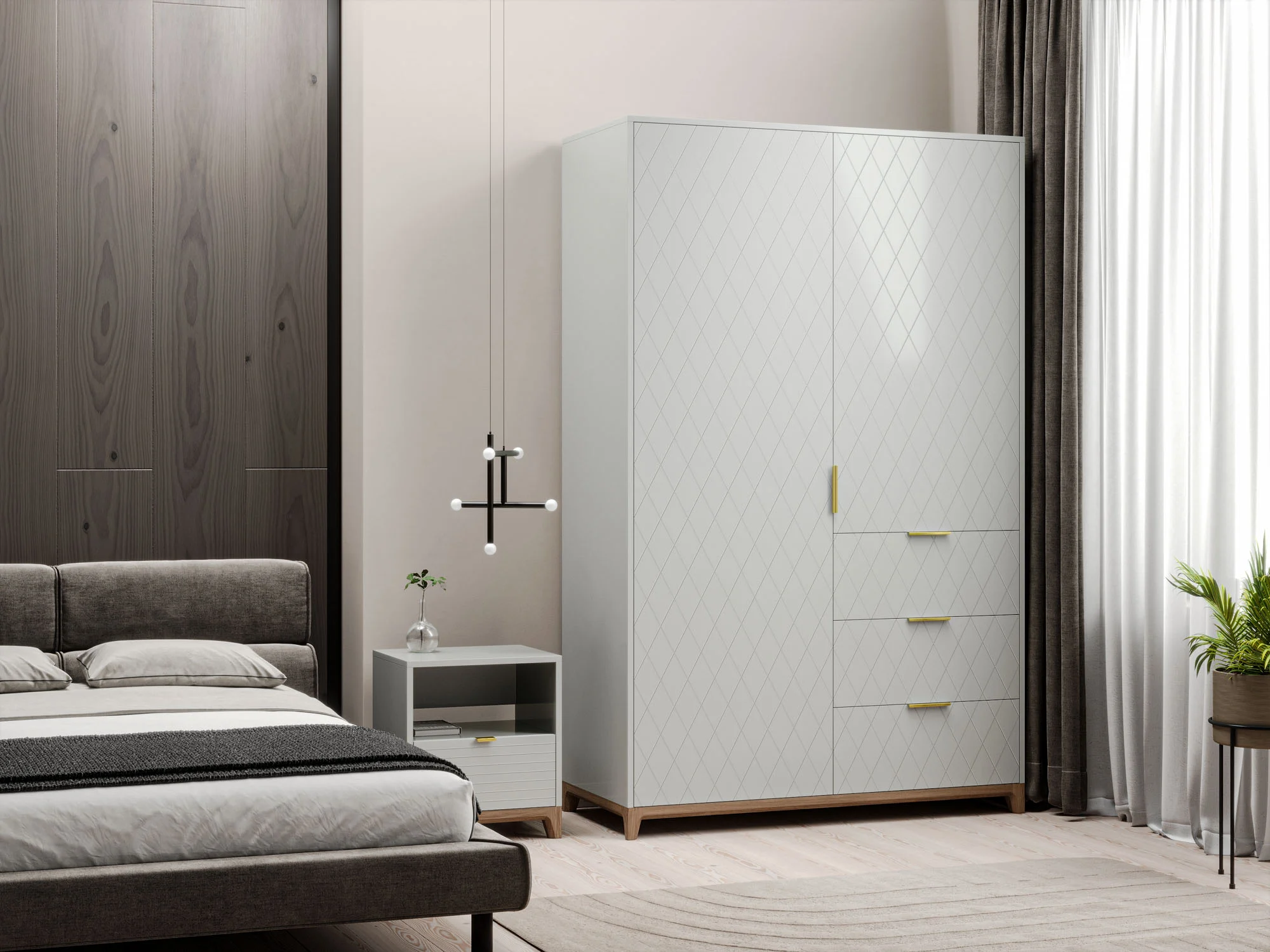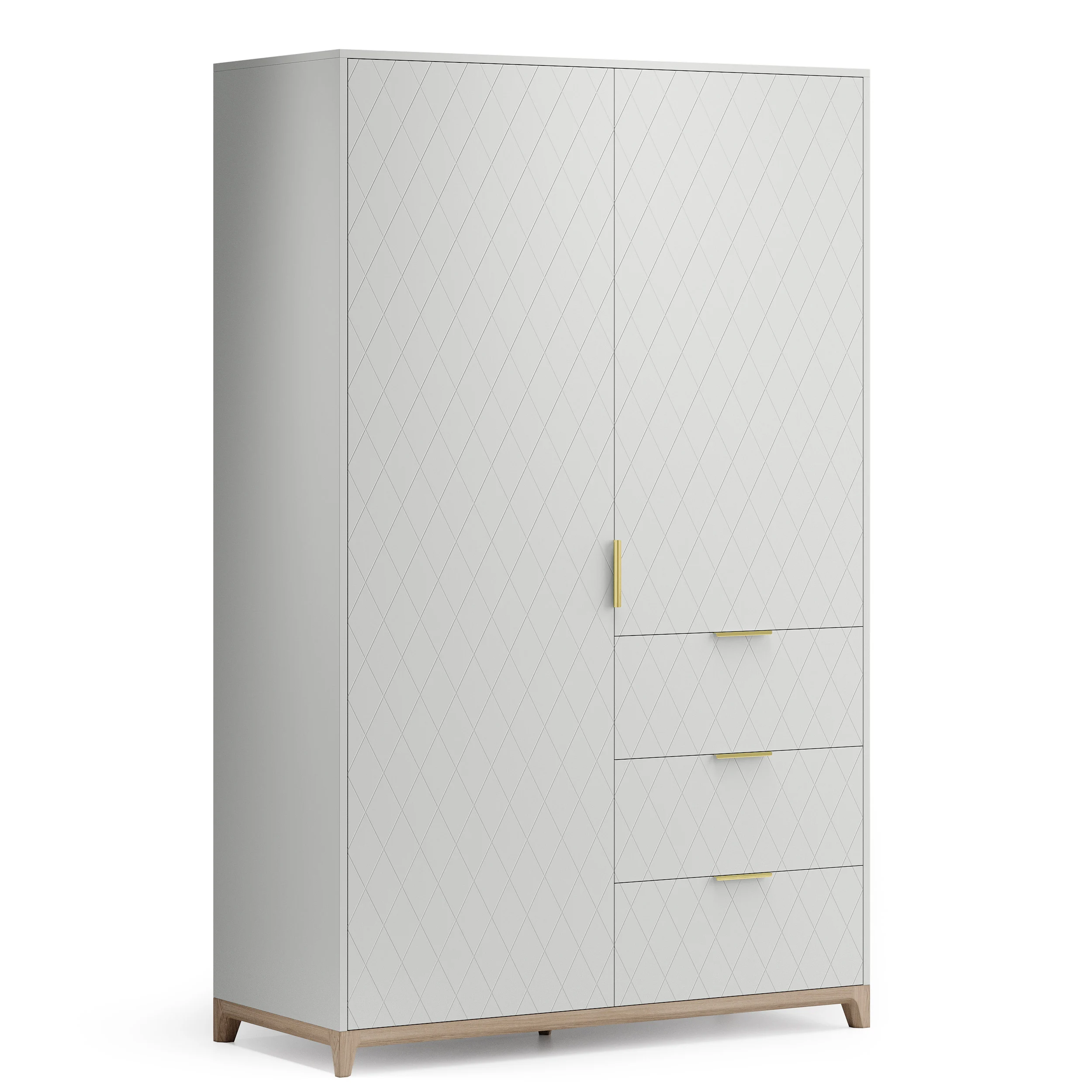 Шкаф позволяет комфортно разложить личные вещи на полках и в ящиках, а также повесить их на вешалку. Конструкция шкафа предусматривает одну секцию со штангой, одну секцию с полками, которые скрыты за фасадом и три вместительных ящика. При необходимости вы можете регулировать высоту полок.