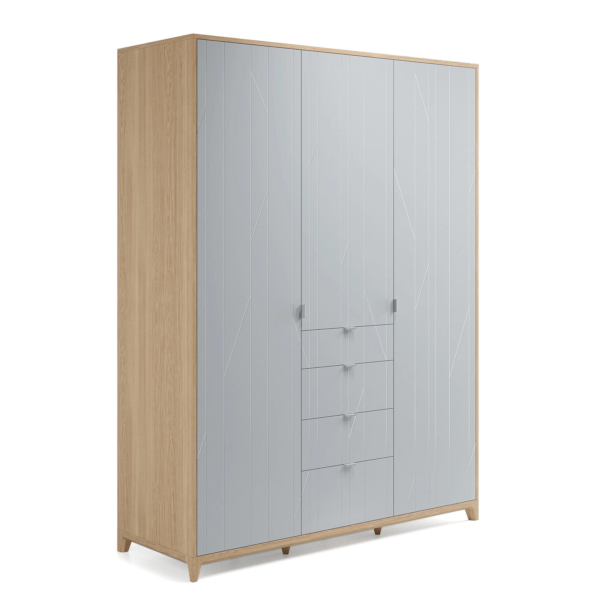 Конструкция шкафа предусматривает две секции со штангами и полками, а также одну секцию по середине, которая состоит из полок, скрытых за фасадом, и ящиков. Кроме того, предусмотрены отверстия для регулировки высоты полок и штанг.