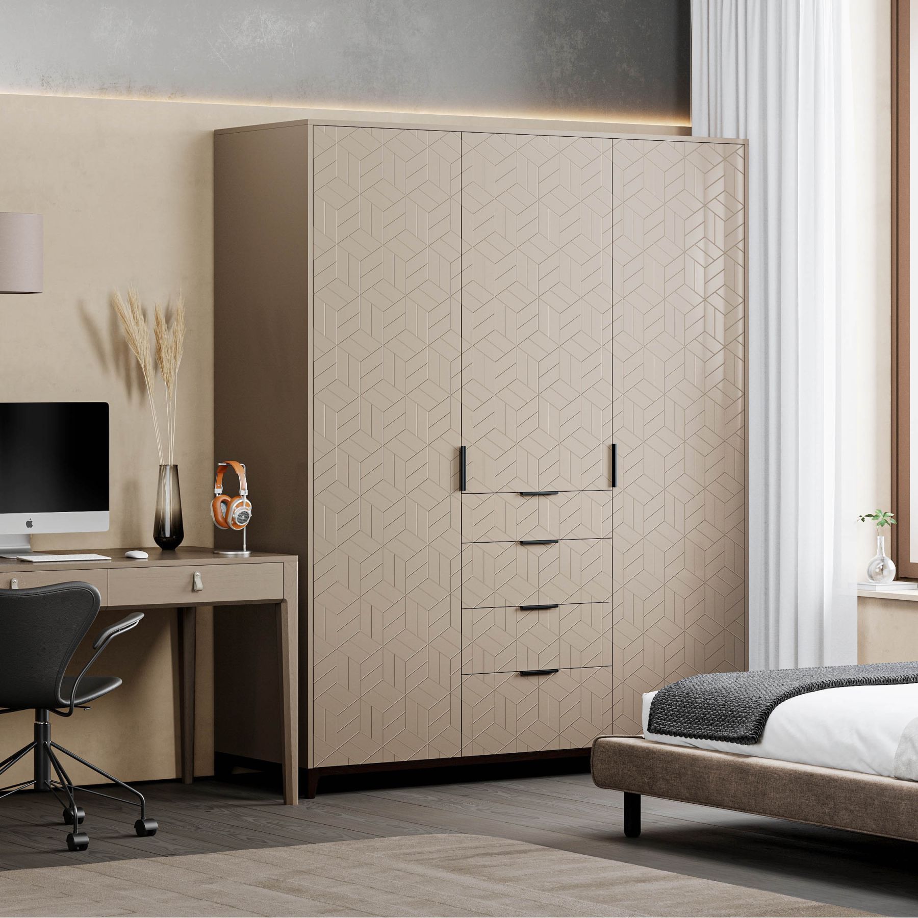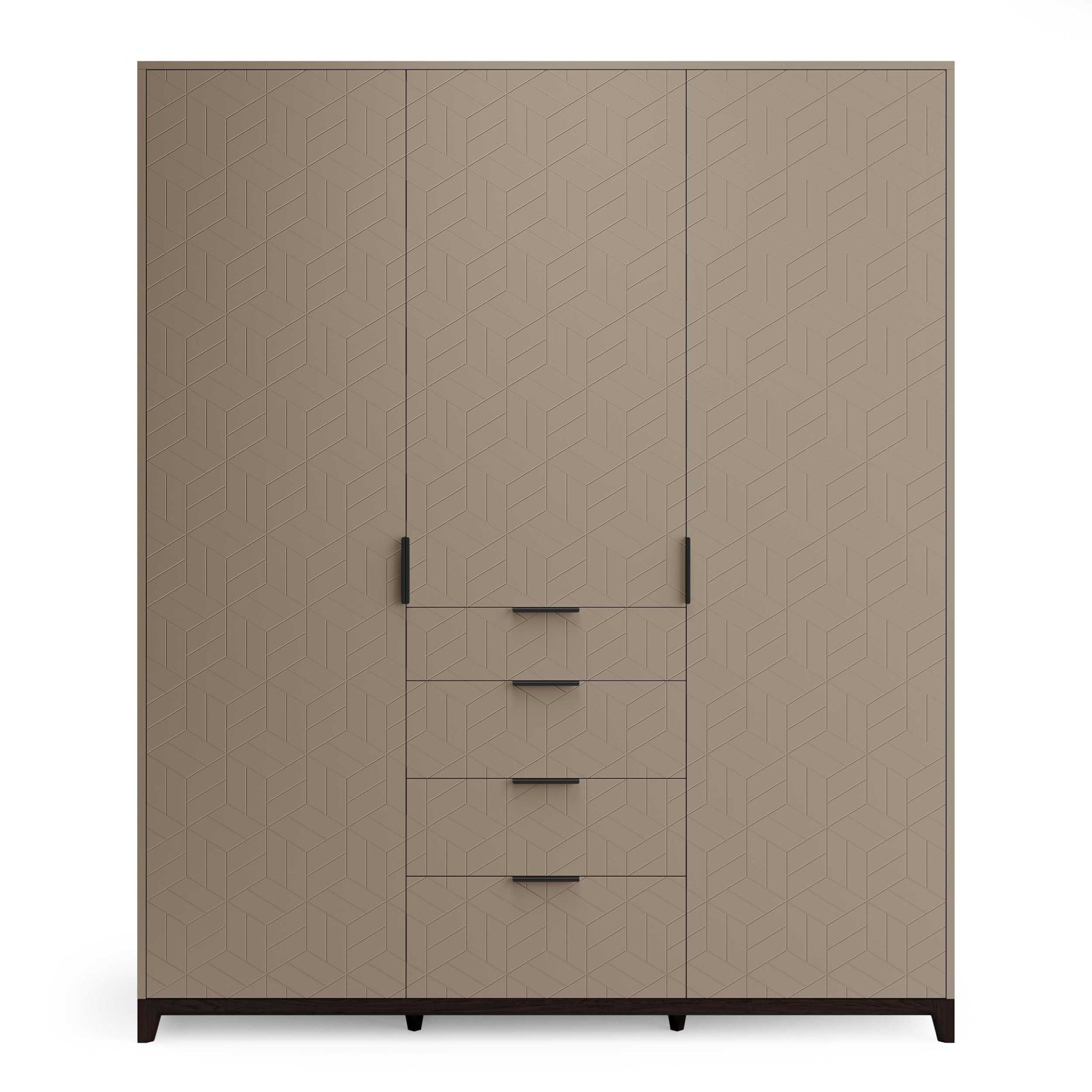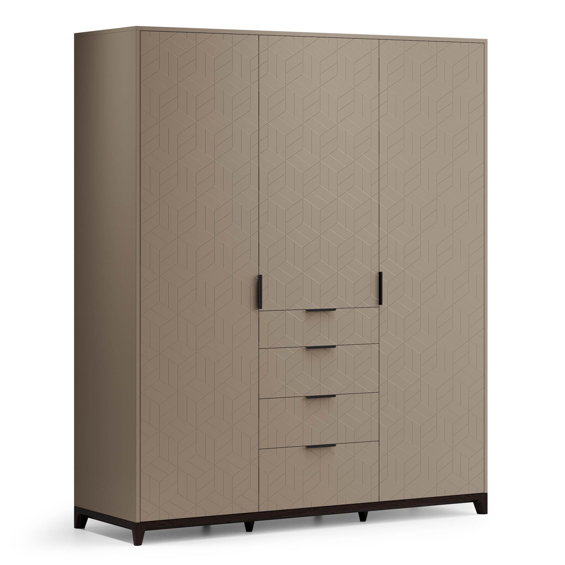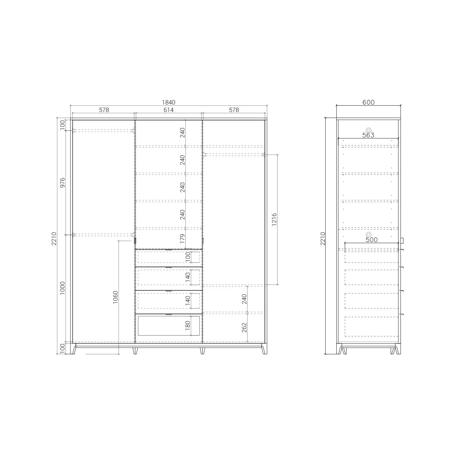 Конструкция шкафа предусматривает две секции со штангами и полками, а также одну секцию по середине, которая состоит из полок, скрытых за фасадом, и ящиков. Кроме того, предусмотрены отверстия для регулировки высоты полок и штанг.