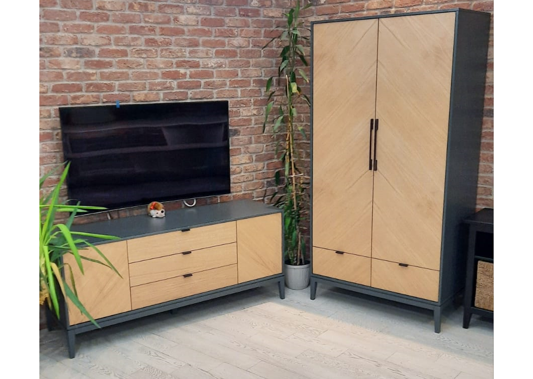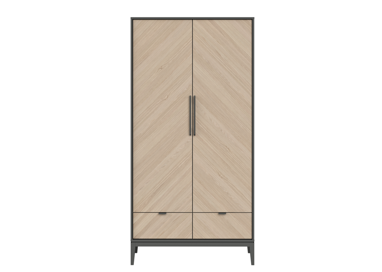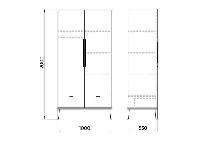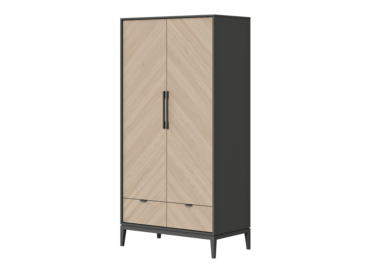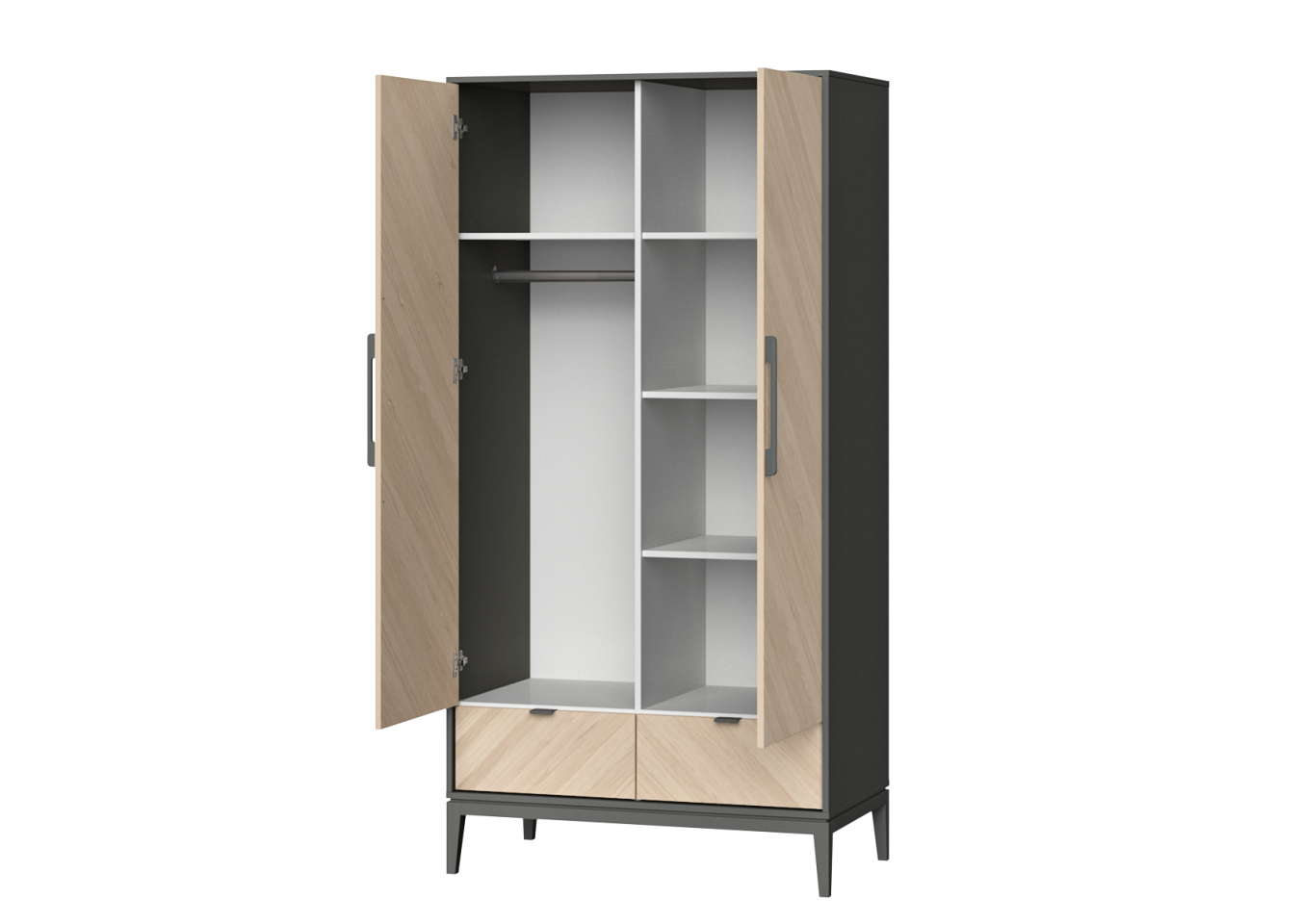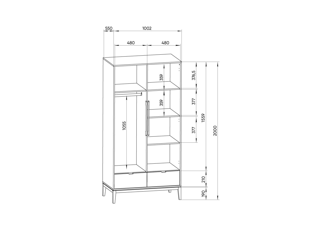 Шкаф Fjord имеет два отделения с полками и штангой, вместительный ящик на бесшумных направляющих с доводчиками