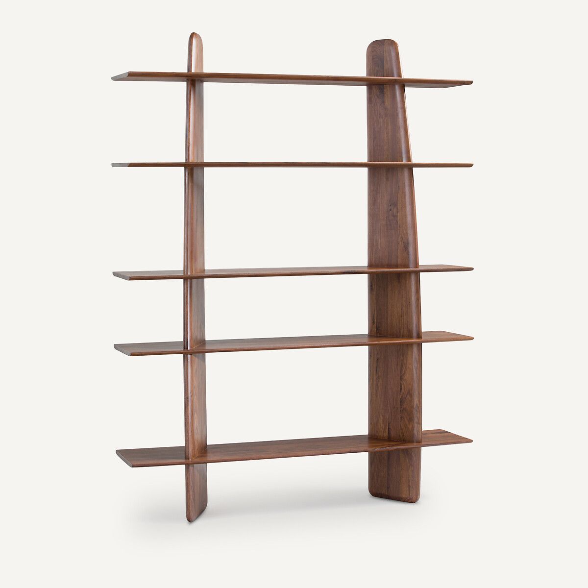 — Книжный шкаф из массива ореха, со стойками, напоминающими крылья самолета, с полиуретановой отделкой.