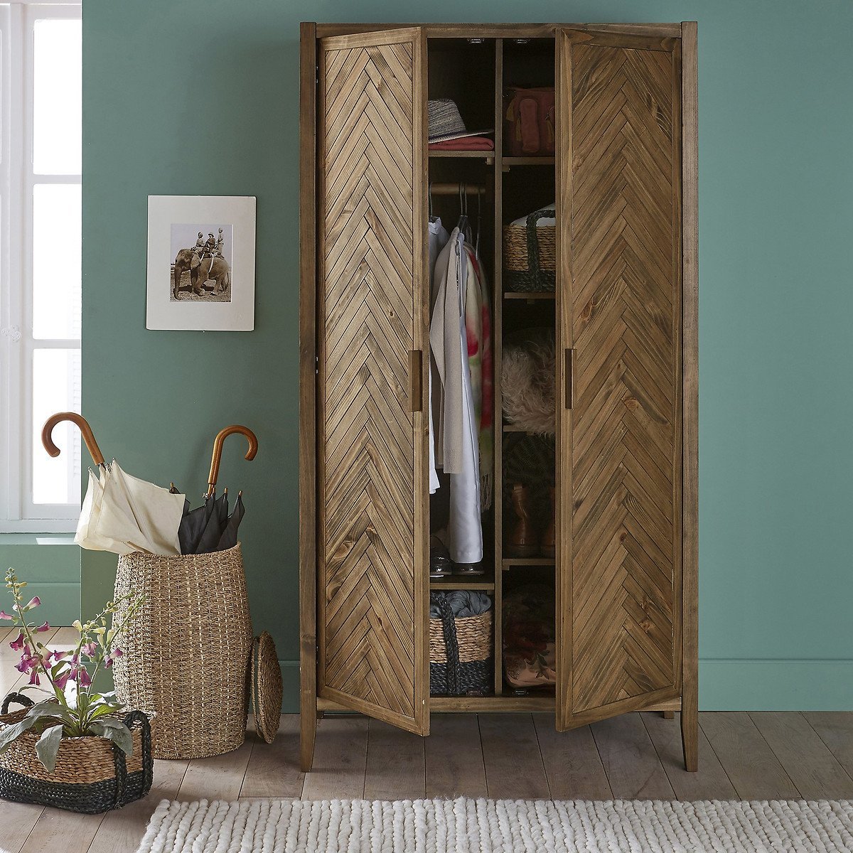 — Слева: 1 перекладина для вешалок и 2 фиксированные полки