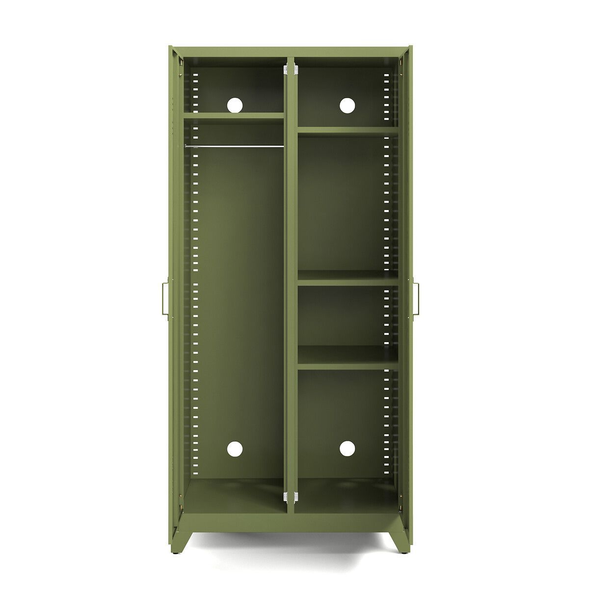 — Слева: одно отделение для вешалок и одна регулируемая съемная полка;