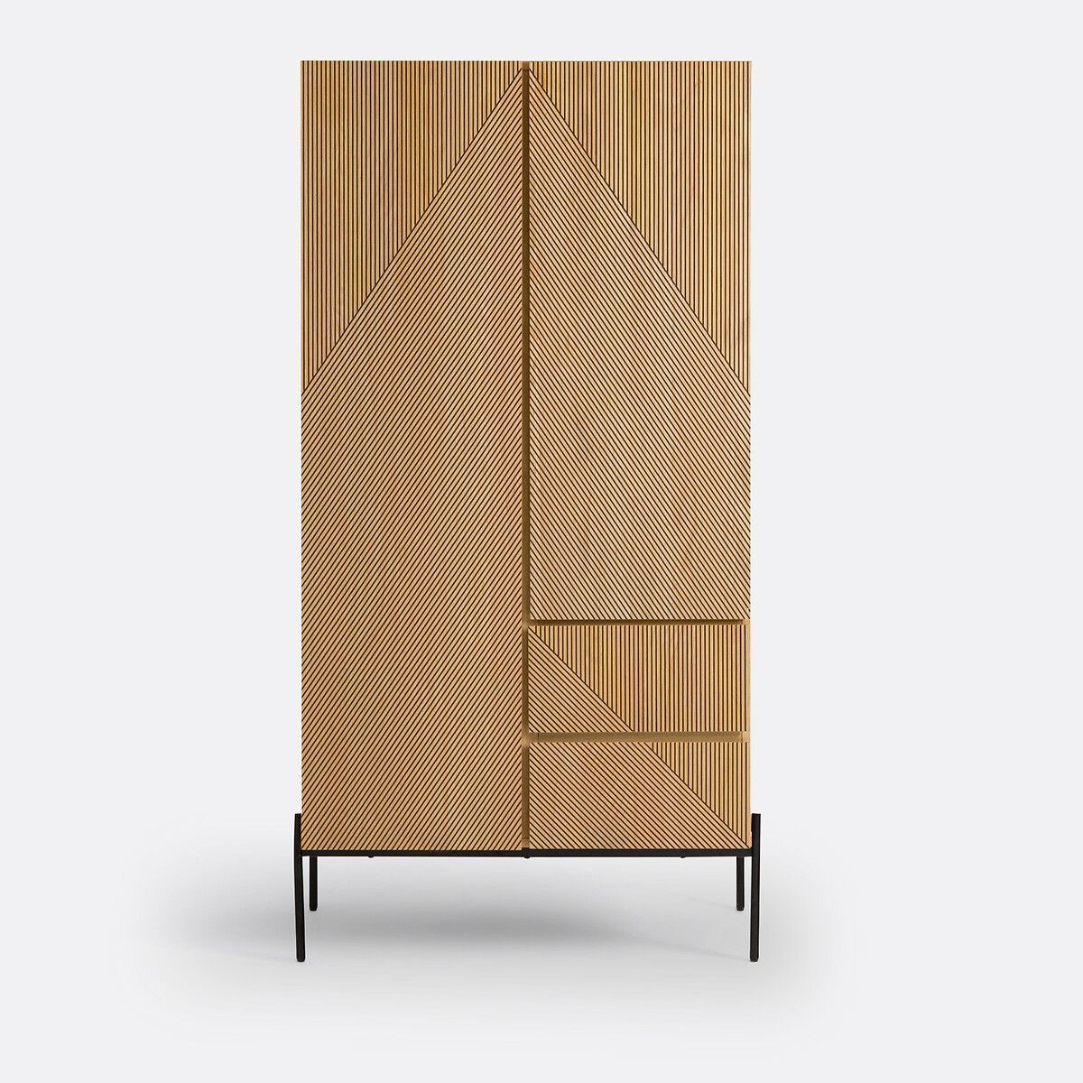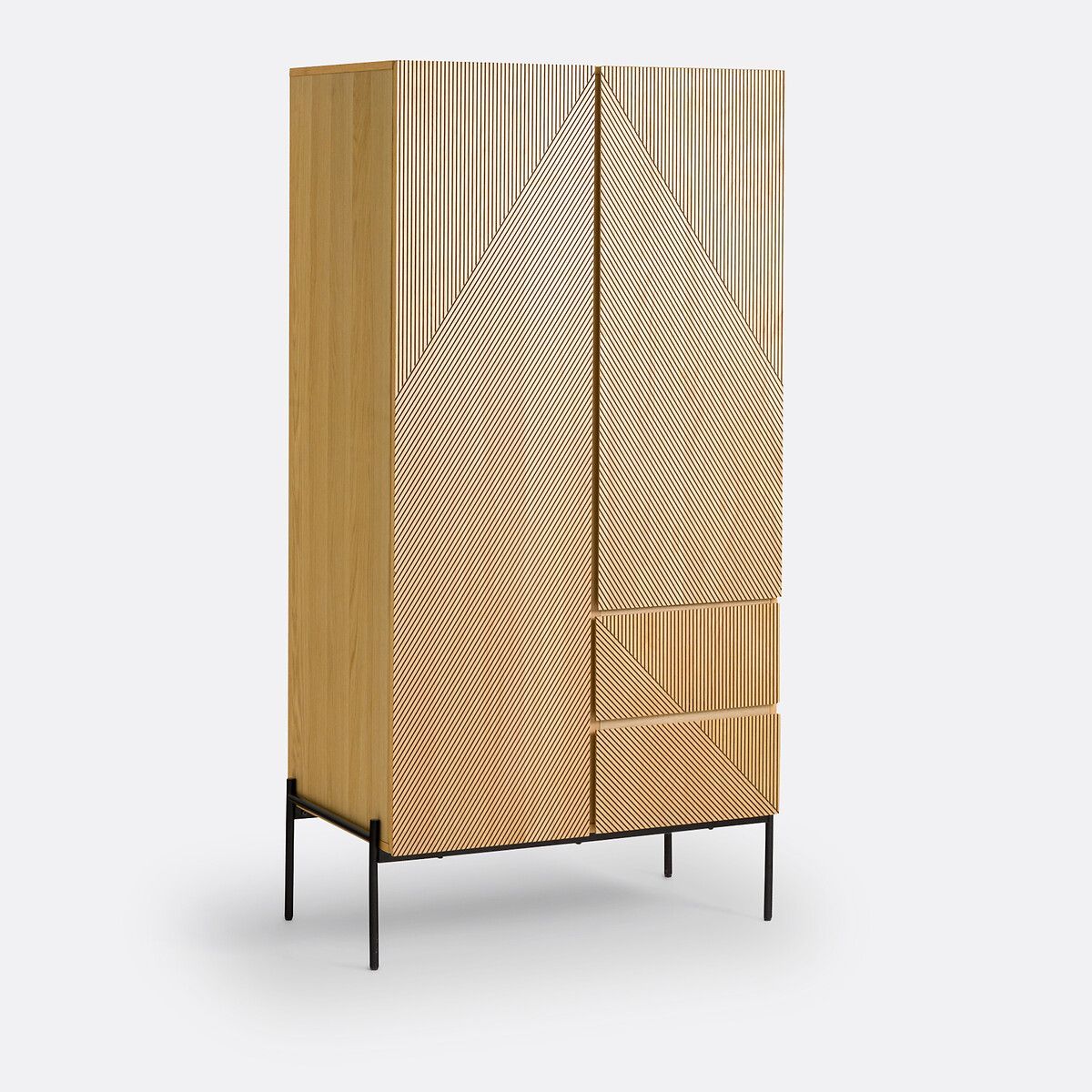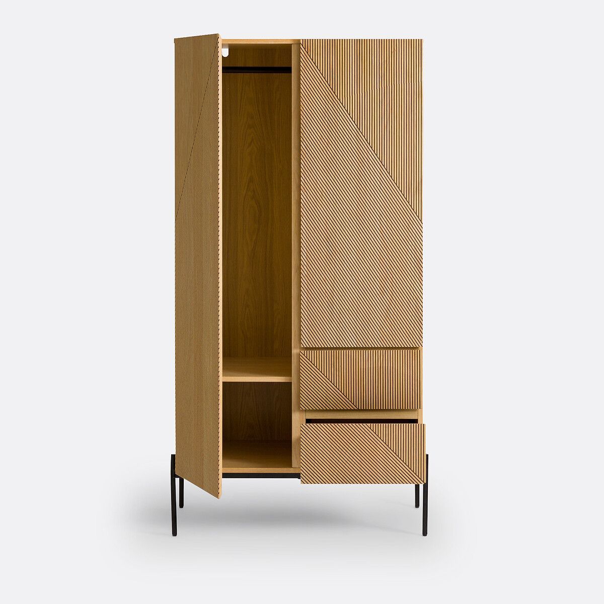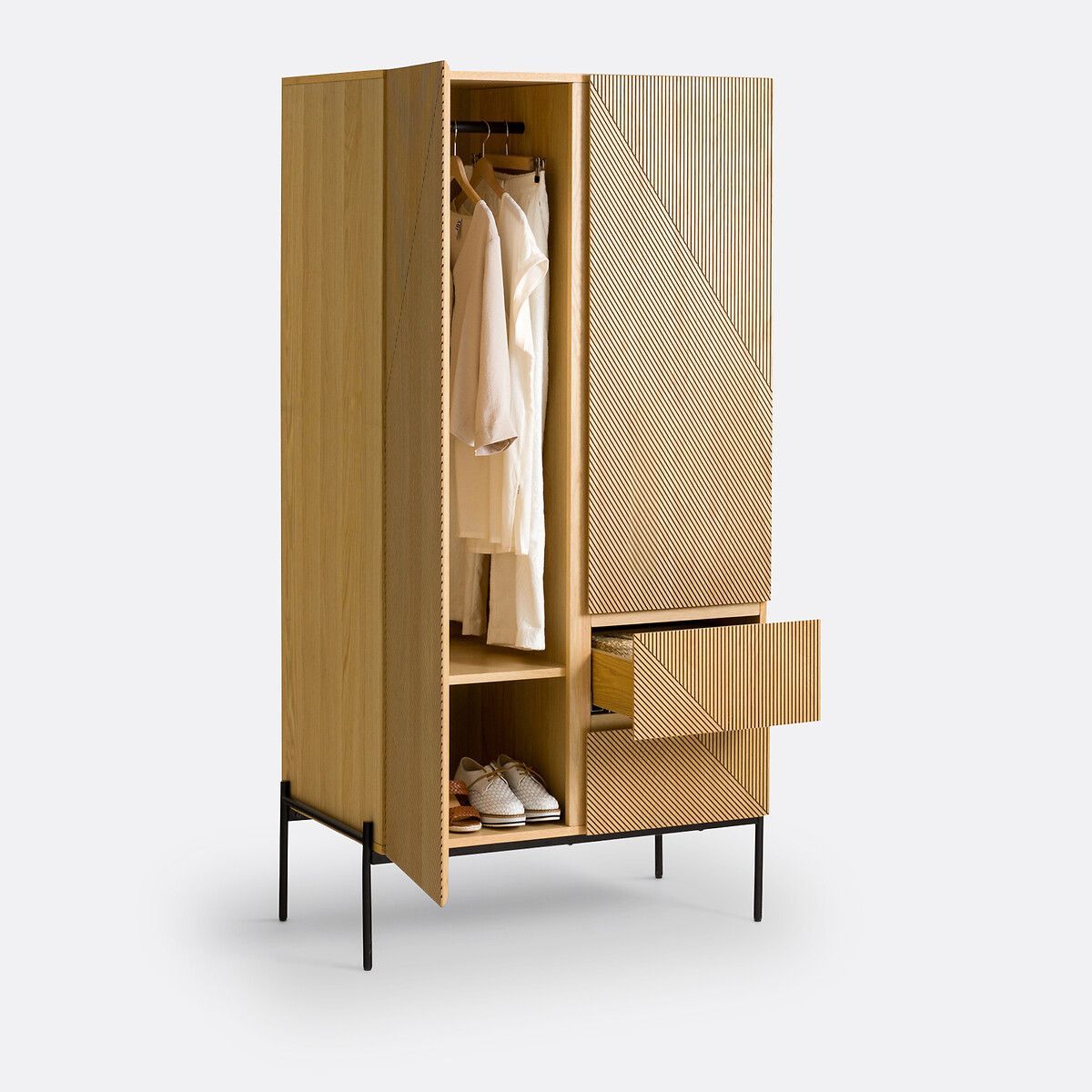 Мебель в винтажном стиле вновь становится популярной. Этот красивый деревянный шкаф с металлическими элементами – отличный пример такого стиля. Он оснащен двумя дверцами и двумя ящиками с фасадами, украшенными желобками. Слева предусмотрены отделение для вешалок с одной полкой внизу, а справа – место для хранения постельного белья с тремя полками. Для удобства использования скошенные дверцы и ящики оборудованы специальными механизмами Softclosing, обеспечивающими плавное закрывание.