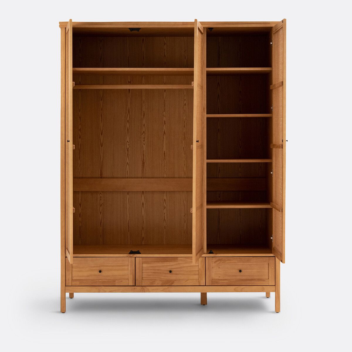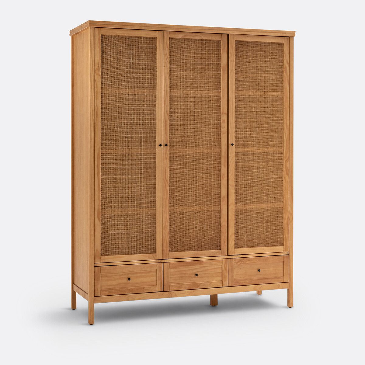 Каркас и ящики из массива сосны с легкой шлифовкой и покрытием под дуб с НЦ-лакировкой. Фасад дверок из ажурного плетеного материала с натуральным покрытием. Ручки из черного металла с эффектом старины. 3 дверки + 3 ящика снизу. Слева: 2 дверки с 1 поперечной полкой сверху + 1 перекладина для вешалок. Справа: 1 дверка с 4 полками.
