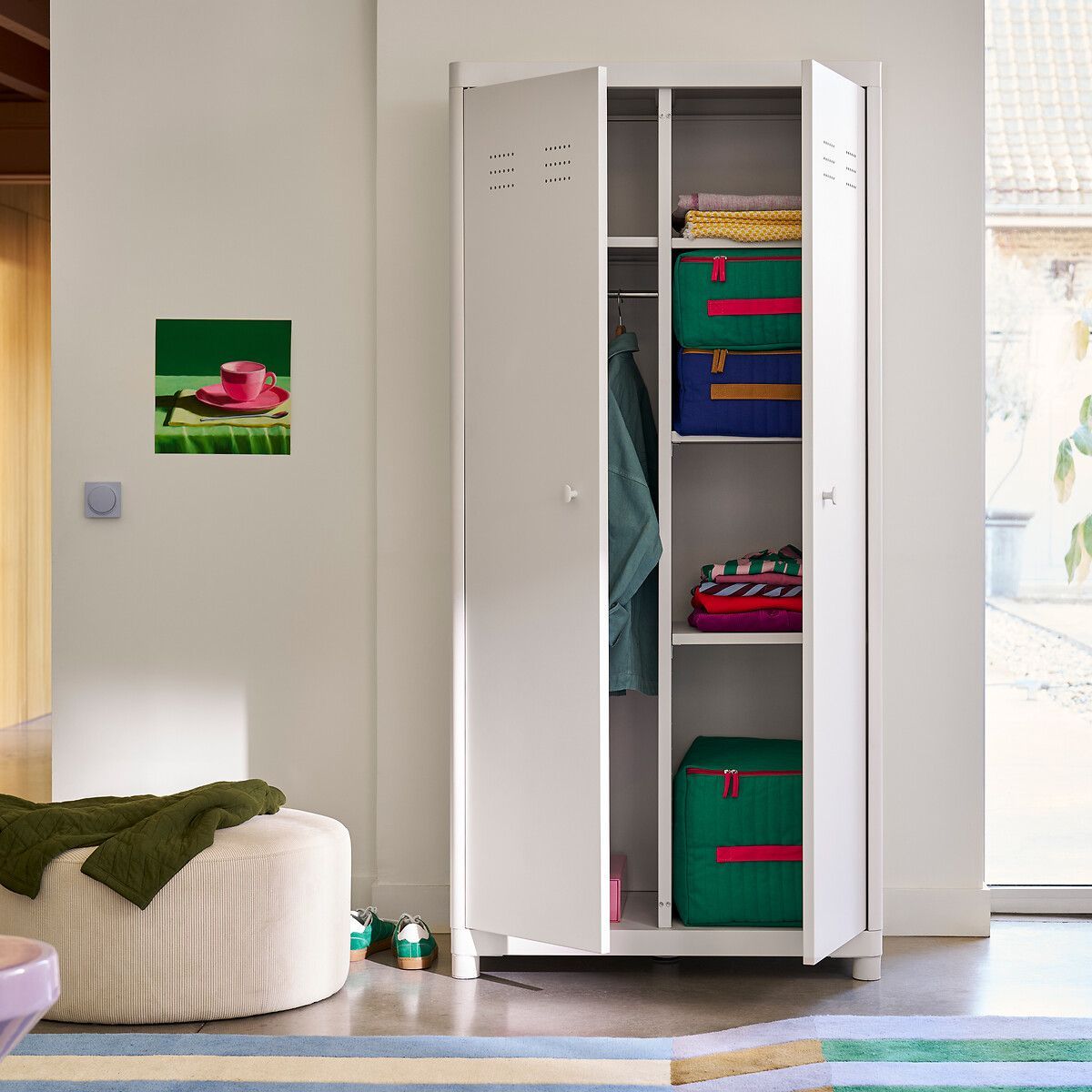 Полностью металлический шкаф Livona придаст современный штрих вашему интерьеру. Что касается хранения, слева у вас будет платяной шкаф с полкой. Справа — бельевой шкаф с тремя регулируемыми по высоте полками для оптимальной организации пространства. Творение La Redoute Intérieurs
