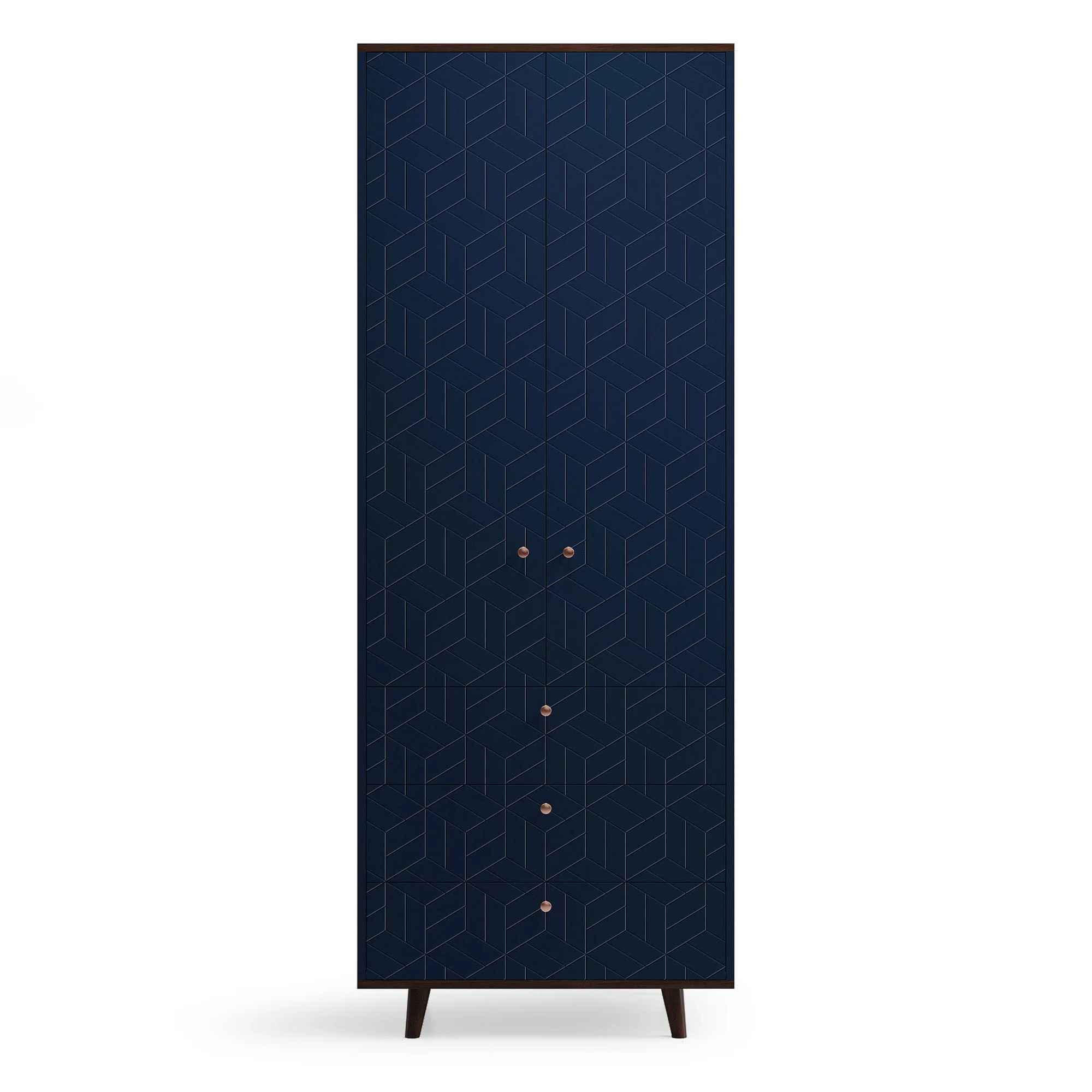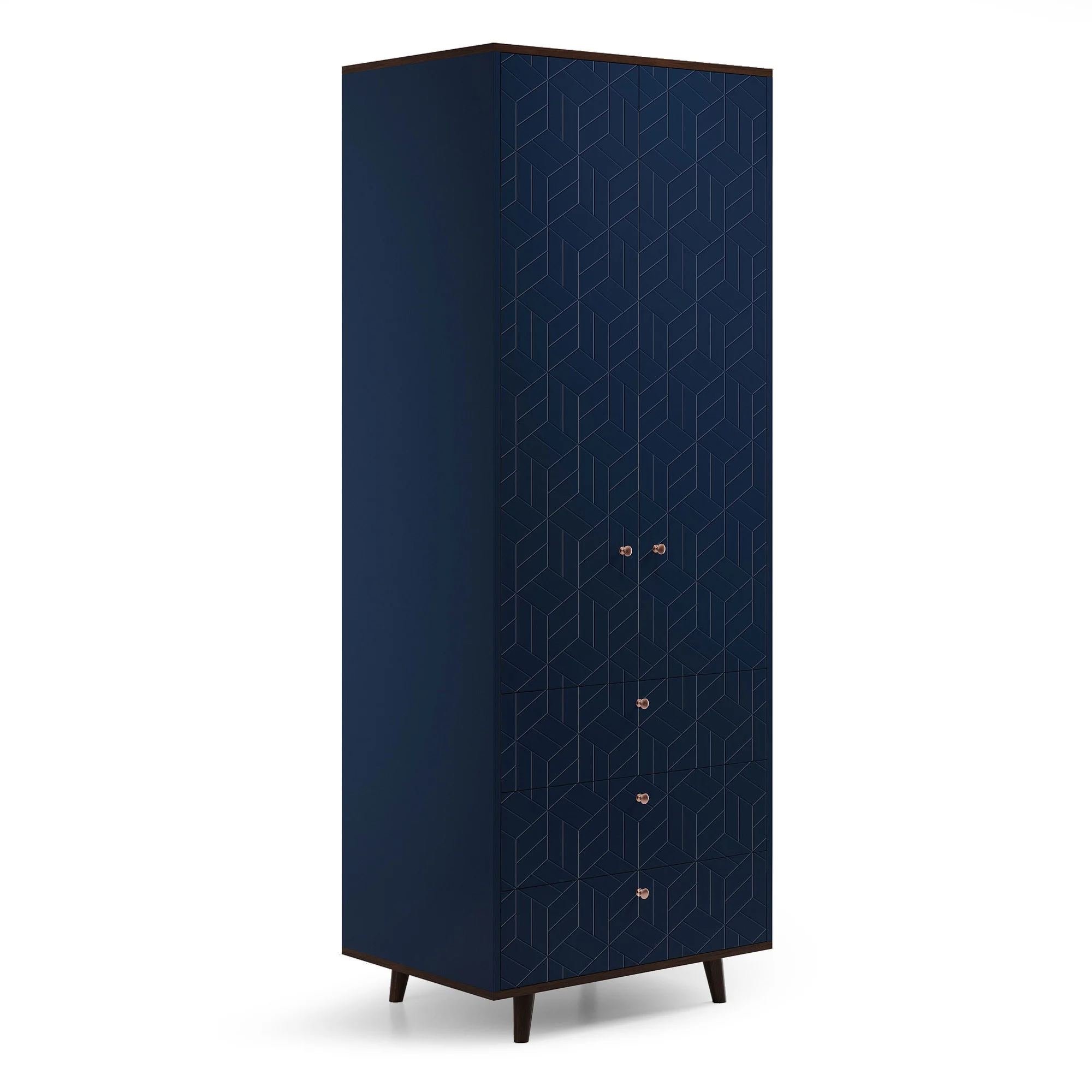 Верх и основание шкафа TWIN облицованы натуральным шпоном дуба, а ножки выполнены из массива дуба. Авторский узор гравировки на фасадах изделия выгодно подчёркивает его уникальность.