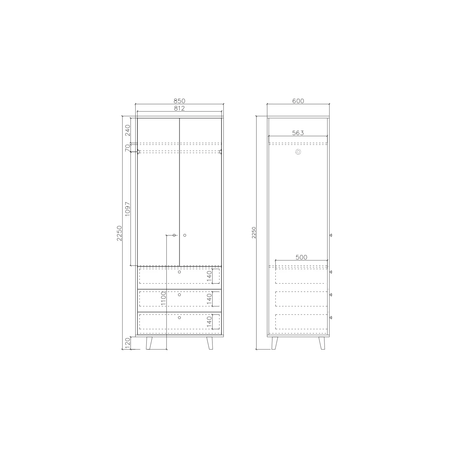 Данная модель шкафа подойдет для детской комнаты, узкой прихожей или маленькой спальни. Конструкция шкафа предусматривает две секции со штангами и полками, а также три вместительных ящика. При необходимости вы можете переставлять полки по высоте.
