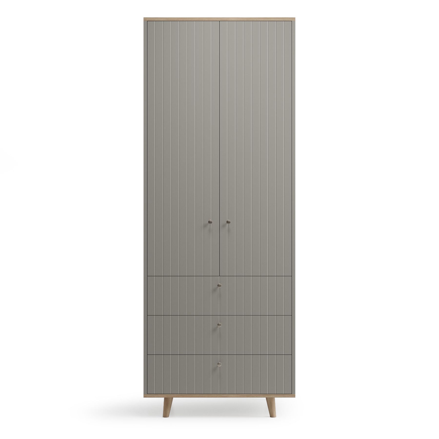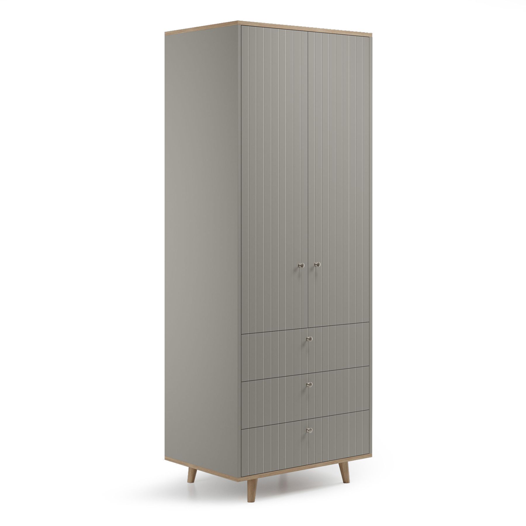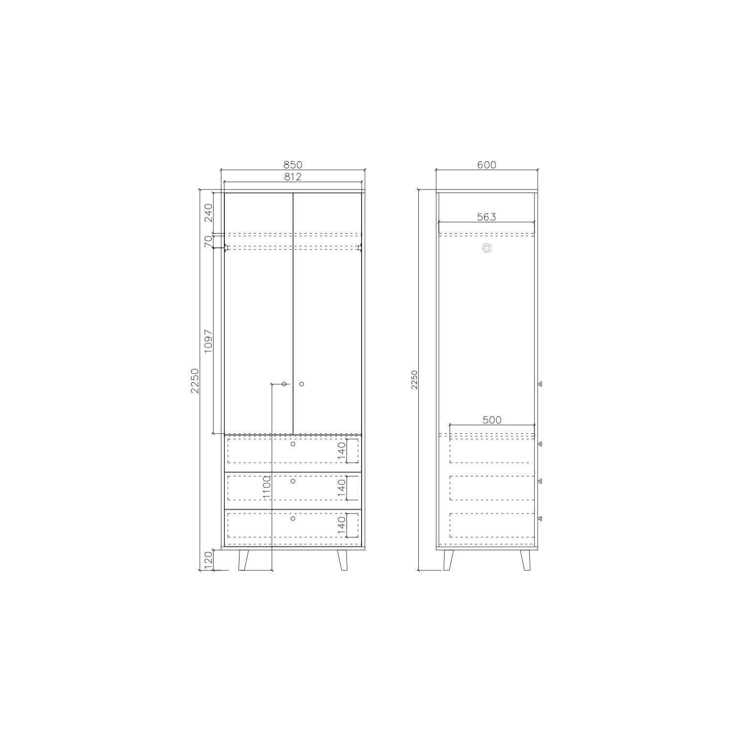 Данная модель шкафа подойдет для детской комнаты, узкой прихожей или маленькой спальни. Конструкция шкафа предусматривает две секции со штангами и полками, а также три вместительных ящика. При необходимости вы можете переставлять полки по высоте.