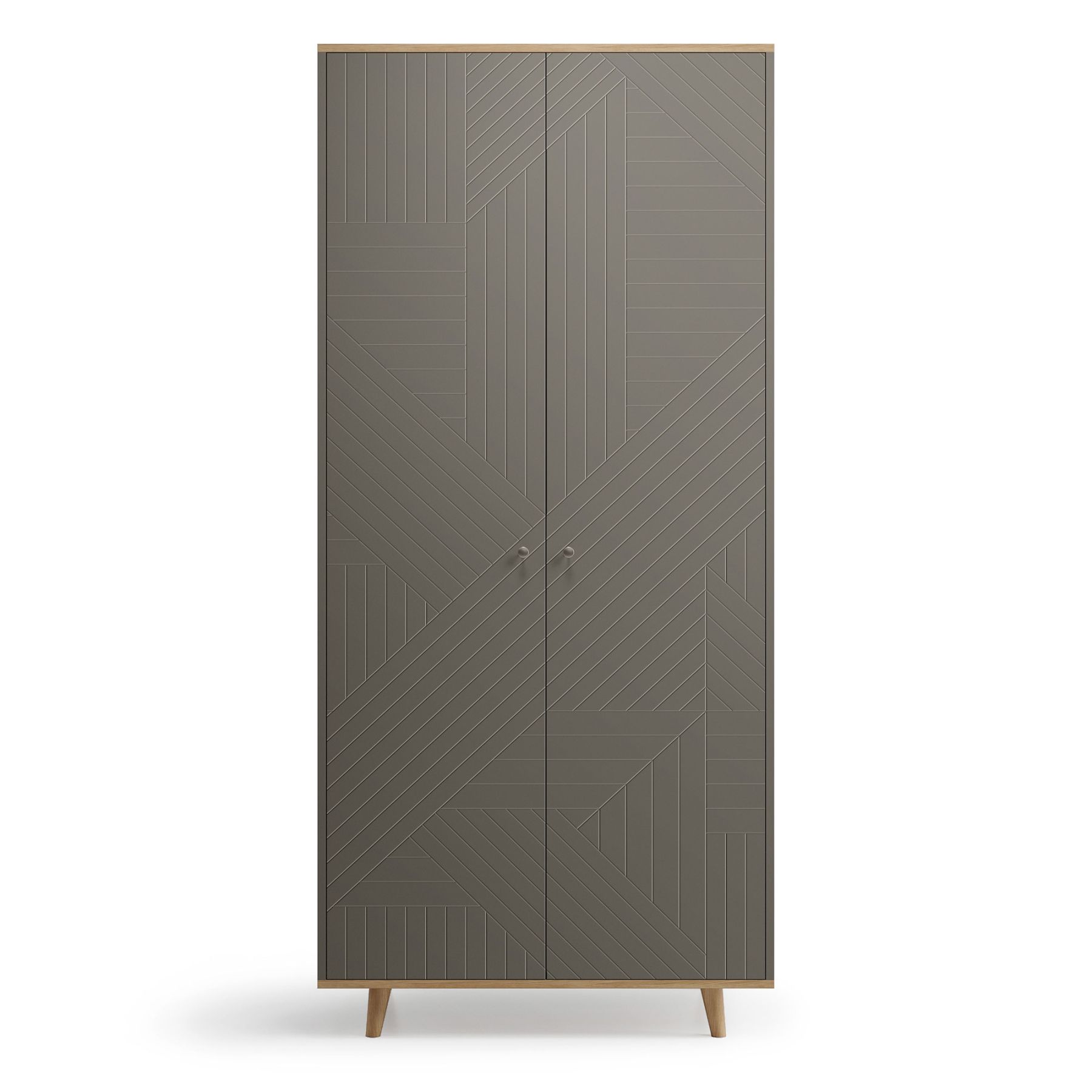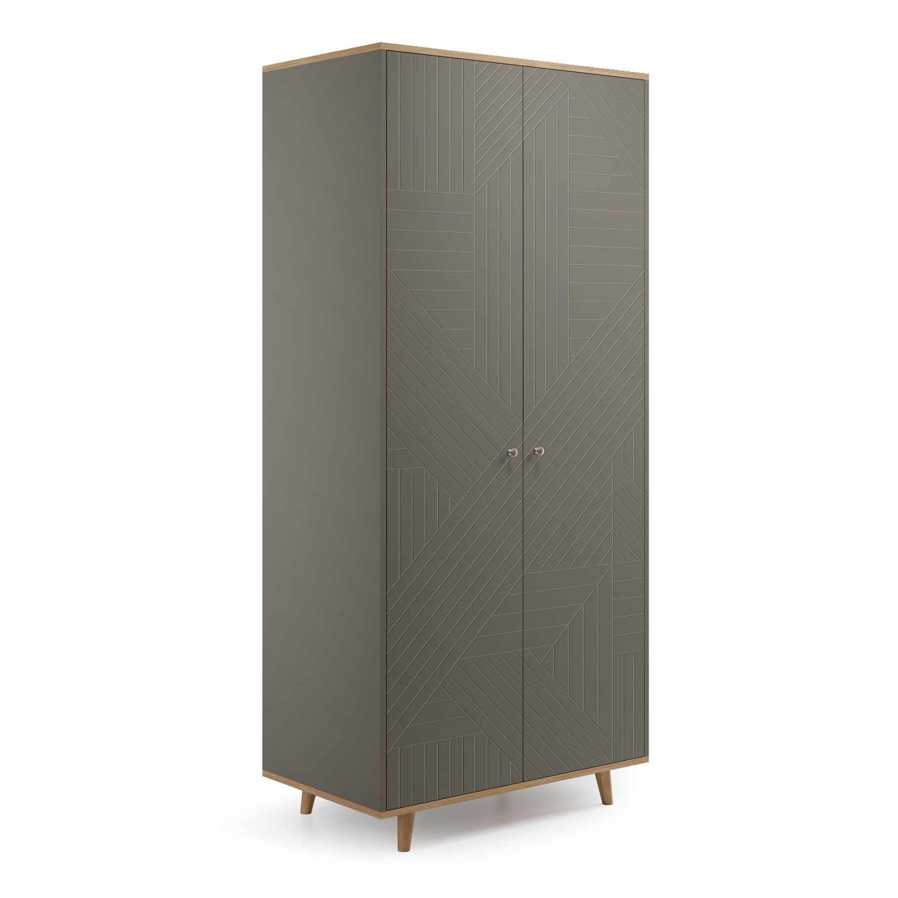 Верх и основание шкафа TWIN облицованы натуральным шпоном дуба, а ножки выполнены из массива дуба. Концептуальный узор гравировки на фасадах изделия выгодно подчеркивает его лаконичный дизайн.