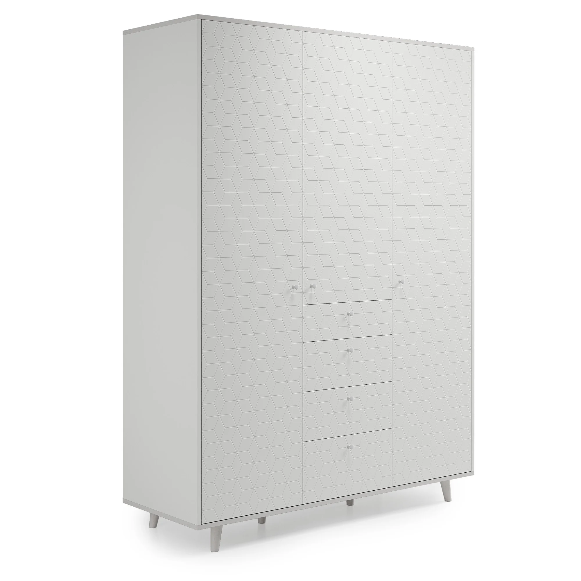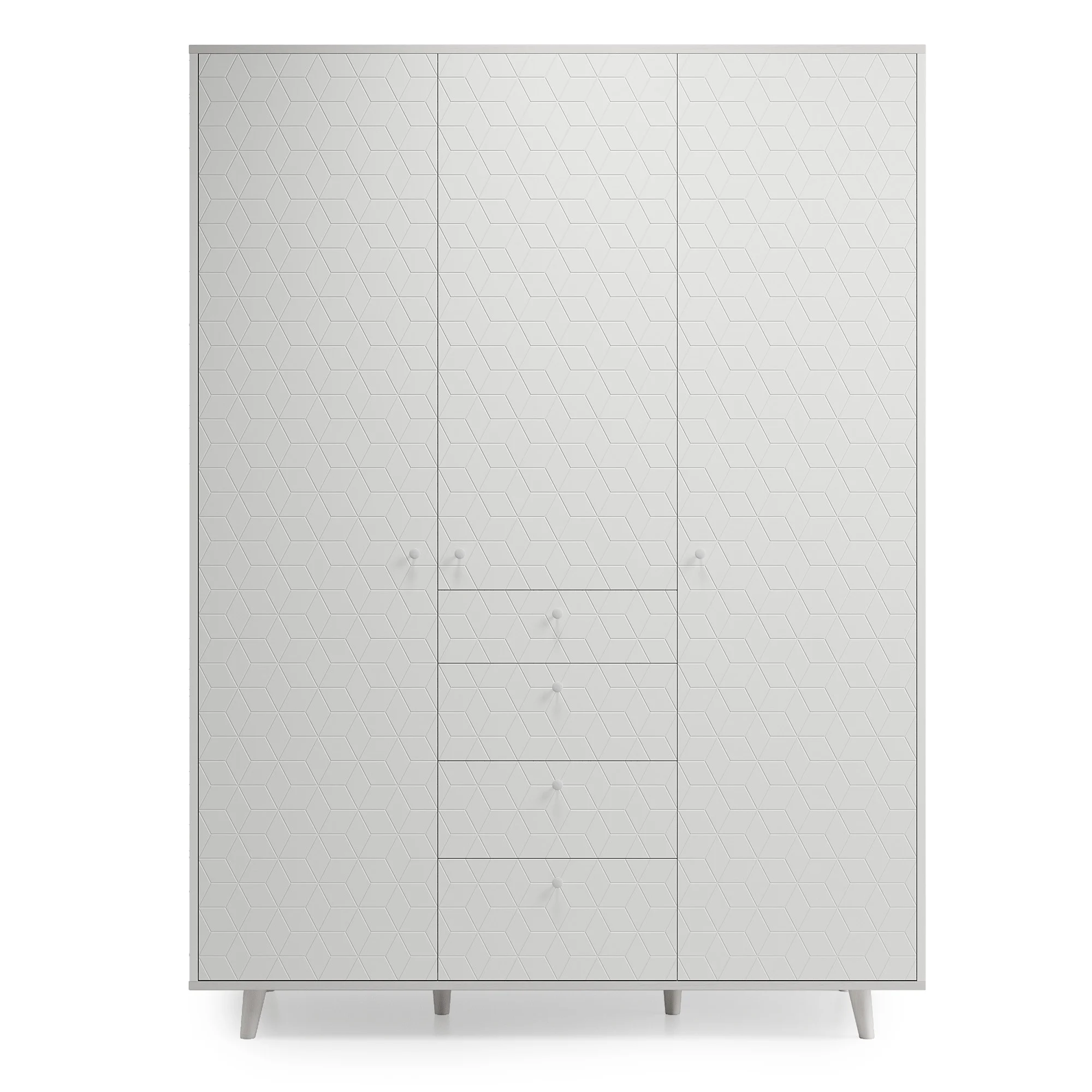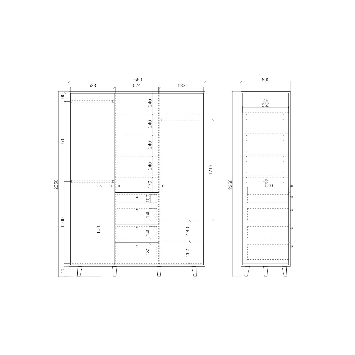 Один из самых вместительных шкафов в коллекции TWIN. Конструкция шкафа предусматривает две секции со штангами и полками, а также одну секцию по середине, которая состоит из полок, скрытых за фасадом, и ящиков. Кроме того, предусмотрены отверстия для регулировки высоты полок и штанг.