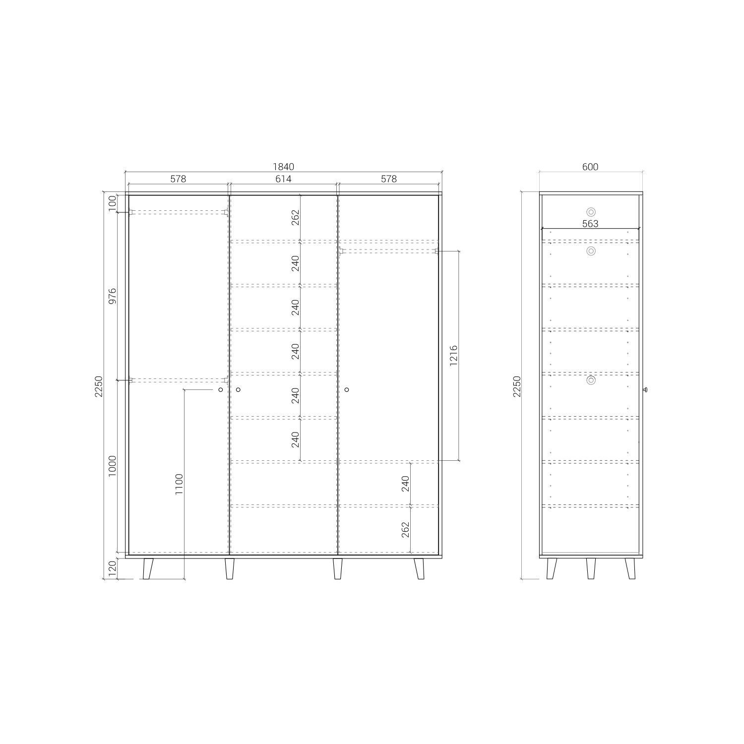 Шкаф объединяет в себе классическую форму, современный дизайн и эргономичность. Один из самых вместительных шкафов в коллекции TWIN. Конструкция шкафа предусматривает две секции со штангами и полками, а также одну секцию по середине, которая состоит только из полок. Кроме того, предусмотрены отверстия для регулировки высоты полок и штанг.