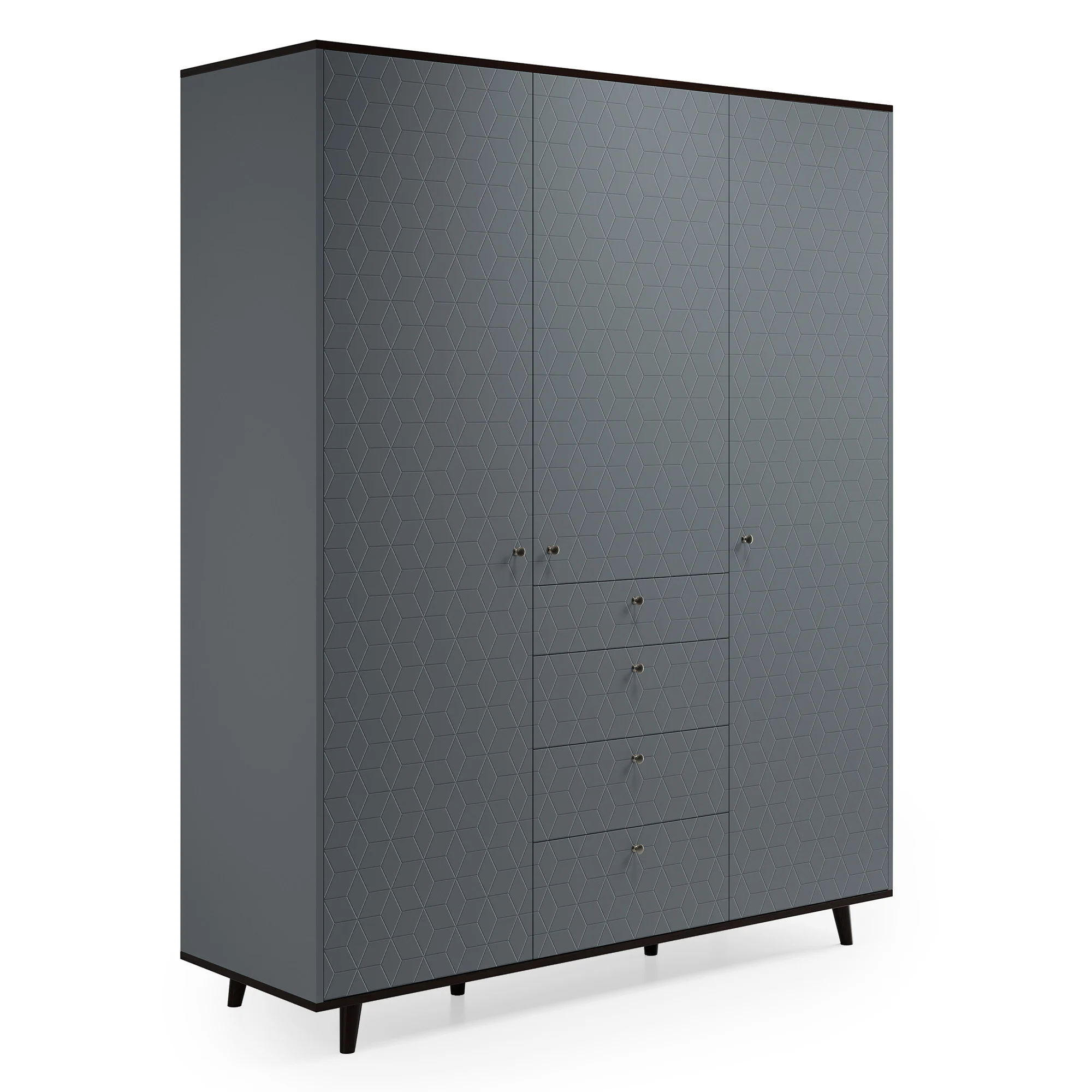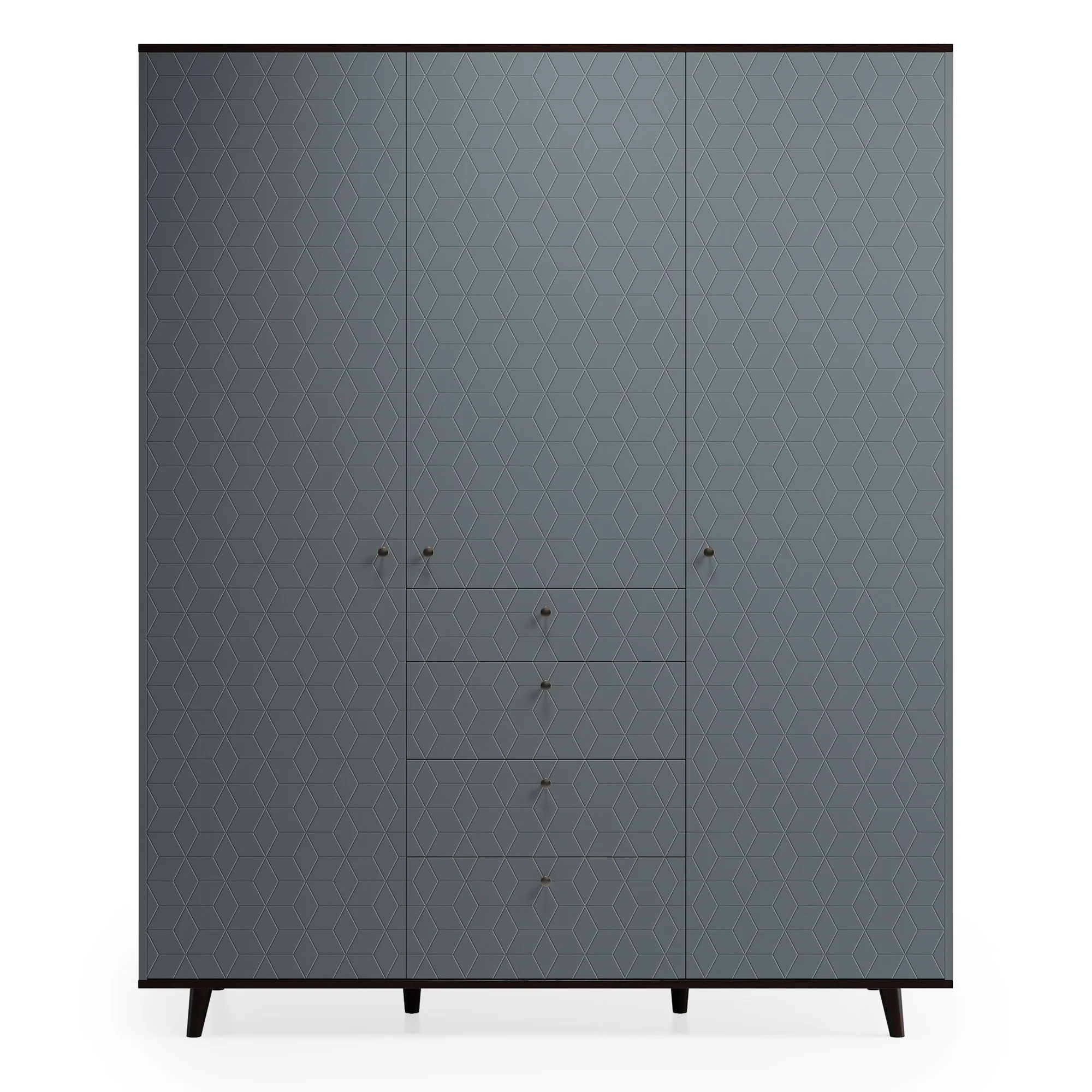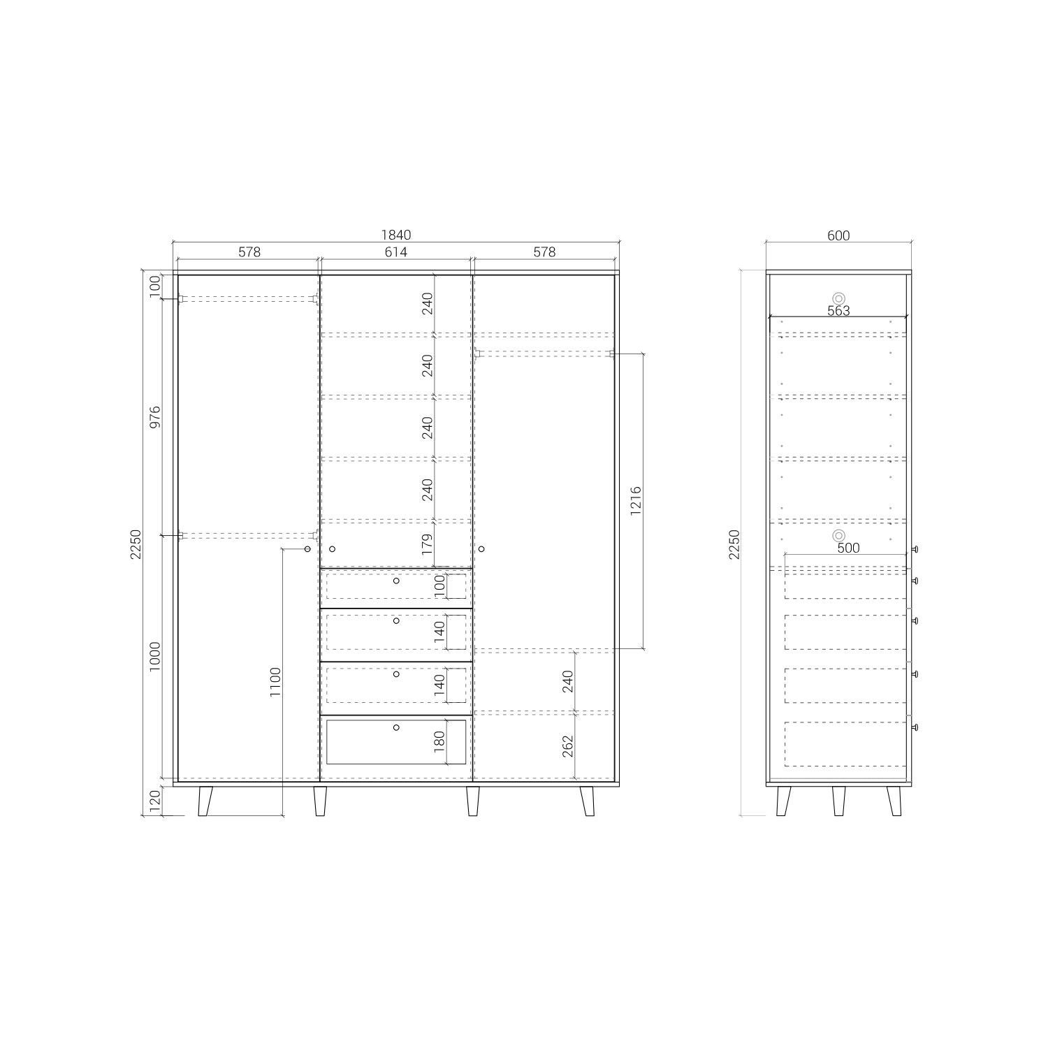 Один из самых вместительных шкафов в коллекции TWIN. Конструкция шкафа предусматривает две секции со штангами и полками, а также одну секцию по середине, которая состоит из полок, скрытых за фасадом, и ящиков. Кроме того, предусмотрены отверстия для регулировки высоты полок и штанг.