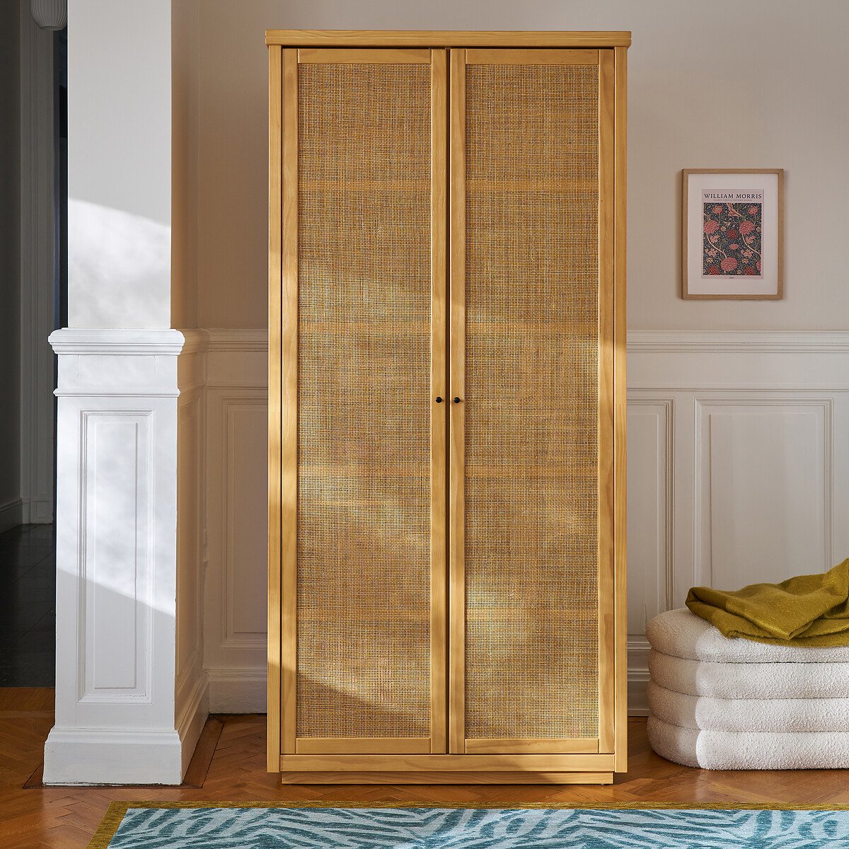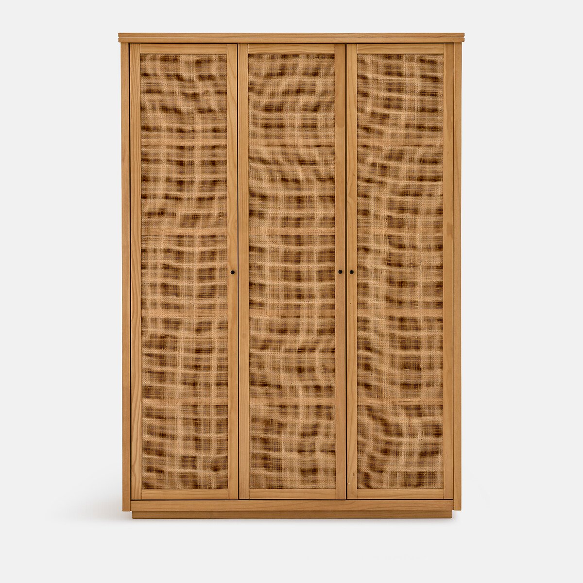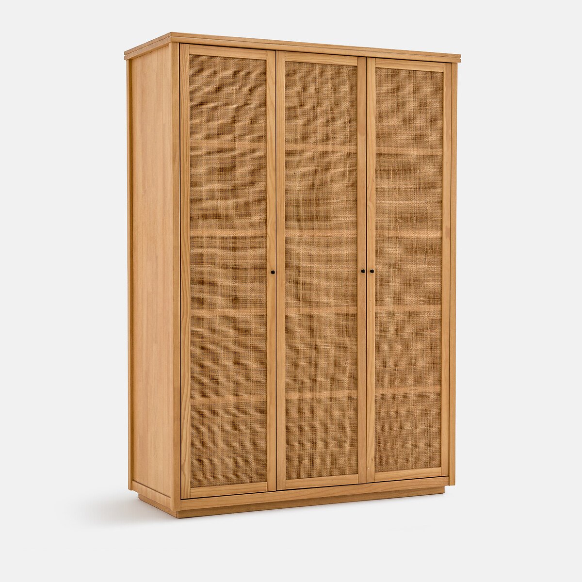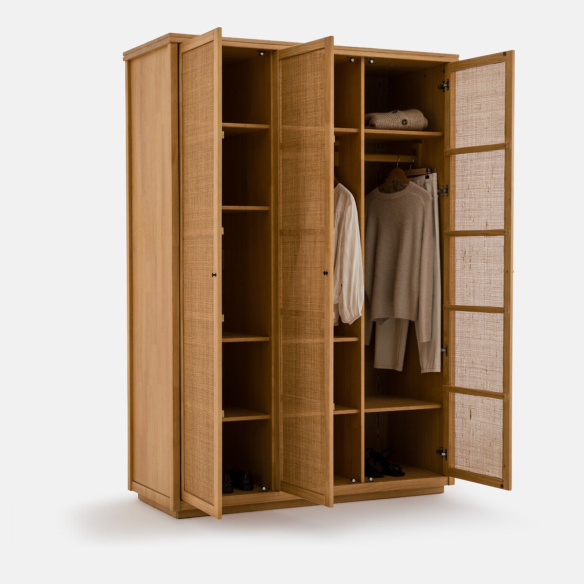 — Три дверцы: Левая дверца с 4 полками (2 фиксированные + 2 съемные), средняя дверца с подвесной штангой и 3 полками (2 фиксированные и 1 съемная), правая дверца с подвесной штангой и 2 фиксированными полками