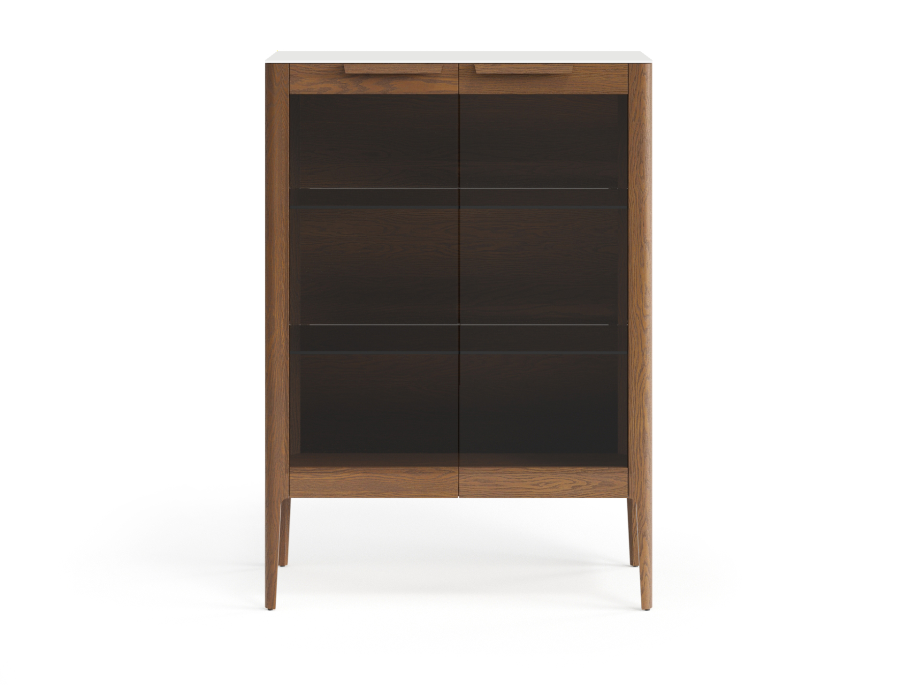 Ручки в форме крыла на фасадах подчёркивают элегантность изделия, благодаря удобному захвату пользование витриной становится максимально комфортным.