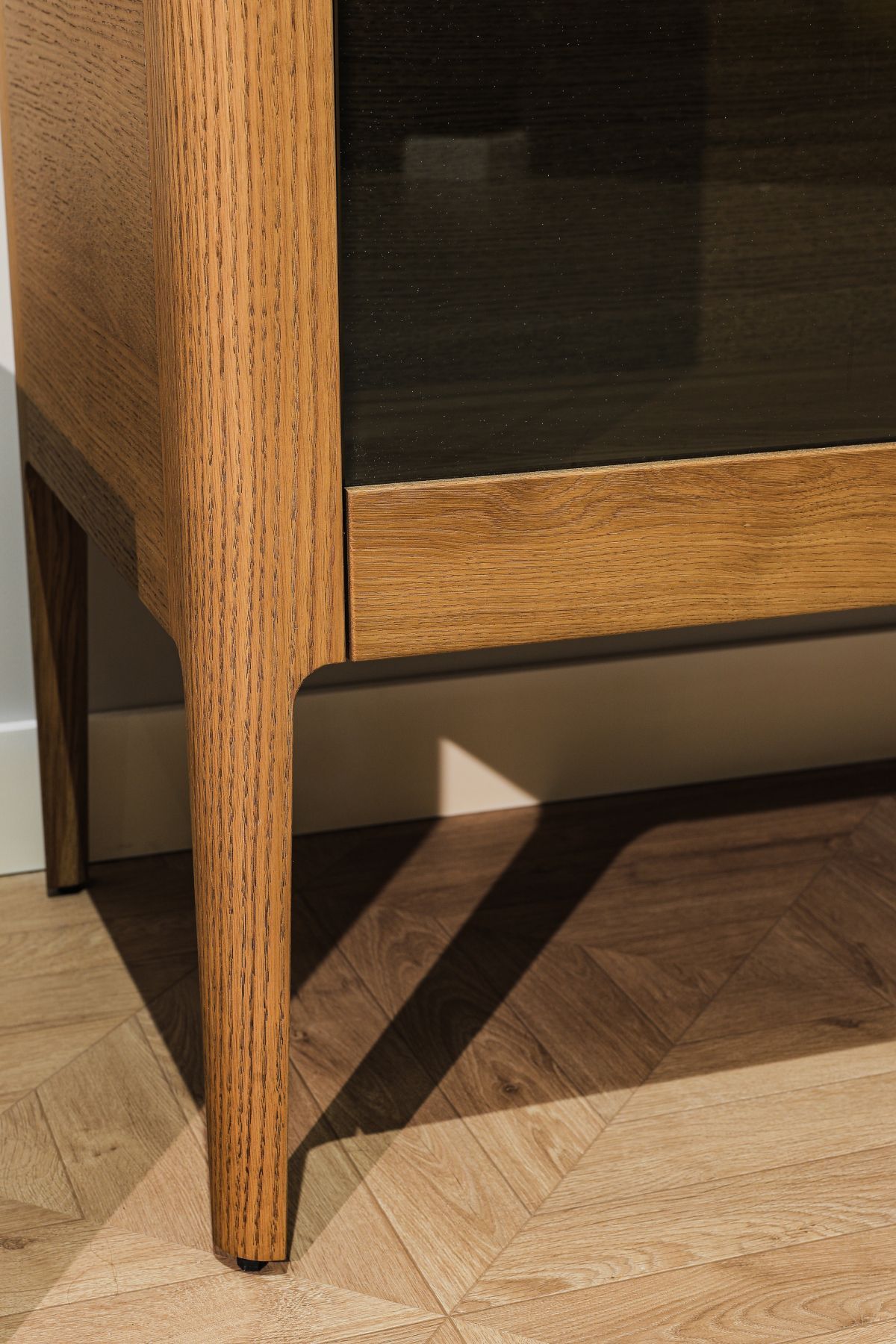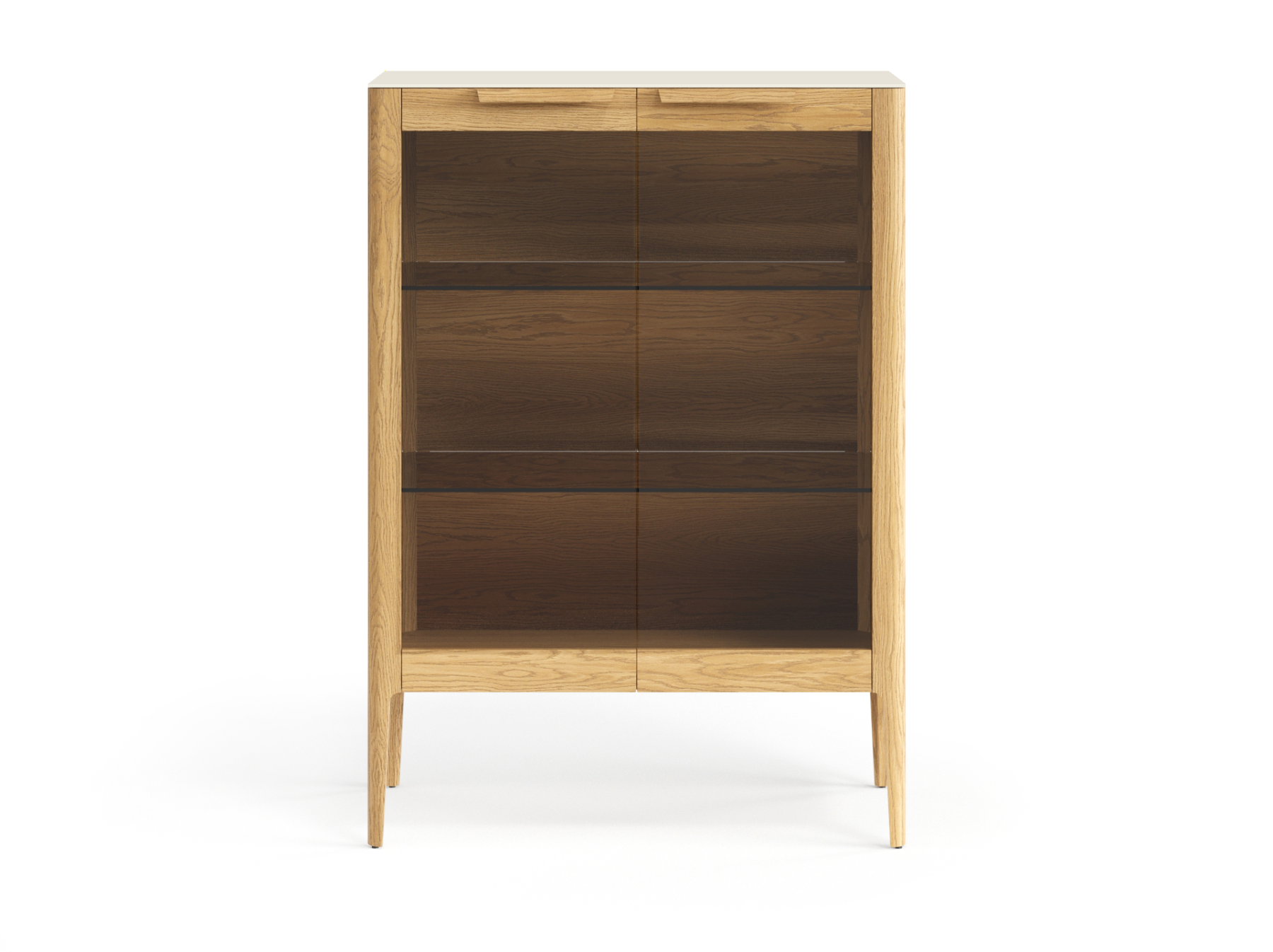 Ручки в форме крыла на фасадах подчёркивают элегантность изделия, благодаря удобному захвату пользование витриной становится максимально комфортным.
